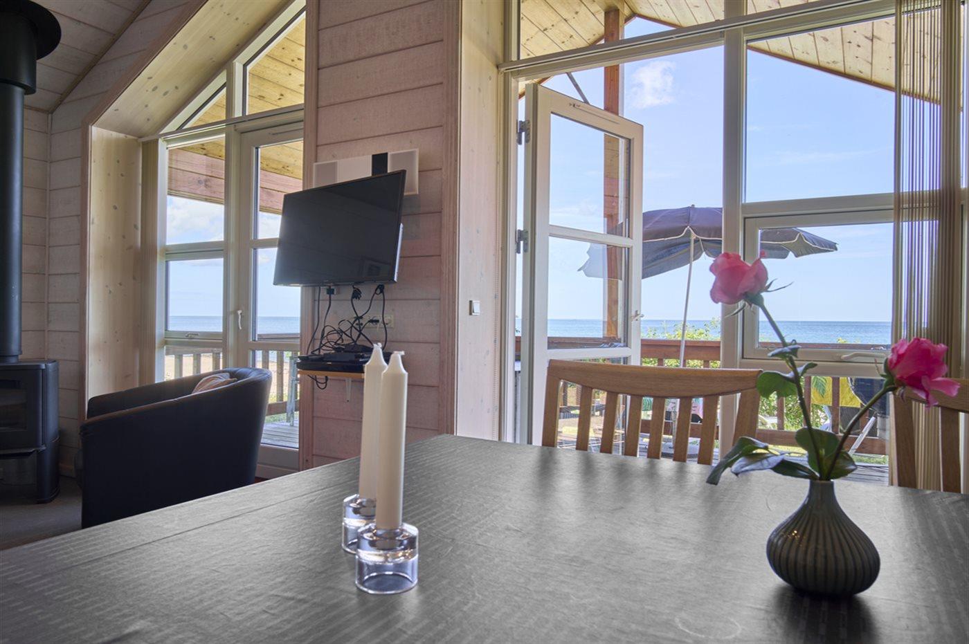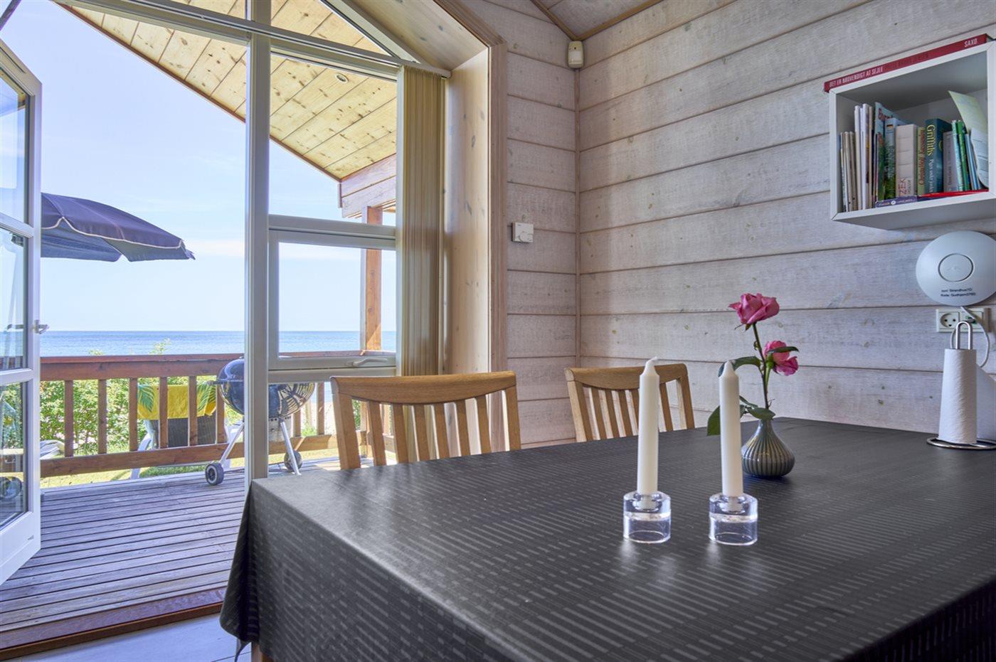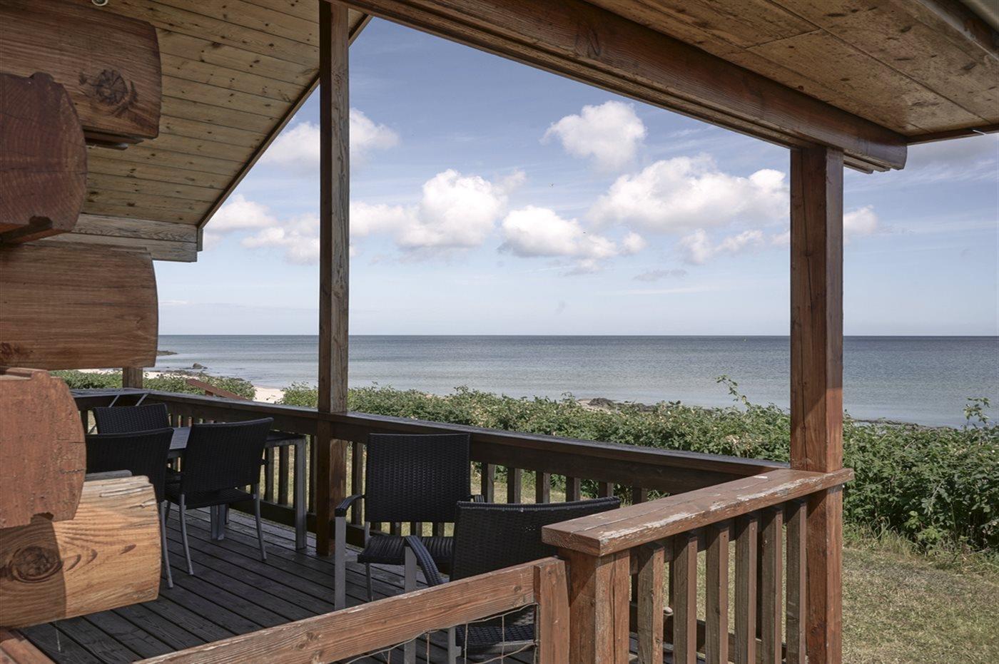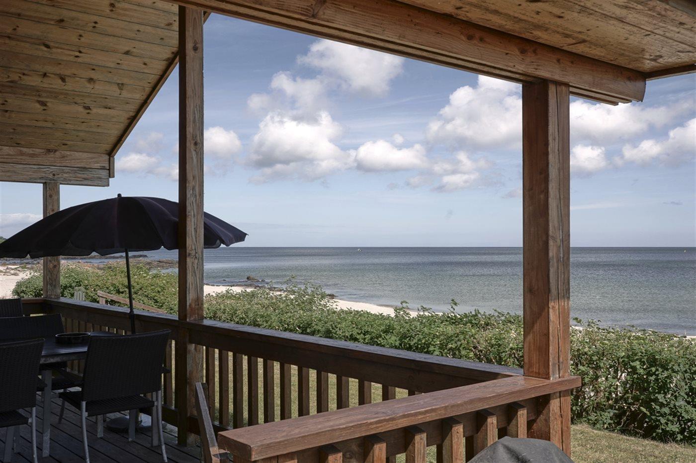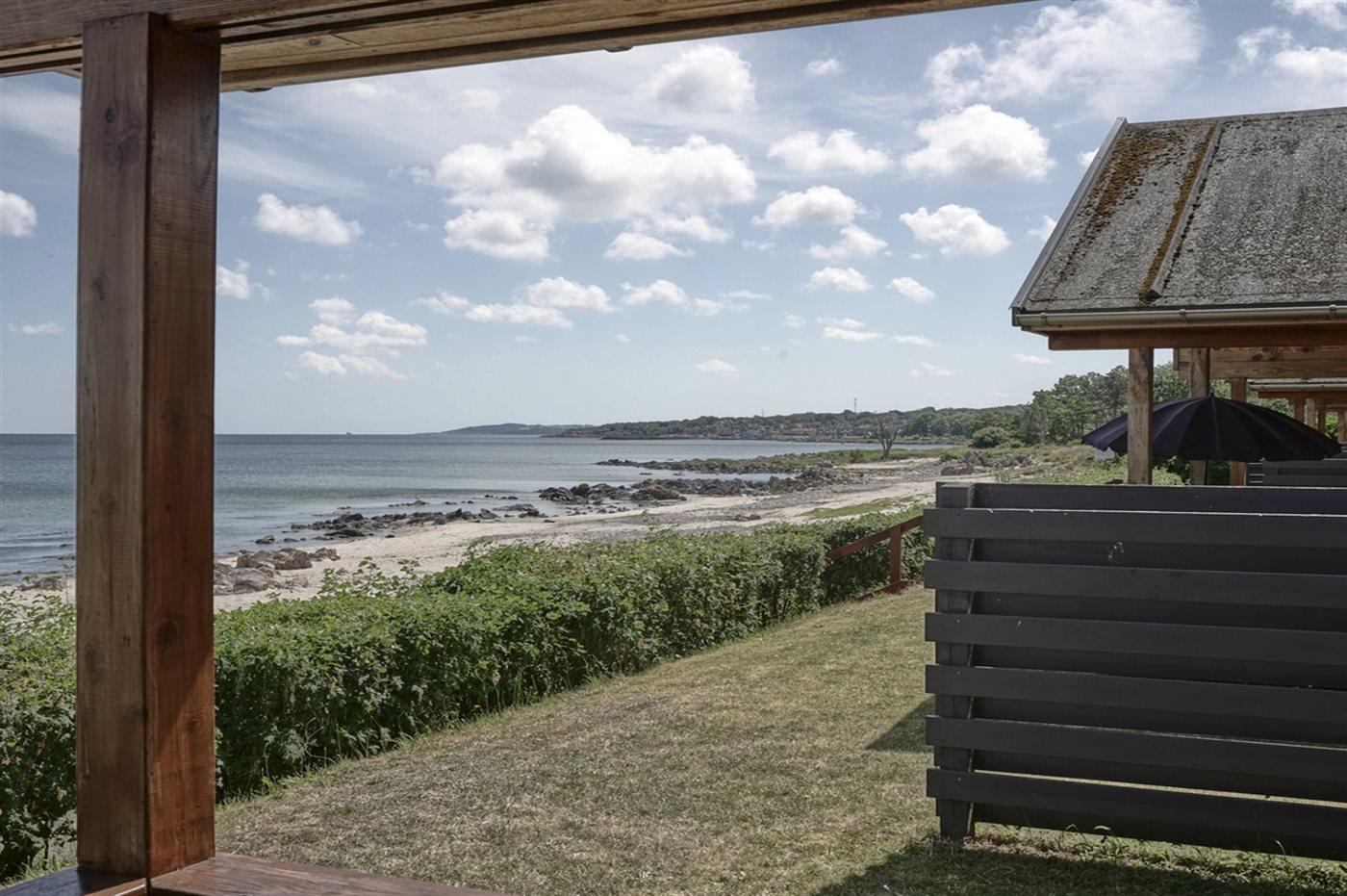 Dieses moderne Ferienhaus aus Holz liegt in erster Reihe zum Strand bei Sandkås - auf einem Strandgrundstück, nur ca. 10 Meter vom Meer entfernt. Sowohl vom Haus als auch vom Grundstück hast du Panoramablick über die Ostsee.