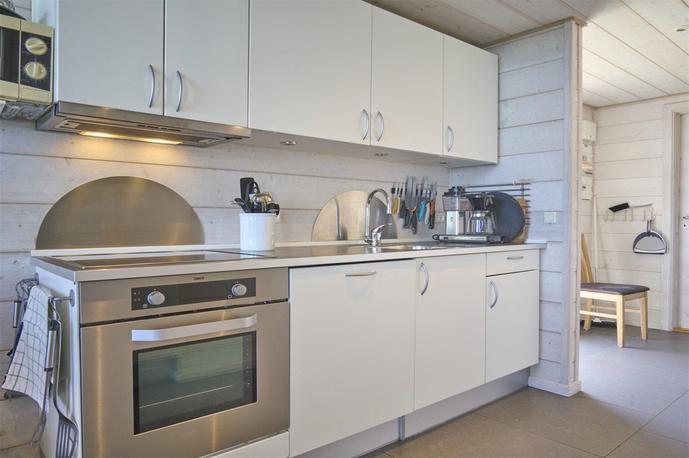 Das Ferienhaus ist gut gestaltet mit einer hellen und modernen Einrichtung. Die Küche ist mit dem Wohnzimmer kombiniert, von dem aus du auf die Terrasse mit Gartenmöbeln und Grill gelangst. In allen Räumen gibt es Fliesenböden und Fußbodenheizung.