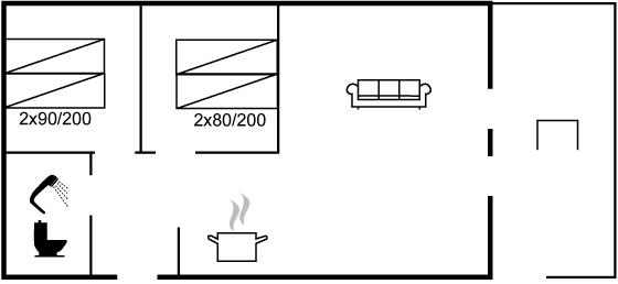 Die Schlafplätze verteilen sich auf 2 Schlafräume. 4 Schlafplätze in Doppelbetten. 2 Schlafplätze auf Matratzen. 2 von diesen Schlafplätzen befinden sich im offenen Obergeschoss.