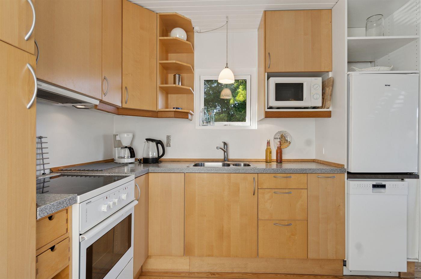 Die Küche ist mit Kühlschrank ausgestattet. Außerdem gibt es 4 Keramik-Kochfelder, Umluftofen, Mikrowelle sowie Geschirrspüler.