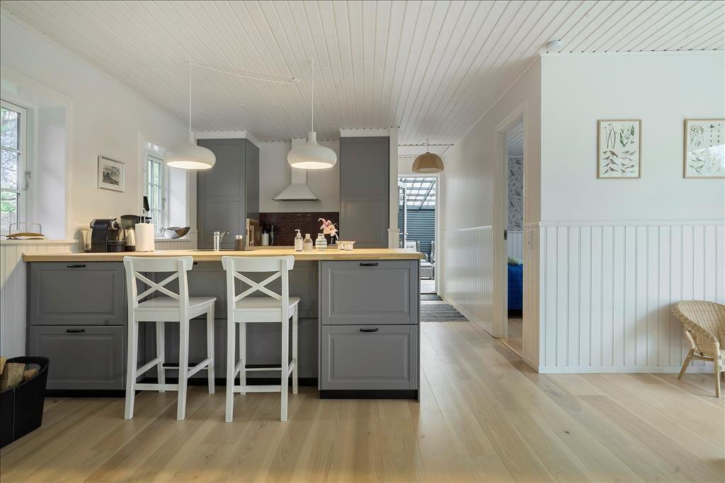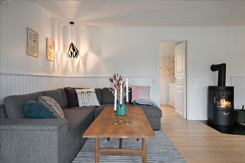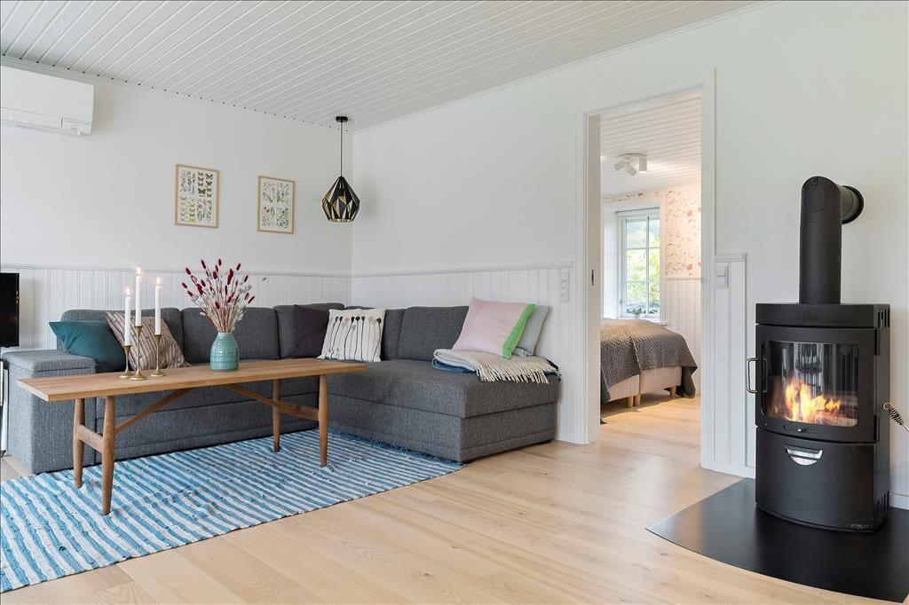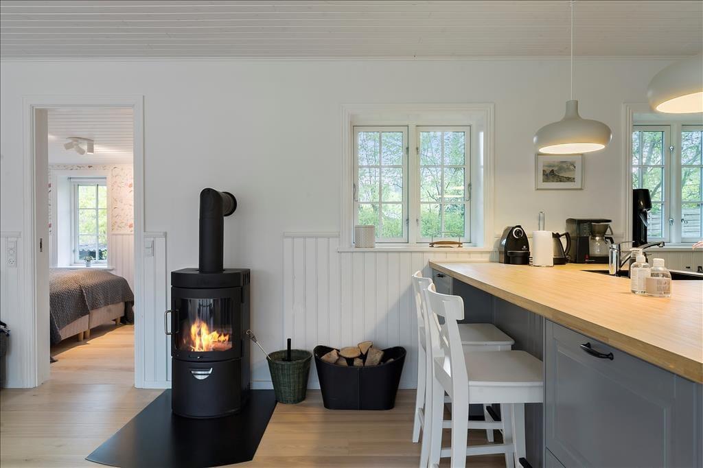 Wenn du über die gemütliche überdachte Terrasse eintrittst, empfängt dich eine helle und einladende Atmosphäre. Der Eingangsbereich führt direkt in einen offenen Küchen-Wohnbereich, in dem die Küche nahtlos in das Wohnzimmer übergeht. Hier kannst du köstliche Mahlzeiten zubereiten und gleichzeitig Teil der Gespräche im Wohnzimmer bleiben. Der Essbereich am Ausgang zur Terrasse ist der perfekte Ort, um den Morgenkaffee mit Blick auf den Garten zu genießen. Im Wohnzimmer lädt eine komfortable Sofagruppe zur Entspannung vor dem Kaminofen ein, der an kühlen Abenden Wärme und Gemütlichkeit verbreitet. Das Ferienhaus verfügt über zwei charmante Schlafzimmer, beide mit Doppelbetten ausgestattet, die einen erholsamen Schlaf gewährleisten. Das Badezimmer ist funktional mit Duschkabine und Waschmaschine eingerichtet, was die Bewältigung der alltäglichen Aufgaben erleichtert.