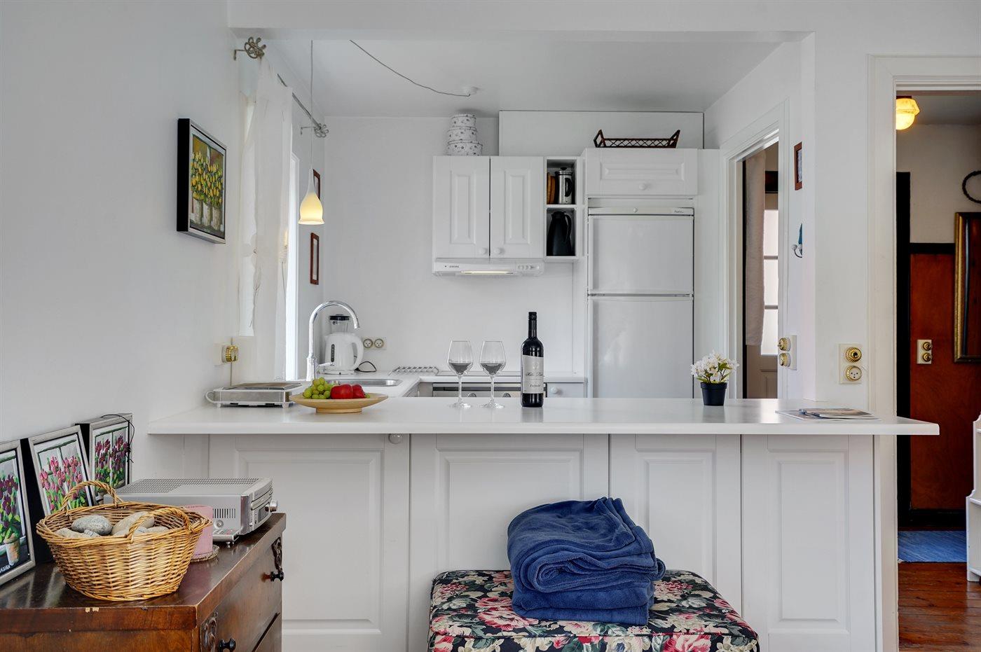 Die Küche ist mit Kühlschrank ausgestattet. Außerdem gibt es 4 Induktions-Kochzonen, Umluftofen sowie Geschirrspüler.