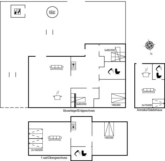 Das Ferienhaus verfügt über insgesamt 5 Schlafzimmer und 1 offenes Obergeschoss. Die Schlafplätze verteilen sich wie folgt: Im Haus gibt es 4 Schlafplätze in luxuriösen Doppelbetten, 6 Schlafplätze in Etagenbetten und 4 Schlafplätze auf einer Schlafcouch (Doppelbett). Im Gästehaus gibt es 2 Schlafplätze auf luxuriösen Matratzen im offenen Obergeschoss (über eine stabile Treppe erreichbar) und 2 Schlafplätze auf einer Schlafcouch.