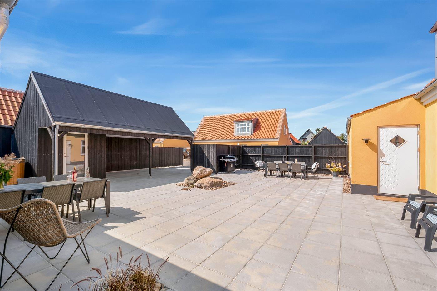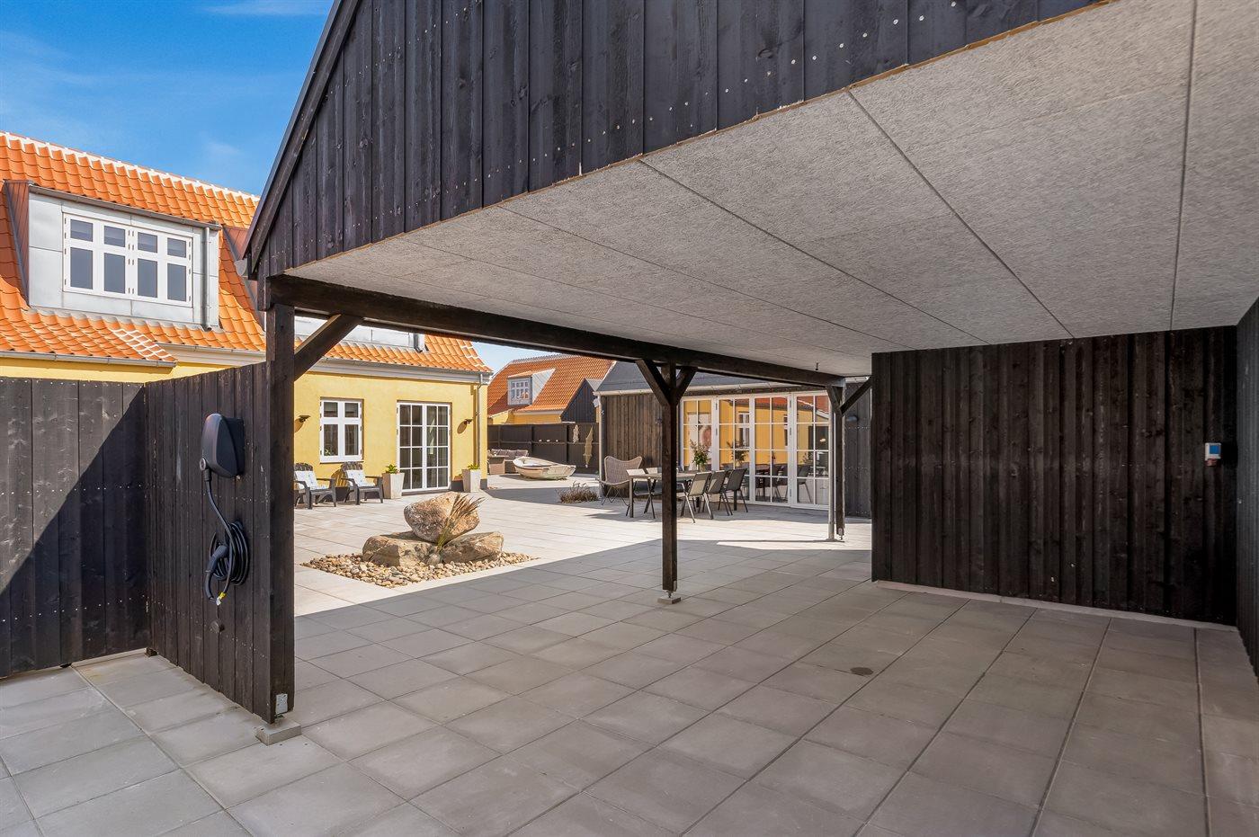 Draußen gibt es sowohl einen offenen Terrassenbereich als auch eine Ecke mit Sofaarrangement sowie einen Wellnessbereich mit Außensauna, 8-Pers.-Whirlpool mit Standwasser und Warmwasserdusche. Im Geräteraum gibt es bequeme Auflagen für die Gartenmöbel. Ein schöner Gasgrill steht zur Verfügung. Es gibt einen großen Carport mit Platz für insgesamt drei Autos. Es ist ein Anschluss zum kostenlosen Laden von Elektroautos, mit 11 kW Ladeleistung, installiert.