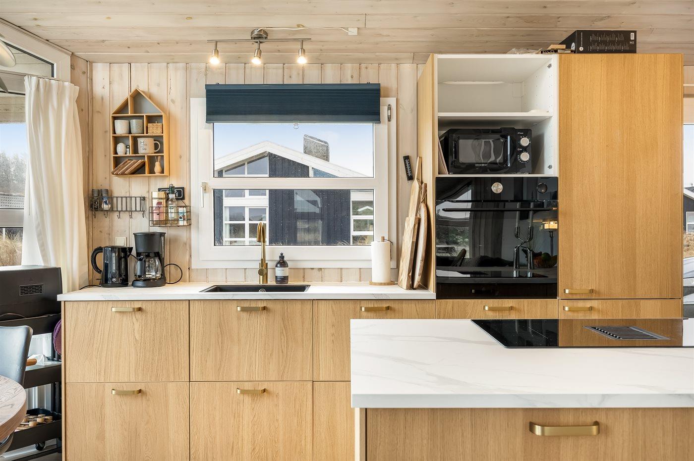 Die Küche ist mit Kühlschrank ausgestattet. Außerdem gibt es 4 Keramik-Kochfelder, Umluftofen sowie Geschirrspüler.