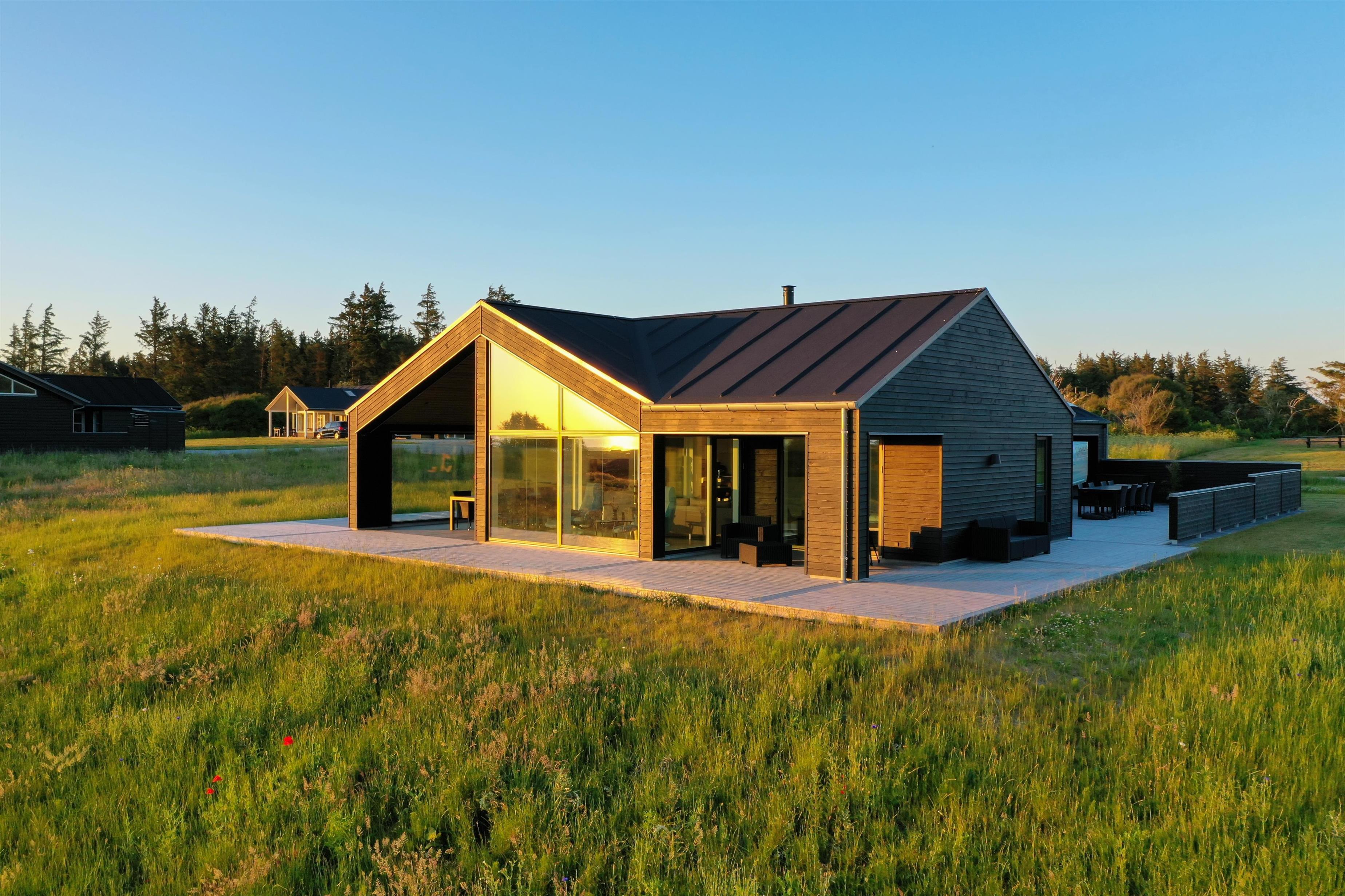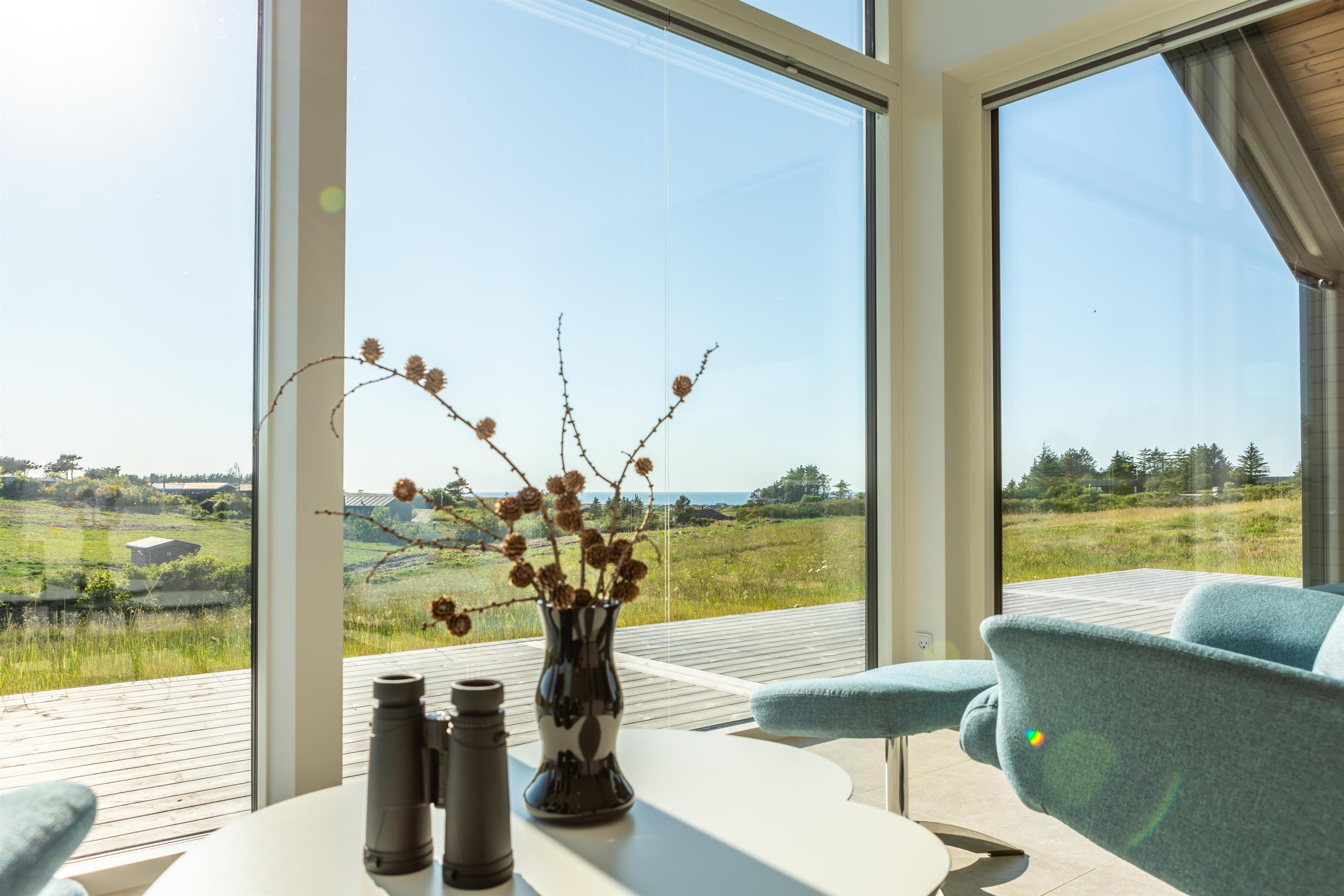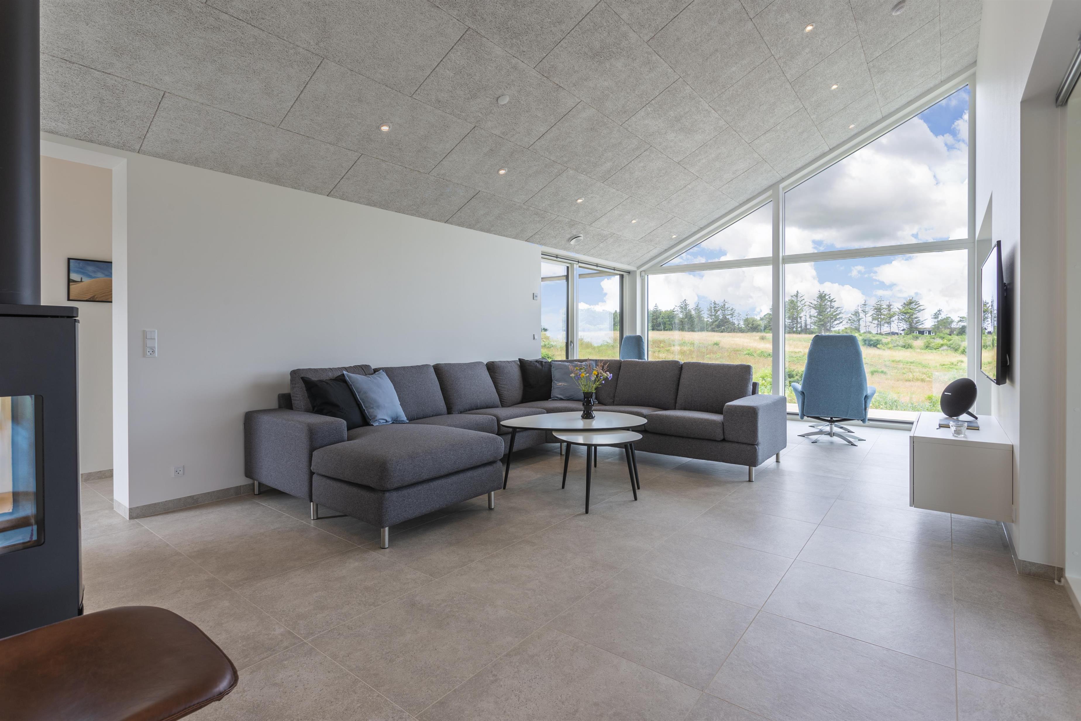 Dieses große, moderne Ferienhaus gehört zur Kategorie der hochwertigen Häuser, bei denen nur die besten Materialien verwendet wurden. Die hohen Decken und die großen Fensterfronten lassen viel Licht und die umliegende Natur herein. Der große, offene Wohnbereich, der Essplatz, Wohnzimmer und Küche miteinander verbindet, dient als zentraler Ort des Hauses, an dem ihr wertvolle Zeit mit Familie und Freunden verbringen könnt. Der gemütliche Wohnbereich mit Kamin lädt ebenfalls zu gemeinsamen Momenten ein. Von hier gelangt ihr direkt auf die große, überdachte Terrasse, die zu jeder Jahreszeit einen Platz an der frischen Luft bietet – mit einer atemberaubenden Aussicht.
