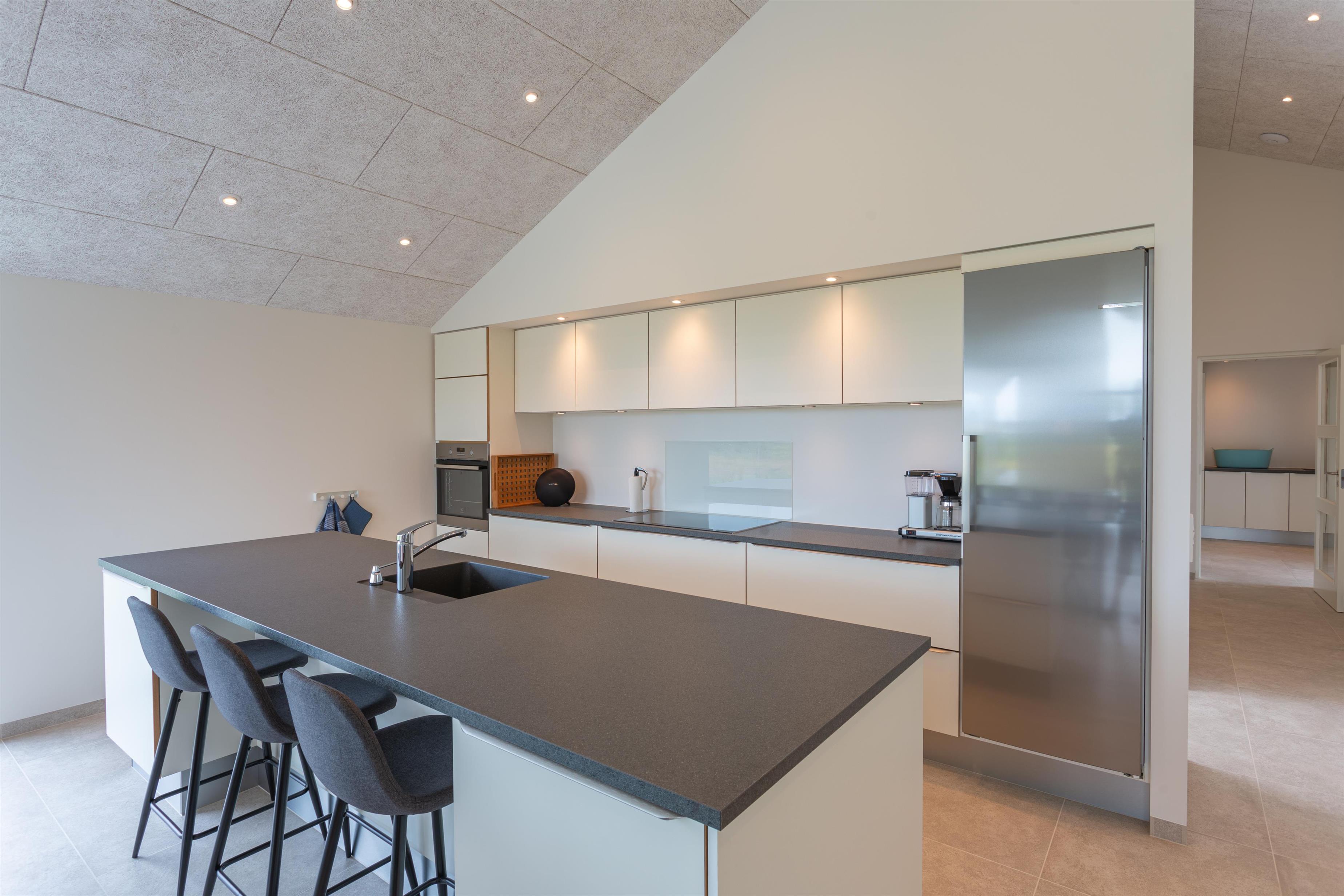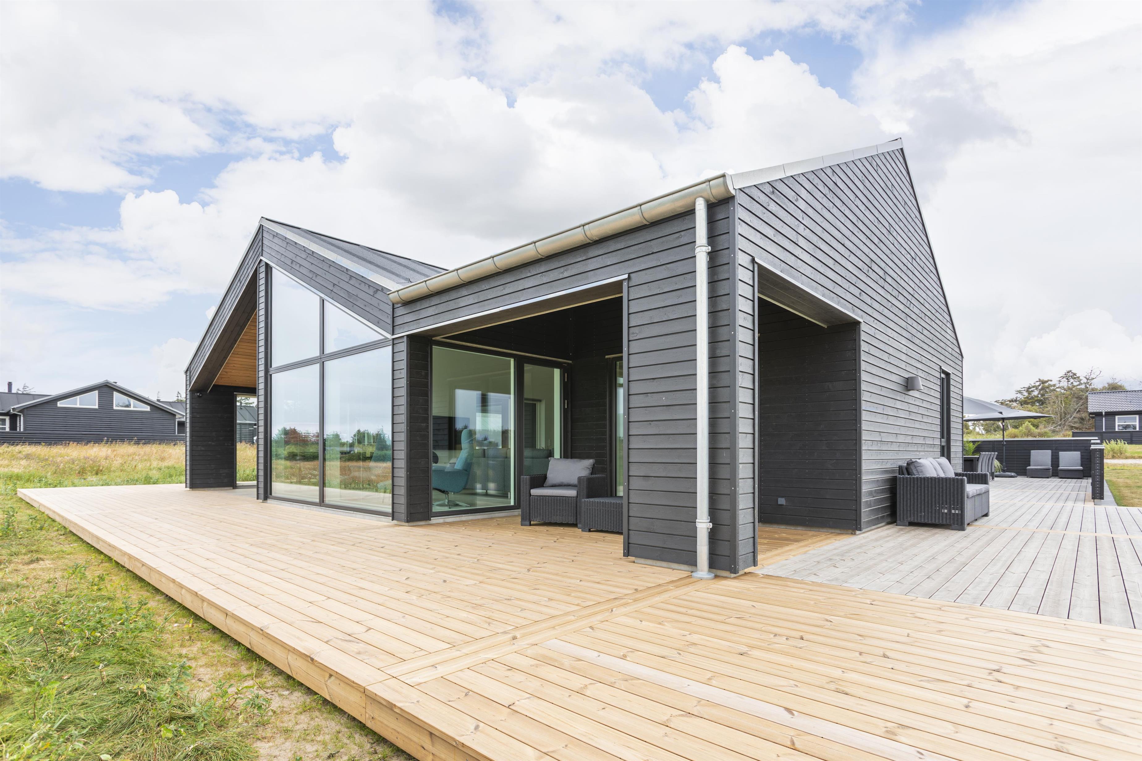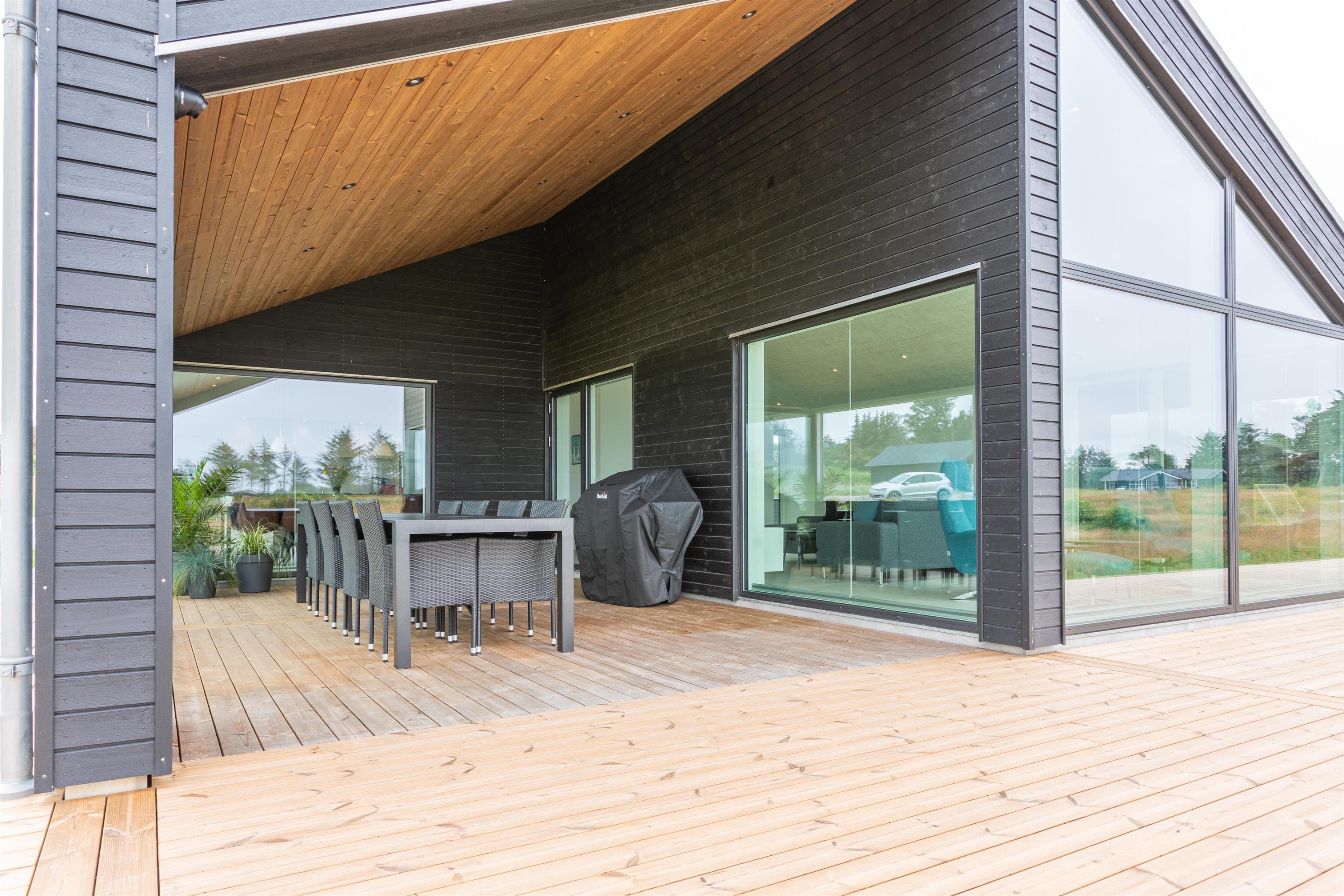 Dieses große, moderne Ferienhaus gehört zur Kategorie der hochwertigen Häuser, bei denen nur die besten Materialien verwendet wurden. Die hohen Decken und die großen Fensterfronten lassen viel Licht und die umliegende Natur herein. Der große, offene Wohnbereich, der Essplatz, Wohnzimmer und Küche miteinander verbindet, dient als zentraler Ort des Hauses, an dem ihr wertvolle Zeit mit Familie und Freunden verbringen könnt. Der gemütliche Wohnbereich mit Kamin lädt ebenfalls zu gemeinsamen Momenten ein. Von hier gelangt ihr direkt auf die große, überdachte Terrasse, die zu jeder Jahreszeit einen Platz an der frischen Luft bietet – mit einer atemberaubenden Aussicht.