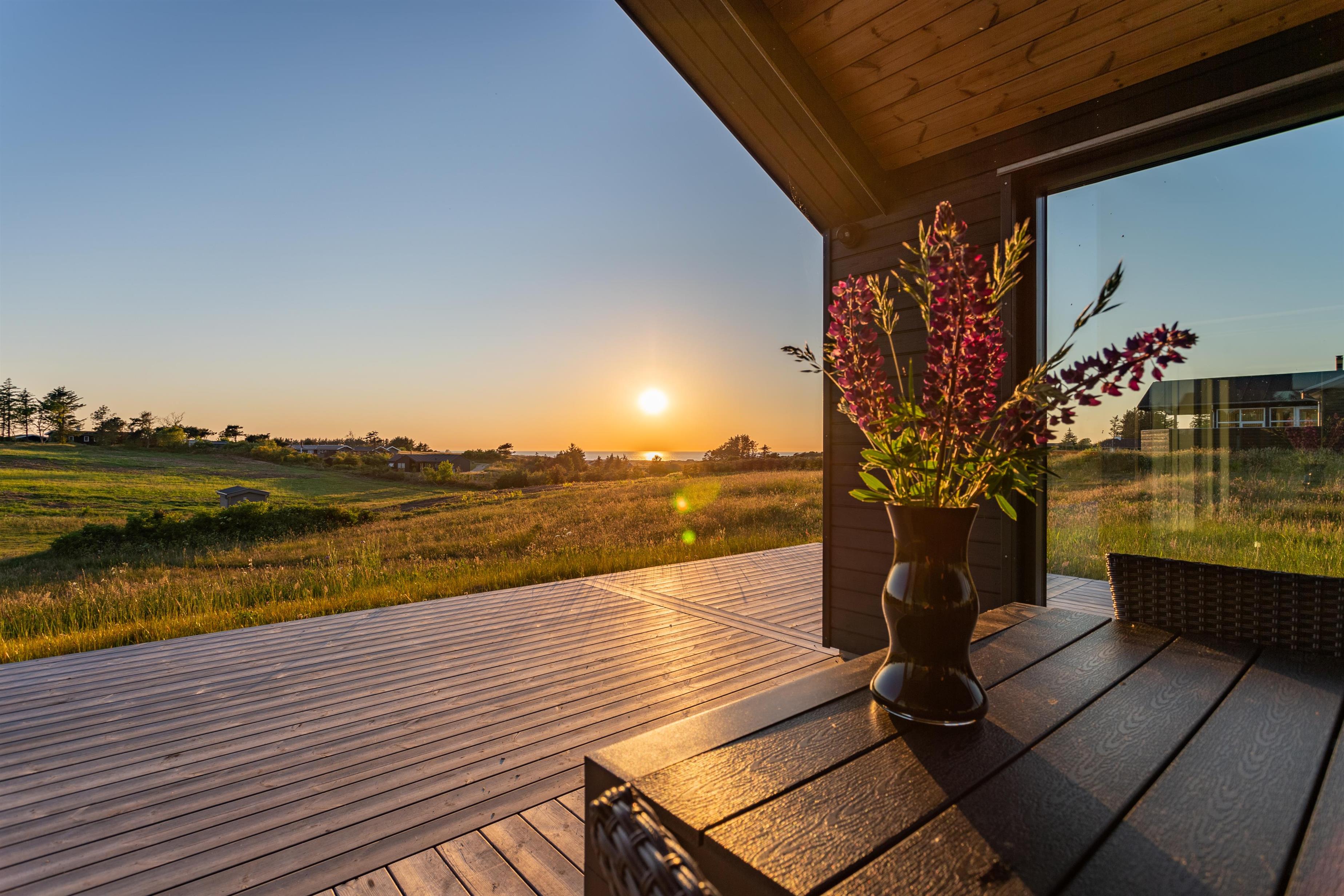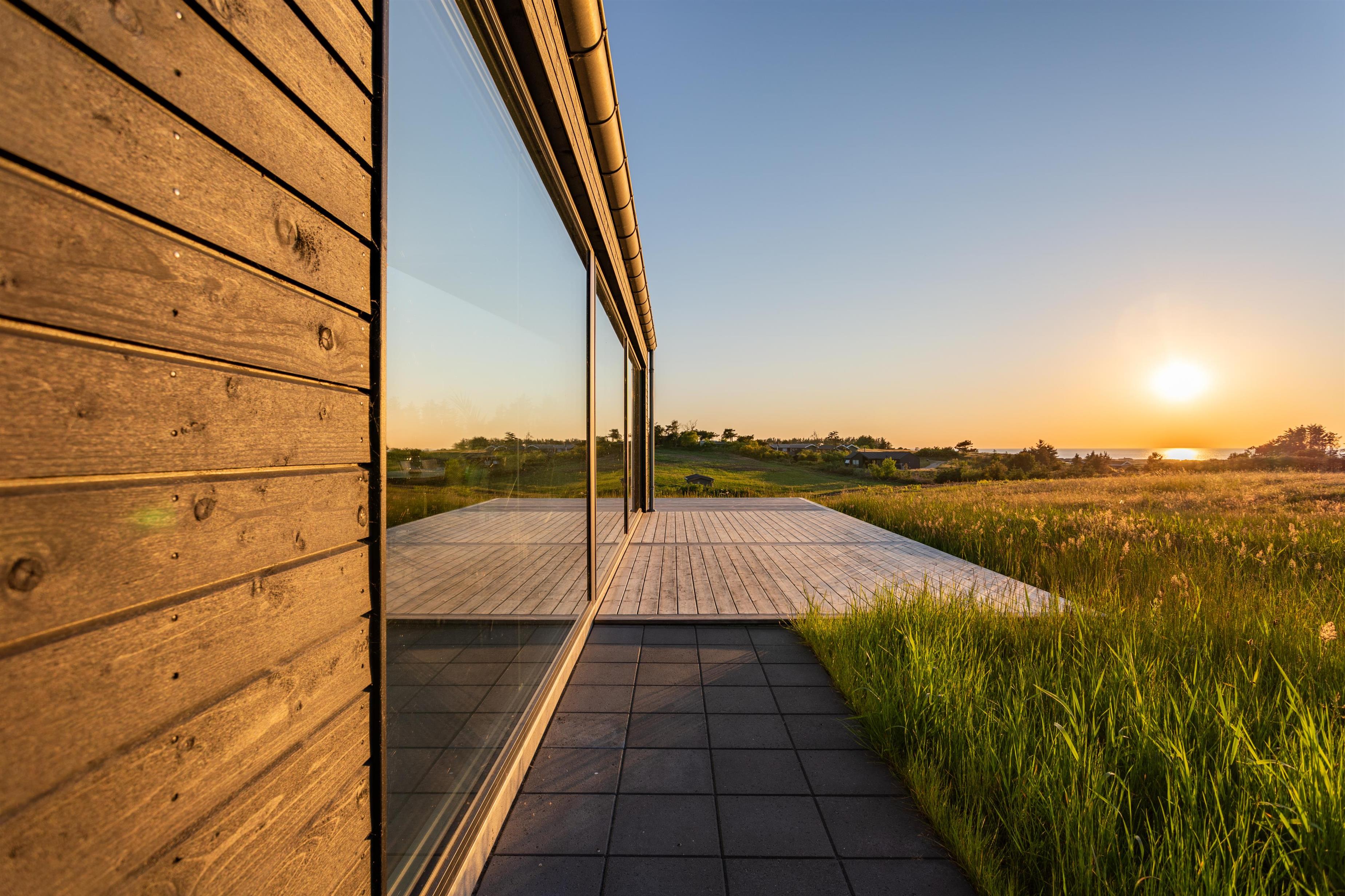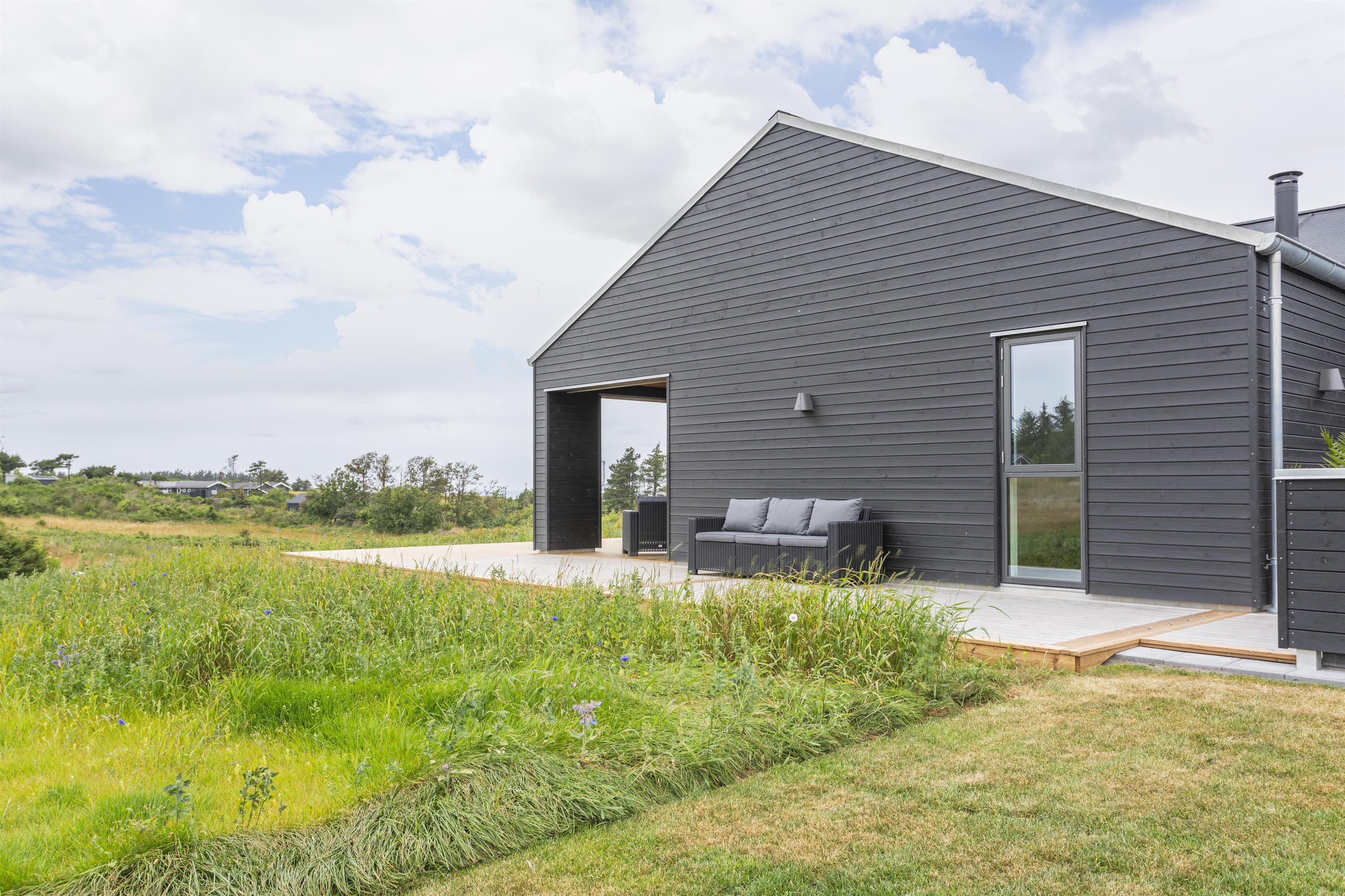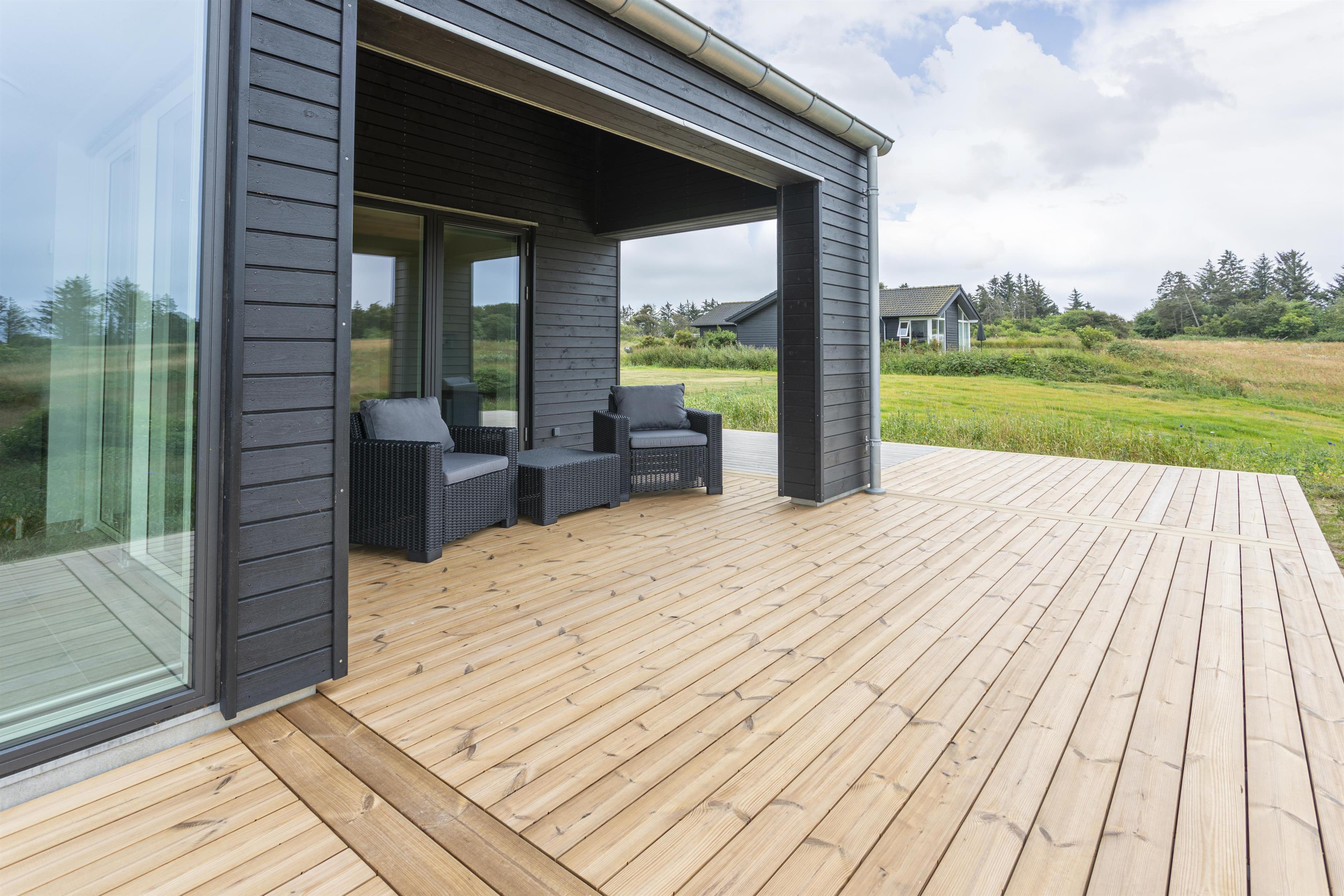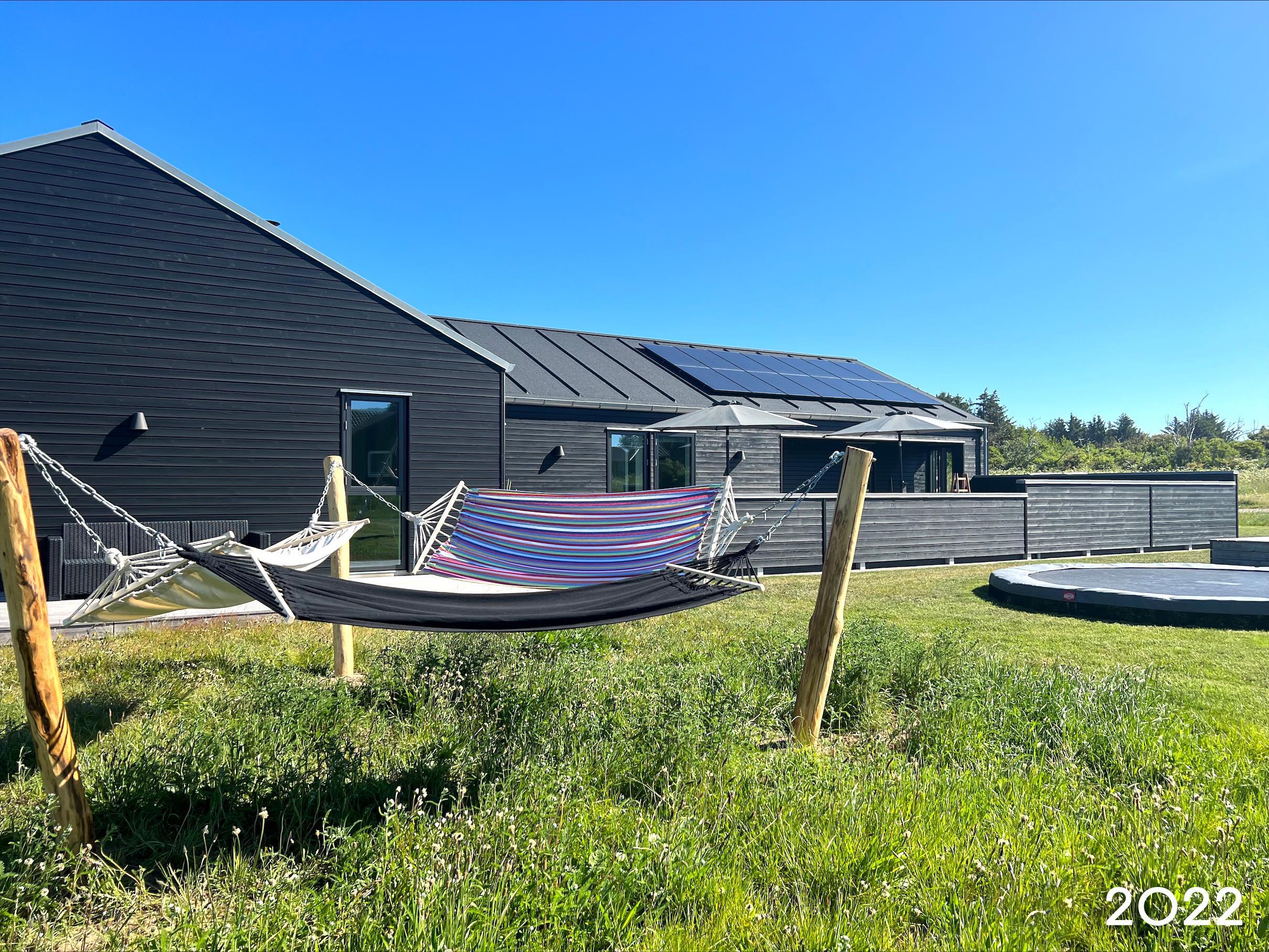 Das Haus verfügt über eine große Holzterrasse, die das Haus fast vollständig umgibt – ideal für den Morgenkaffee, Grillabende oder entspannte Stunden in der Sonne. Die teilweise überdachte Terrasse bietet gemütliche windgeschützte Plätze, von denen aus ihr die schöne Umgebung in erster Reihe genießen könnt. Der Garten bietet zahlreiche Aktivitäten für die ganze Familie, darunter Trampolin, Schaukeln, Hängematten, einen Sandkasten, zwei Fußballtore sowie ein Netz mit Ausrüstung für Volleyball, Badminton und Tennis.