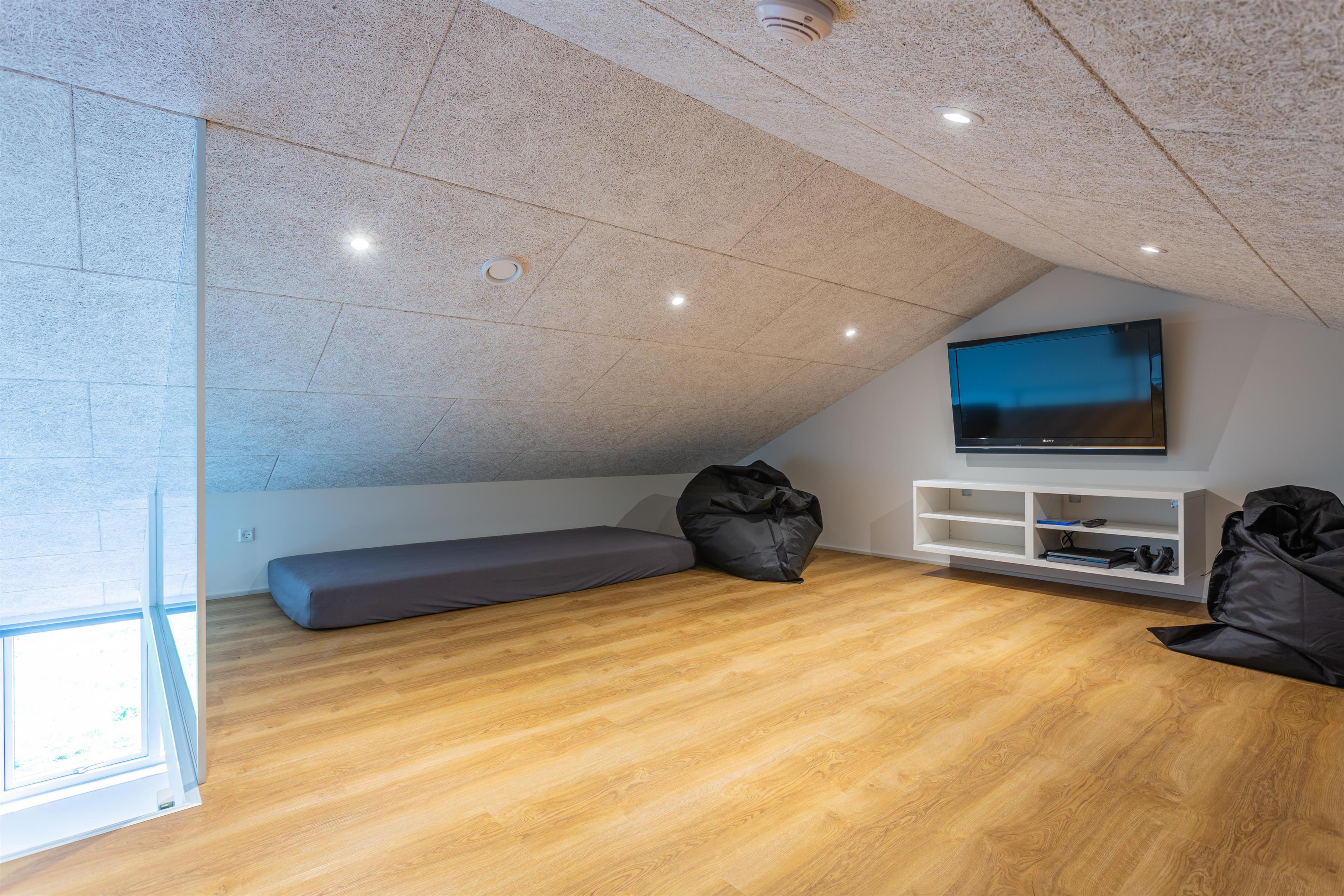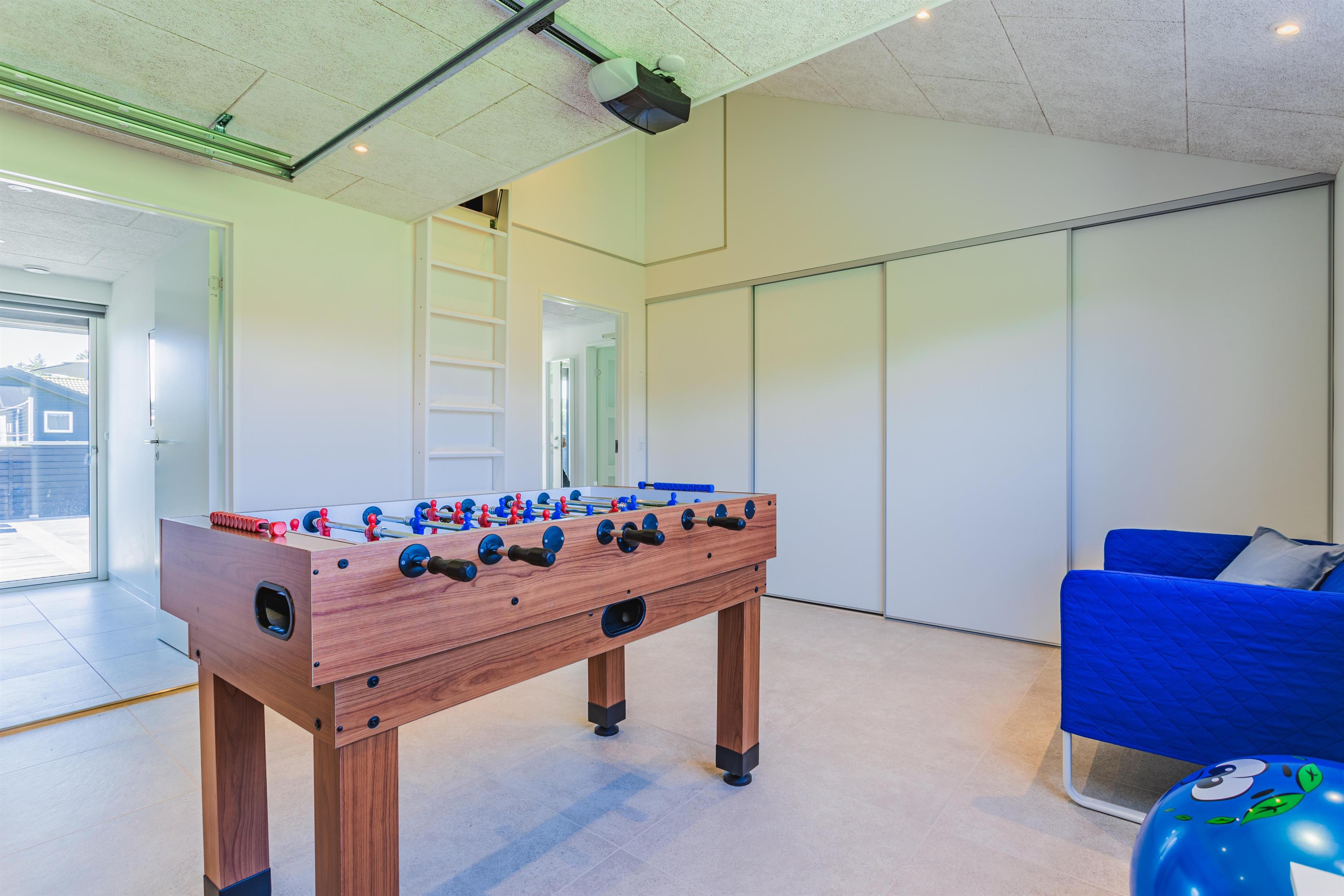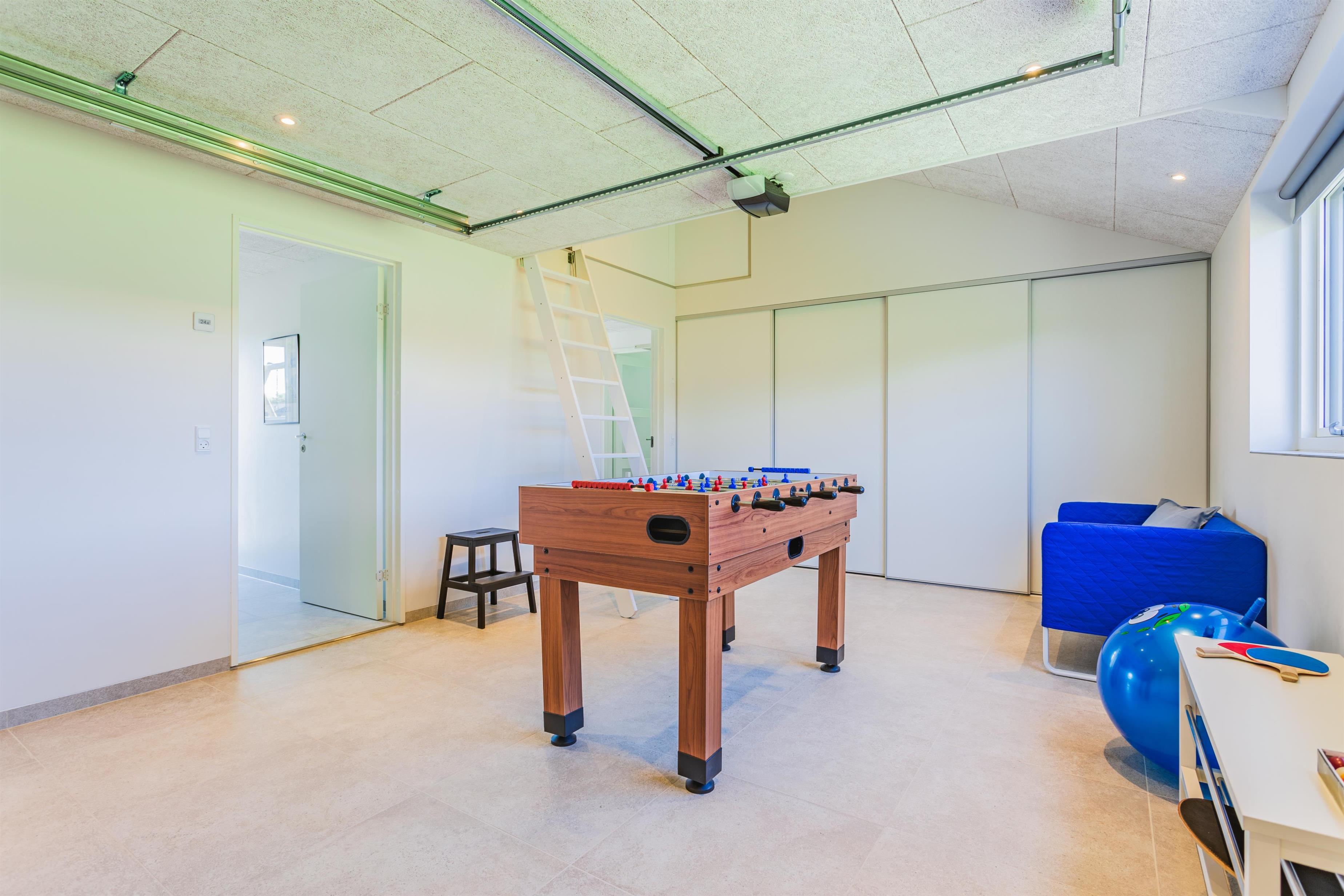 Die Garage bietet direkten Zugang zum Haus und dient heute als Aktivitätsraum mit zahlreichen Möglichkeiten für Spiel und Spaß. Zusätzlich gibt es eine gemütliche Hems mit 2 weiteren Schlafplätzen sowie einem TV und einer PS4.