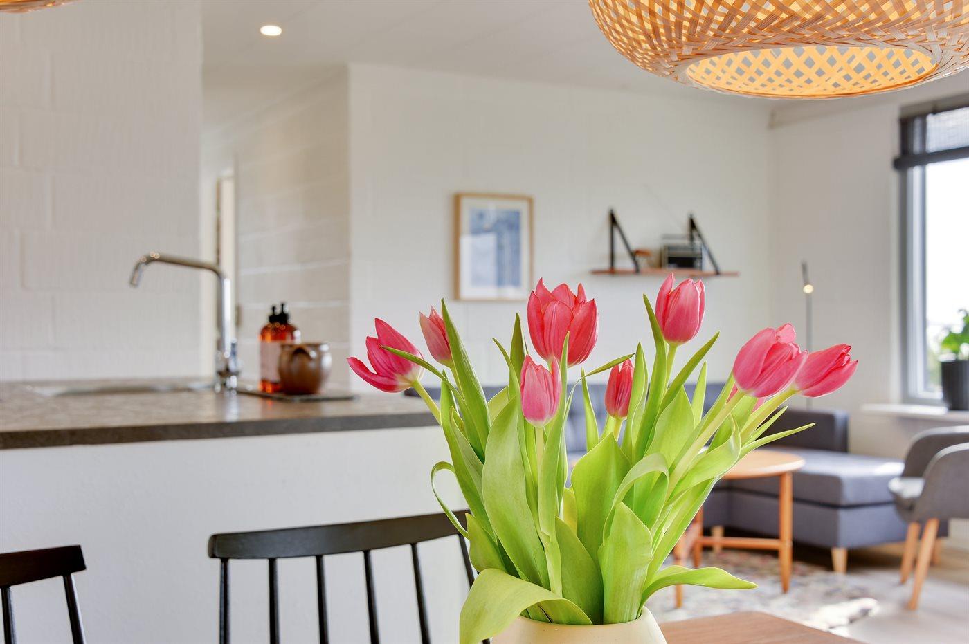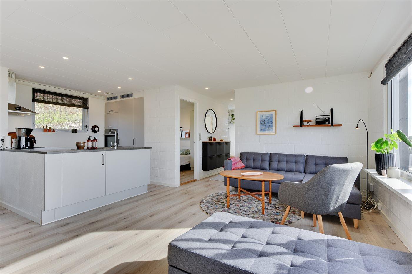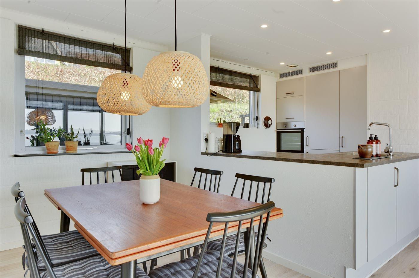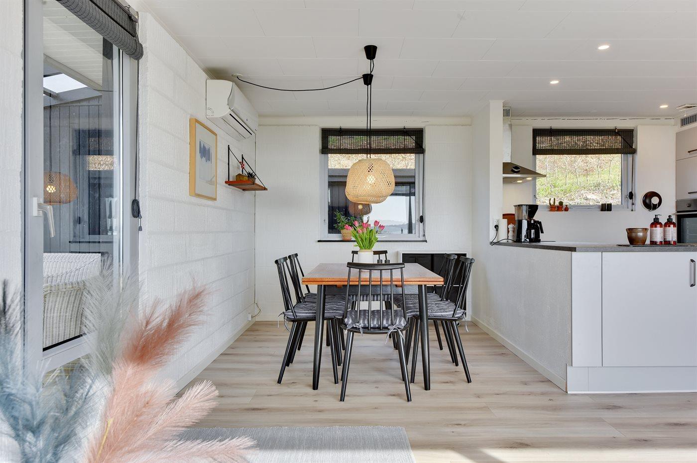 Mit einer phantastischen Aussicht auf den Fjord liegt dieses ganz besonders gemütliche und hell eingerichtete Ferienhaus. Übrigens: Zusätzlich zu den 2 Schlafzimmern gibt es 2 Schlafplätze auf einer Doppelschlafcouch im Wohnzimmer.