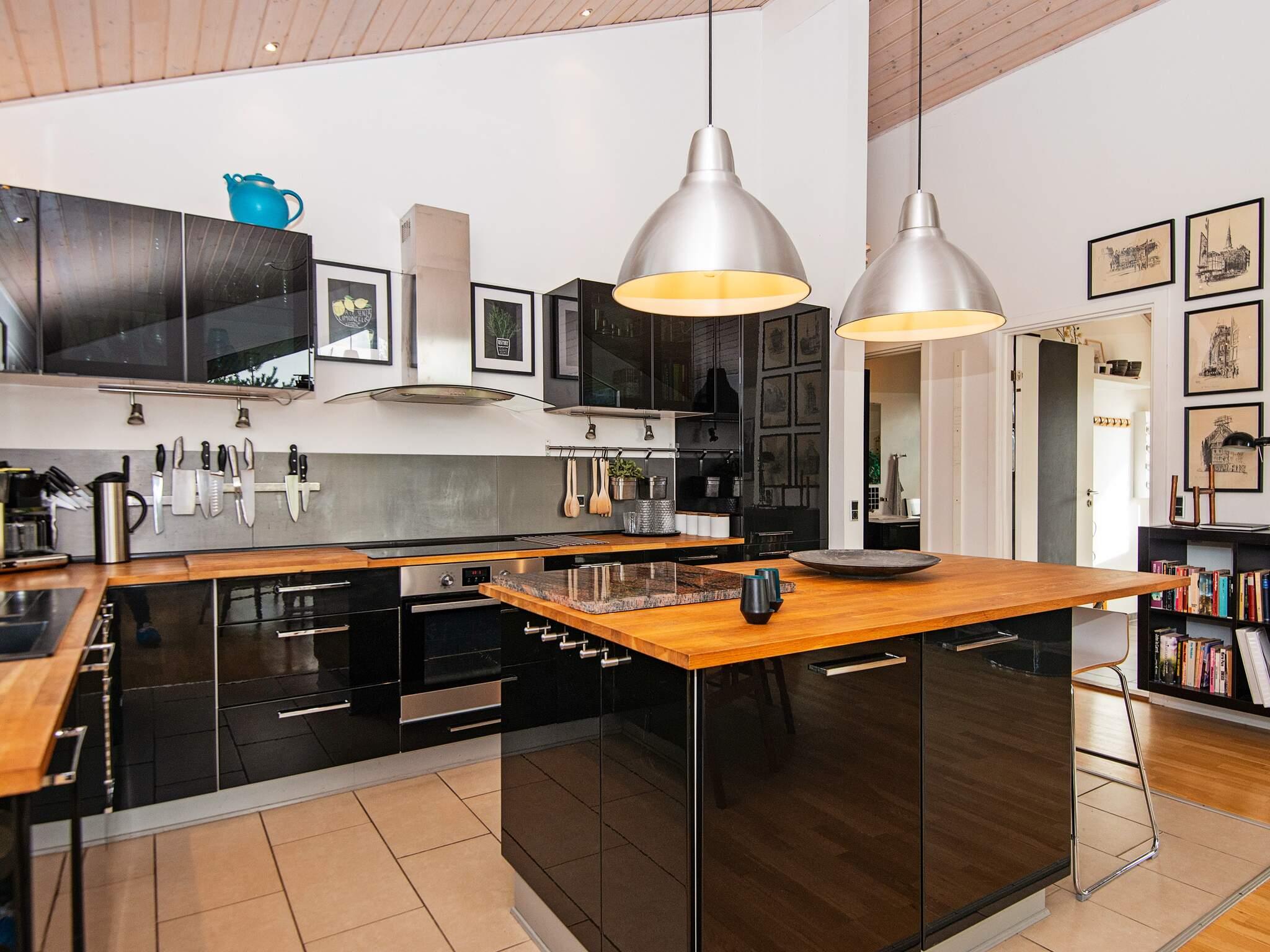 stilvolle Designerküche in schwarzem Hochglanz-Dekor, der entspannende