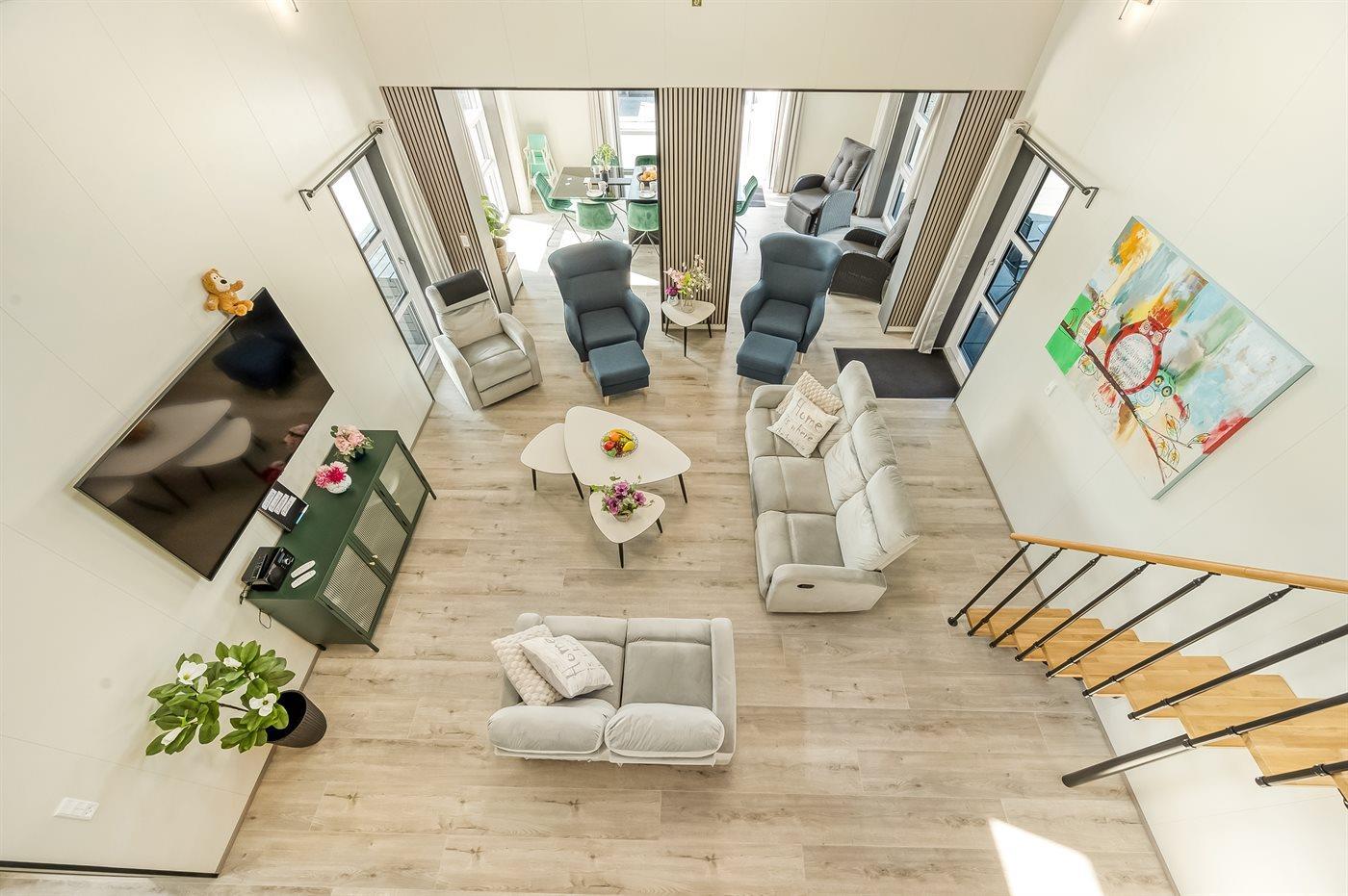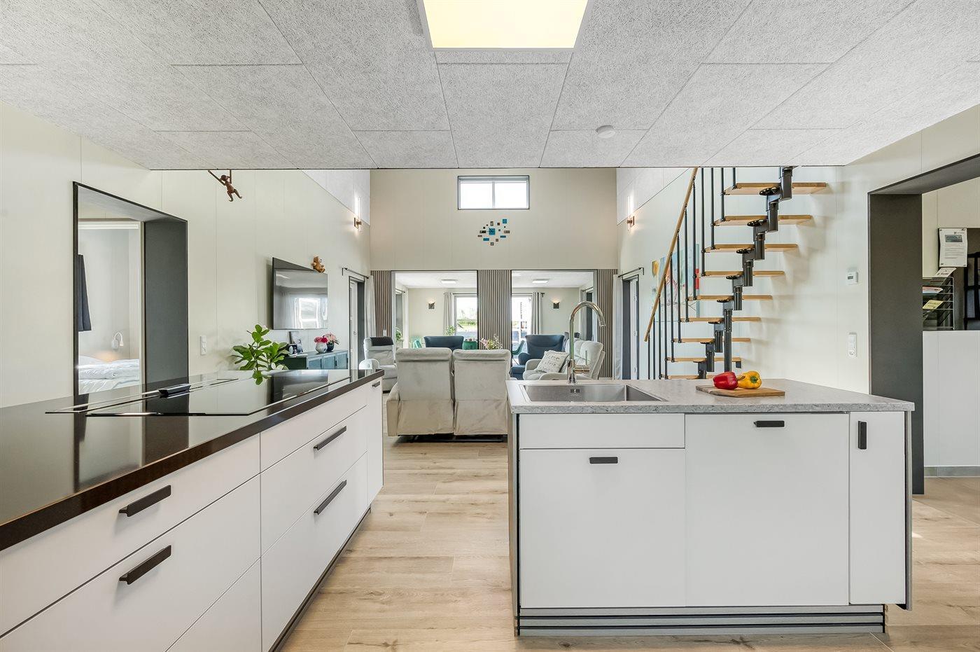 Der Mittelpunkt des Hauses ist der große Wohn- und Küchenbereich. Hier kannst du dich in der bequemen Sitzgruppe bei einem guten Film entspannen, in der gut ausgestatteten Küche gemeinsam kochen oder am großen Esstisch ein Brettspiel spielen. Das geräumige, offene Obergeschoss bietet dir die Möglichkeit, dich ein wenig zurückziehen und dennoch am Geschehen teilzunehmen.