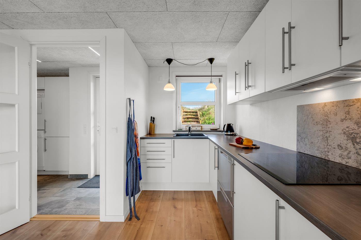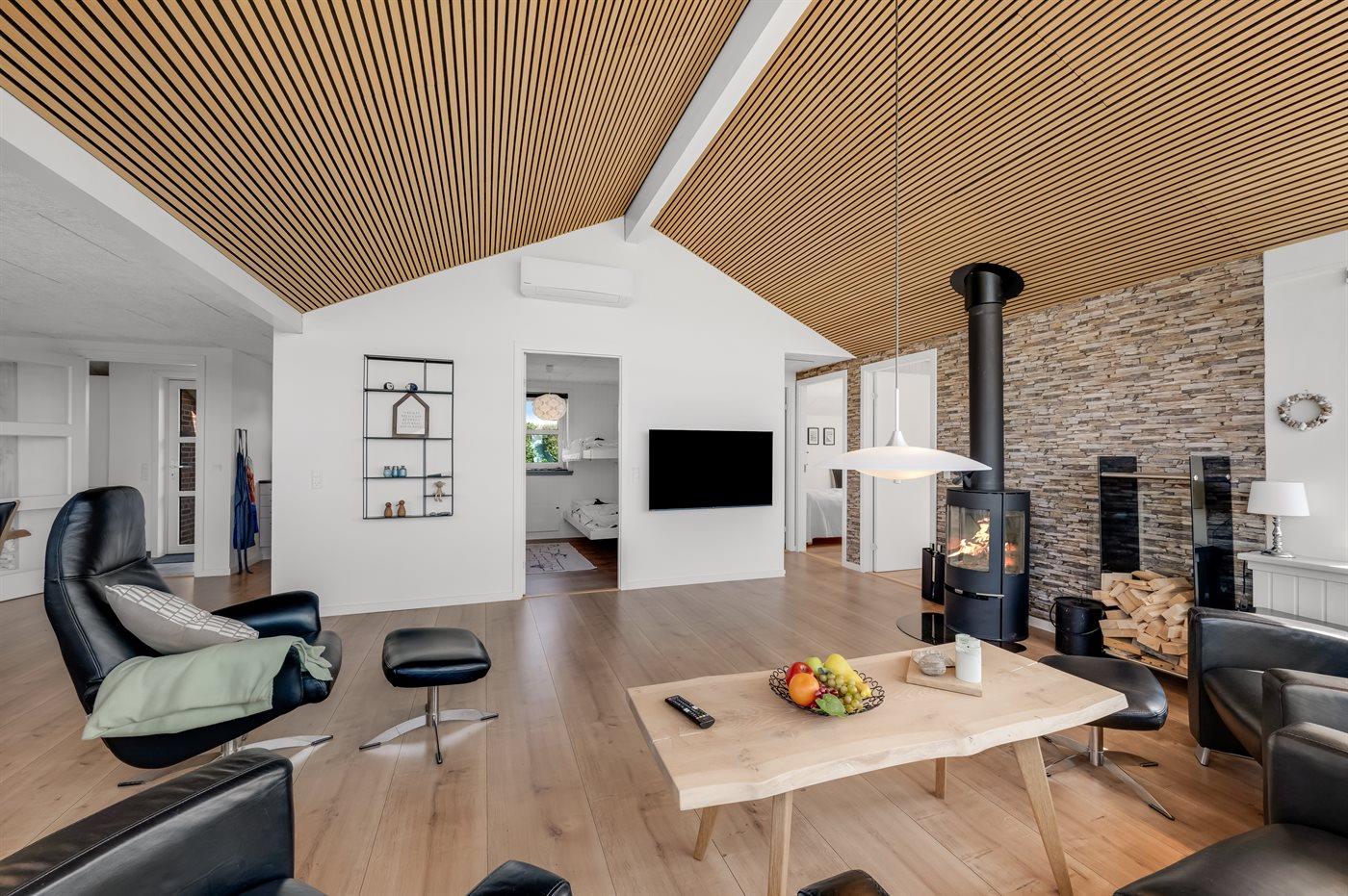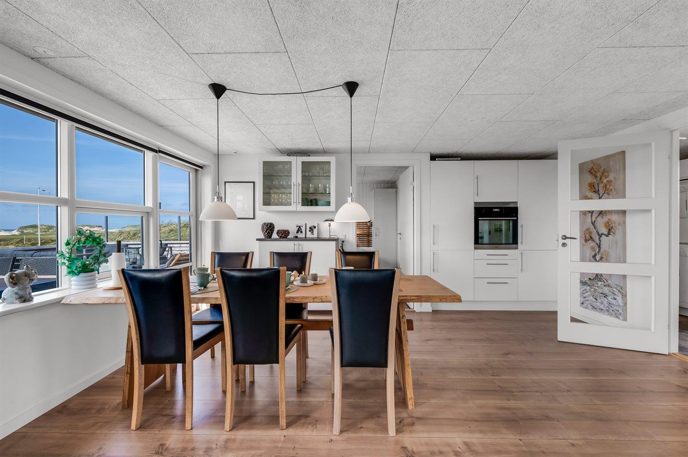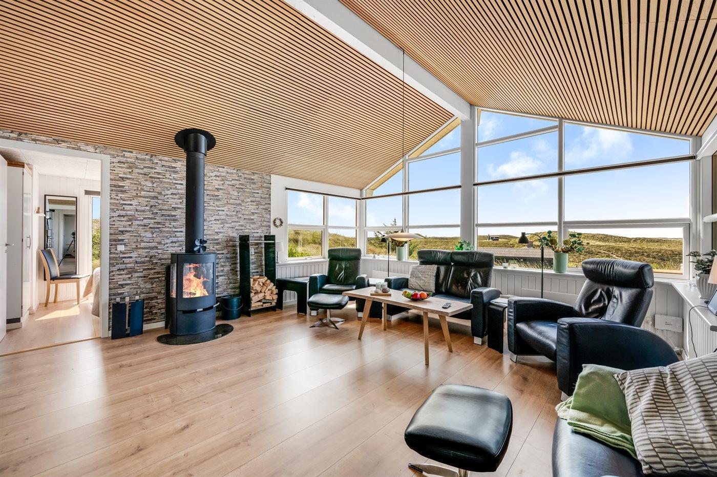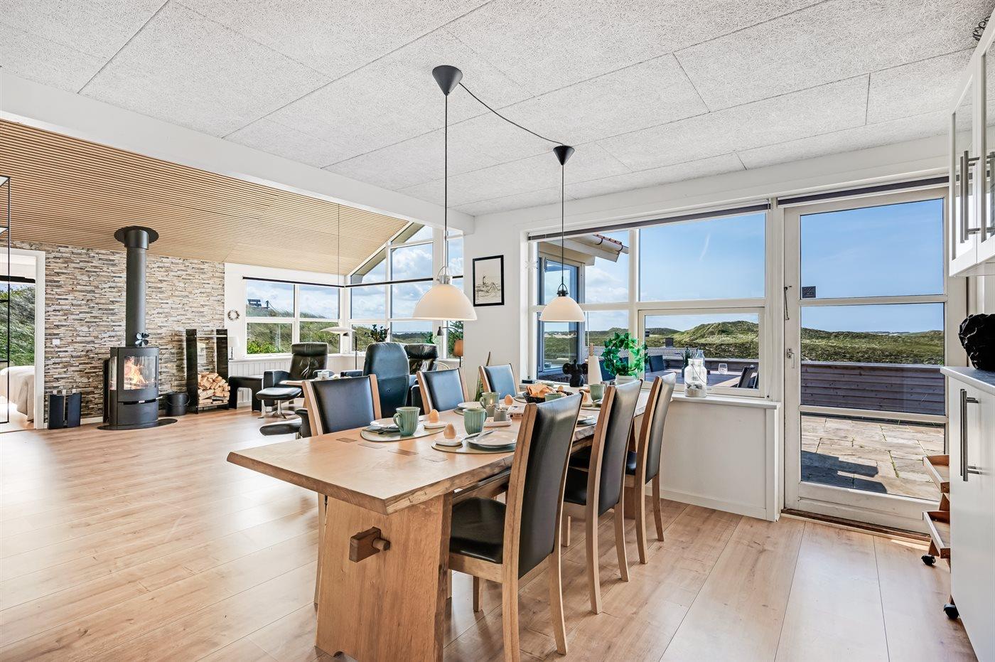 Zieht ihr euch ins geräumige Wohnküchenbereich zurück – gestaltet im dänischen Design mit viel Liebe zum Detail – könnt ihr den feinen Ausblick auch durch die großen Panoramafenster genießen. In der gut ausgestatteten Küche des Ferienhauses ist reichlich Platz, sodass ihr gemeinsam kochen, plaudern und gemütlich beisammensitzen könnt. Wer richtig entspannen möchte, kann es sich auf dem Sofa bequem machen und einen guten Film schauen – untermalt vom Knistern des Kaminofens. Der beste Platz im Wohnbereich ist jedoch zweifellos der große Esstisch – denn hier kann man sich in der Schönheit der Aussicht verlieren.