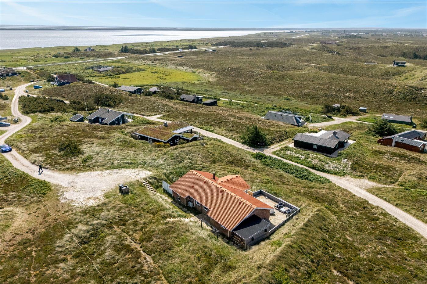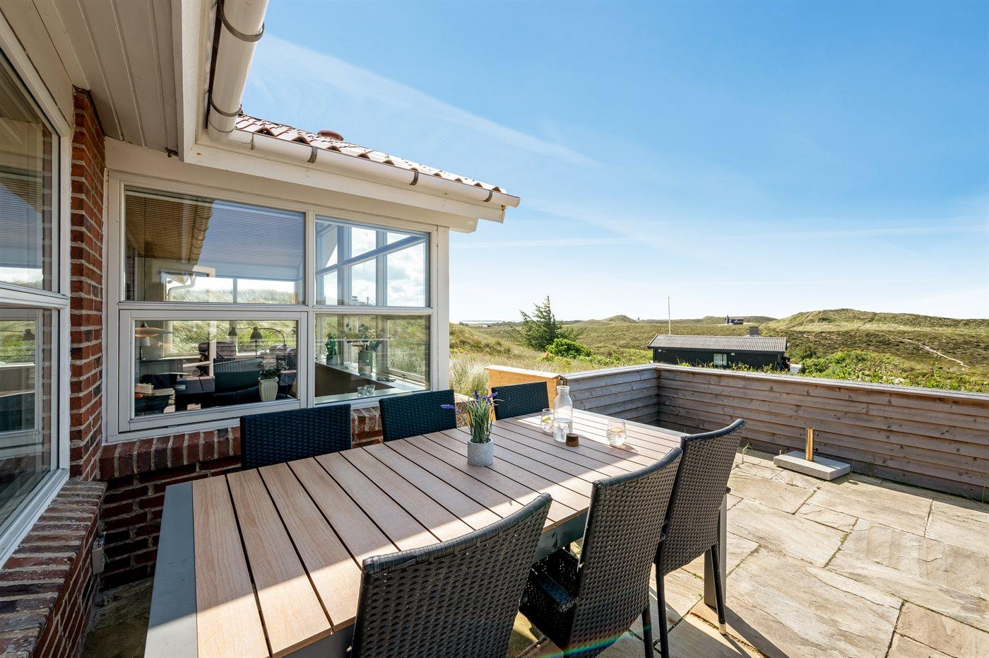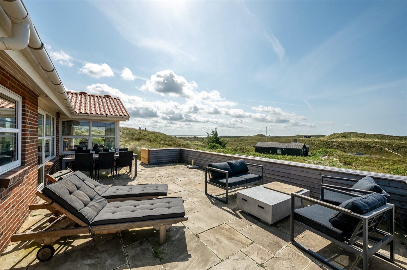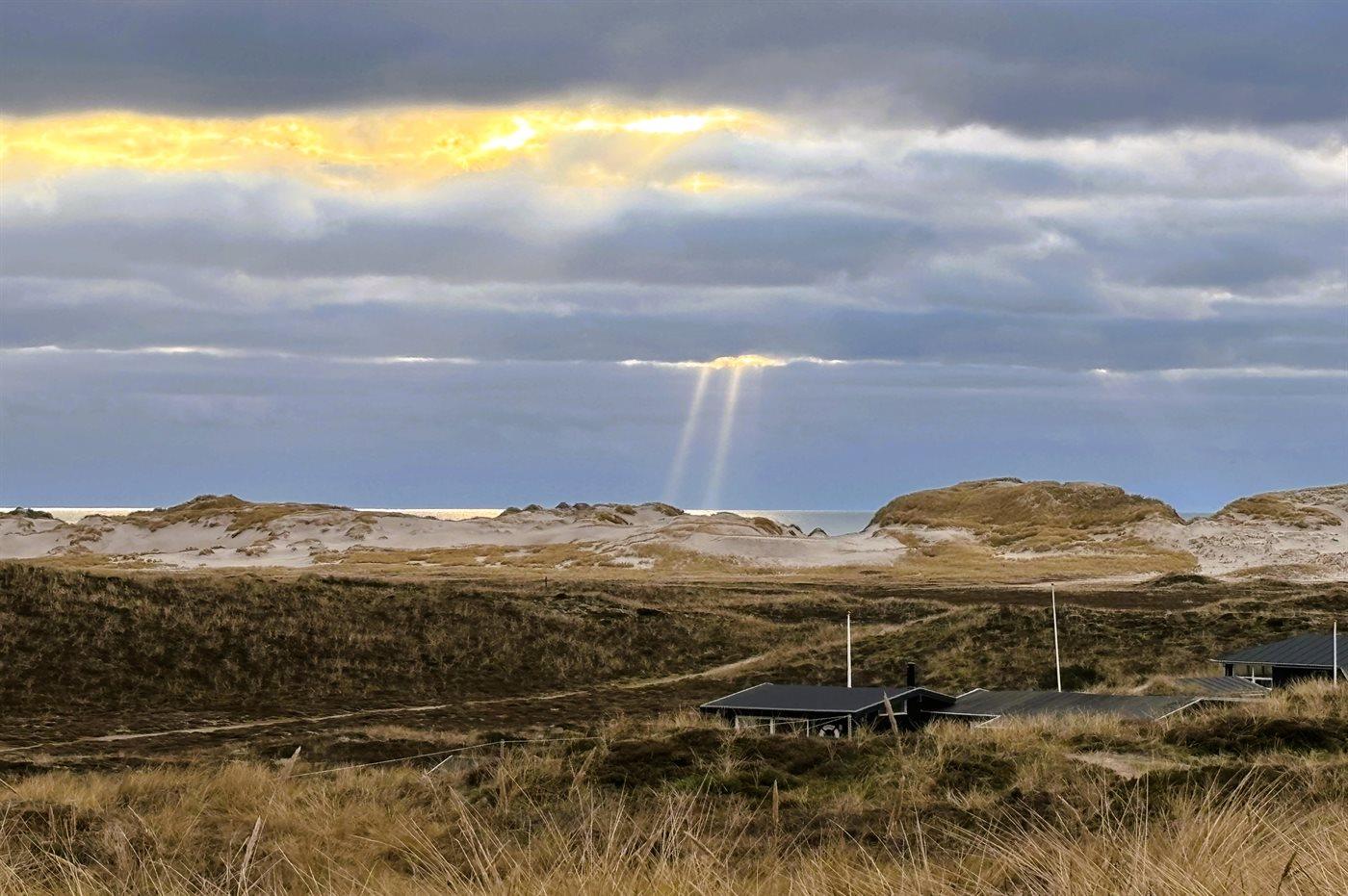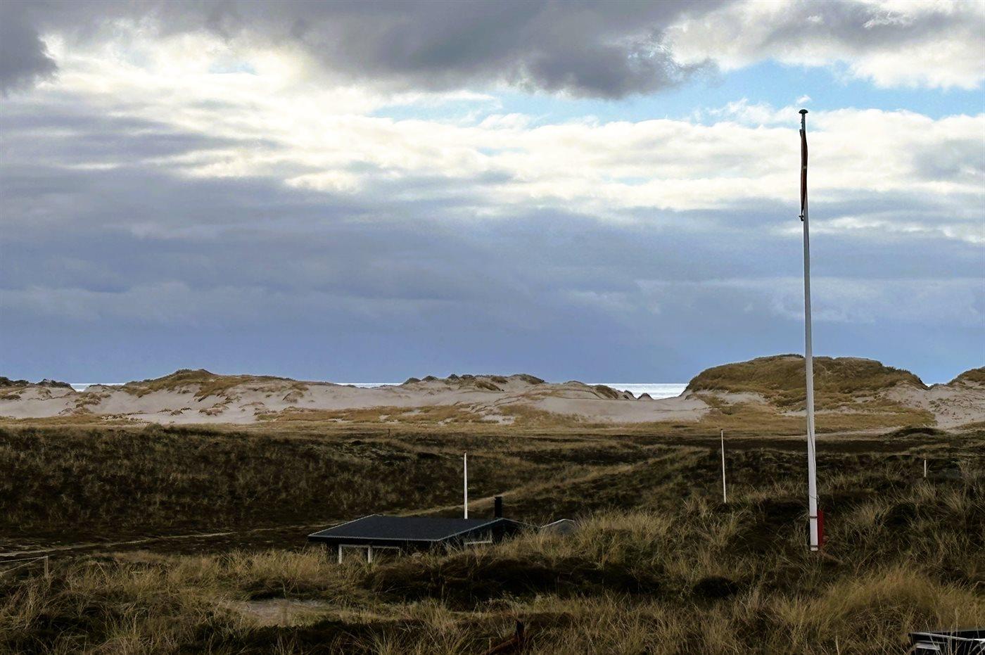 Wenn ihr auf der großen, geschlossenen Terrasse des Ferienhauses sitzt, habt ihr nach Westen einen Blick über die Dünenlandschaft und könnt durch die Senken der Dünen das Meer sehen. Nach Osten bietet sich euch der schönste Blick über den Ringkøbing Fjord, und schaut ihr nach Süden, seht ihr das unter Naturschutz stehende westjütländische Dünengebiet – ein absolutes Wow-Erlebnis.