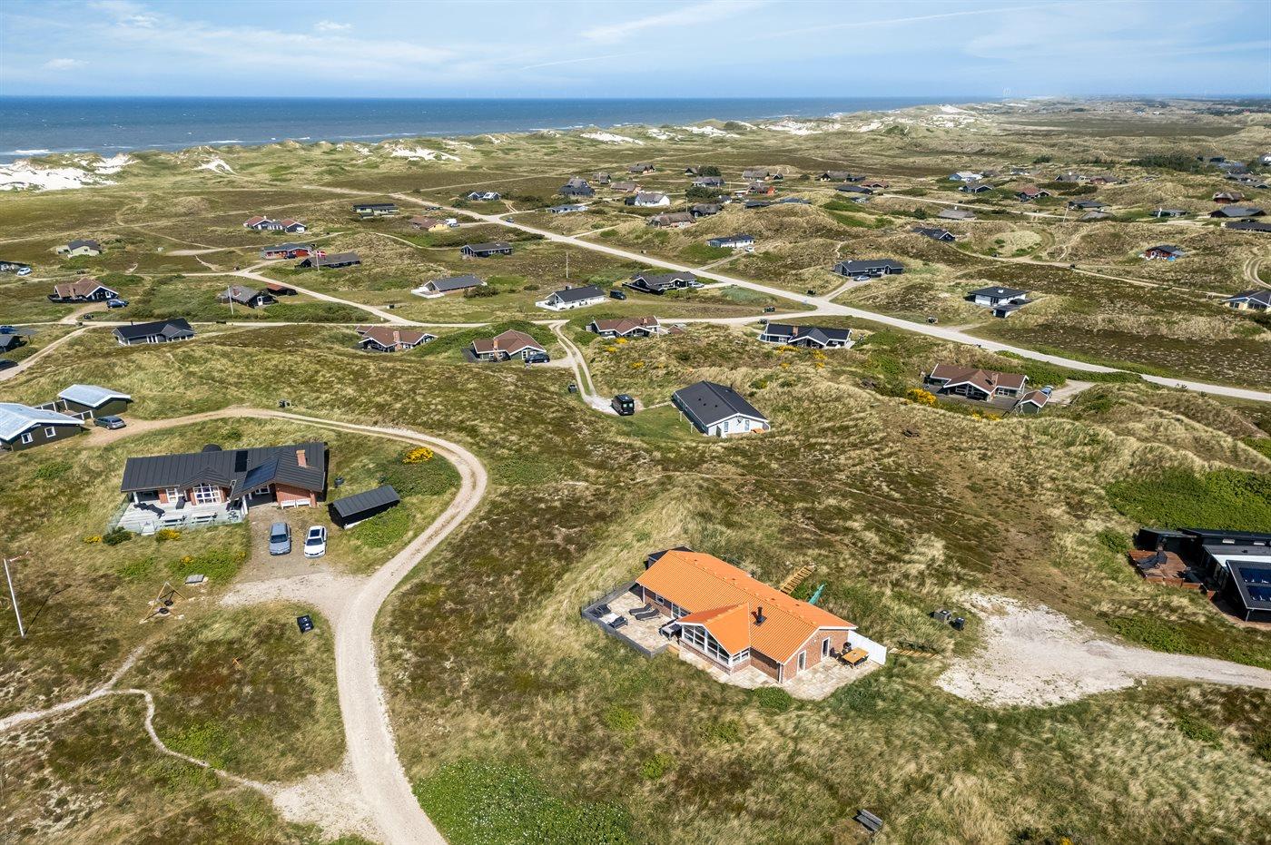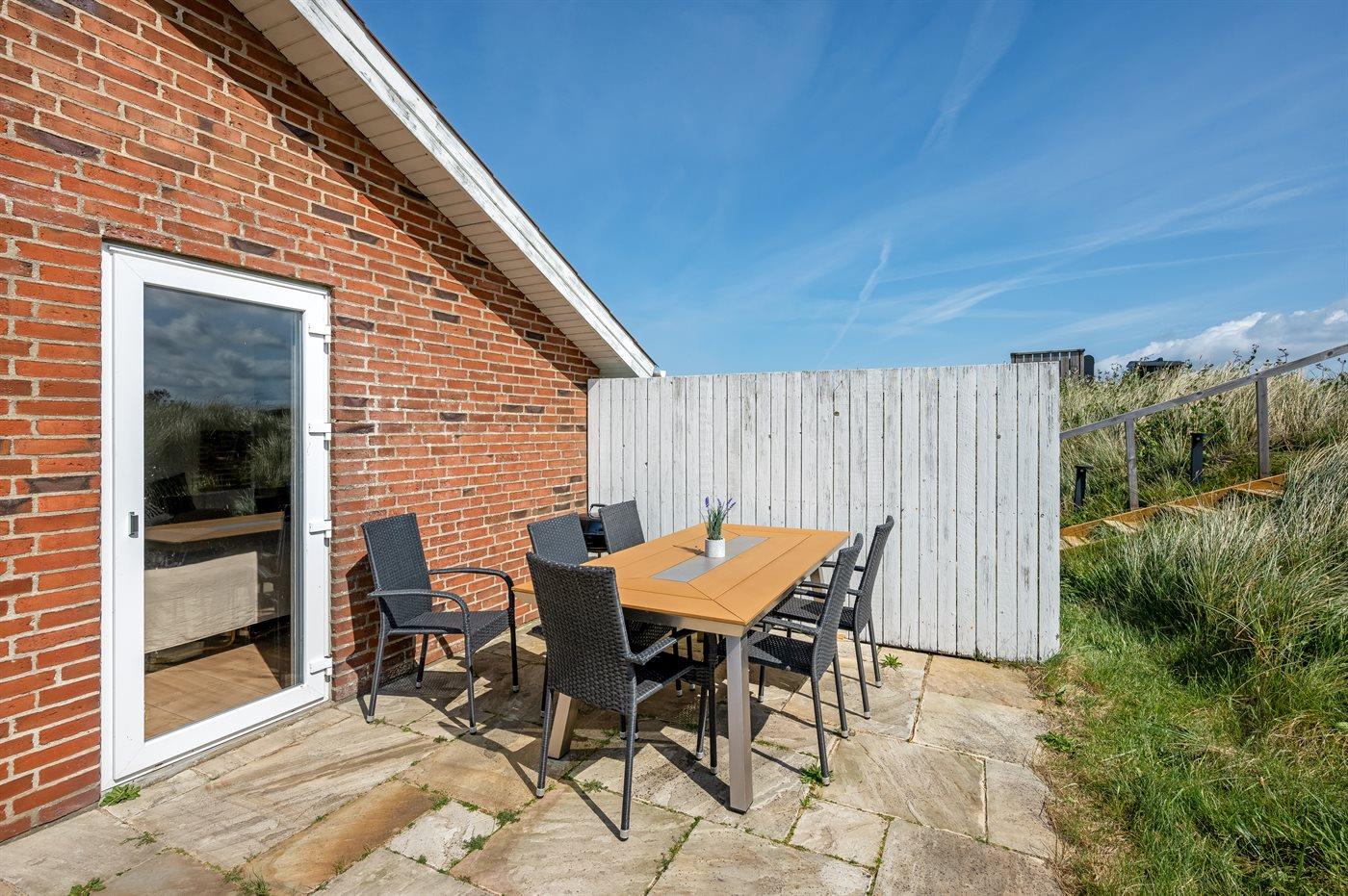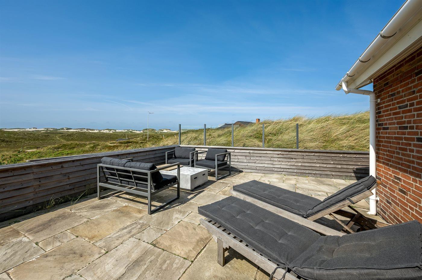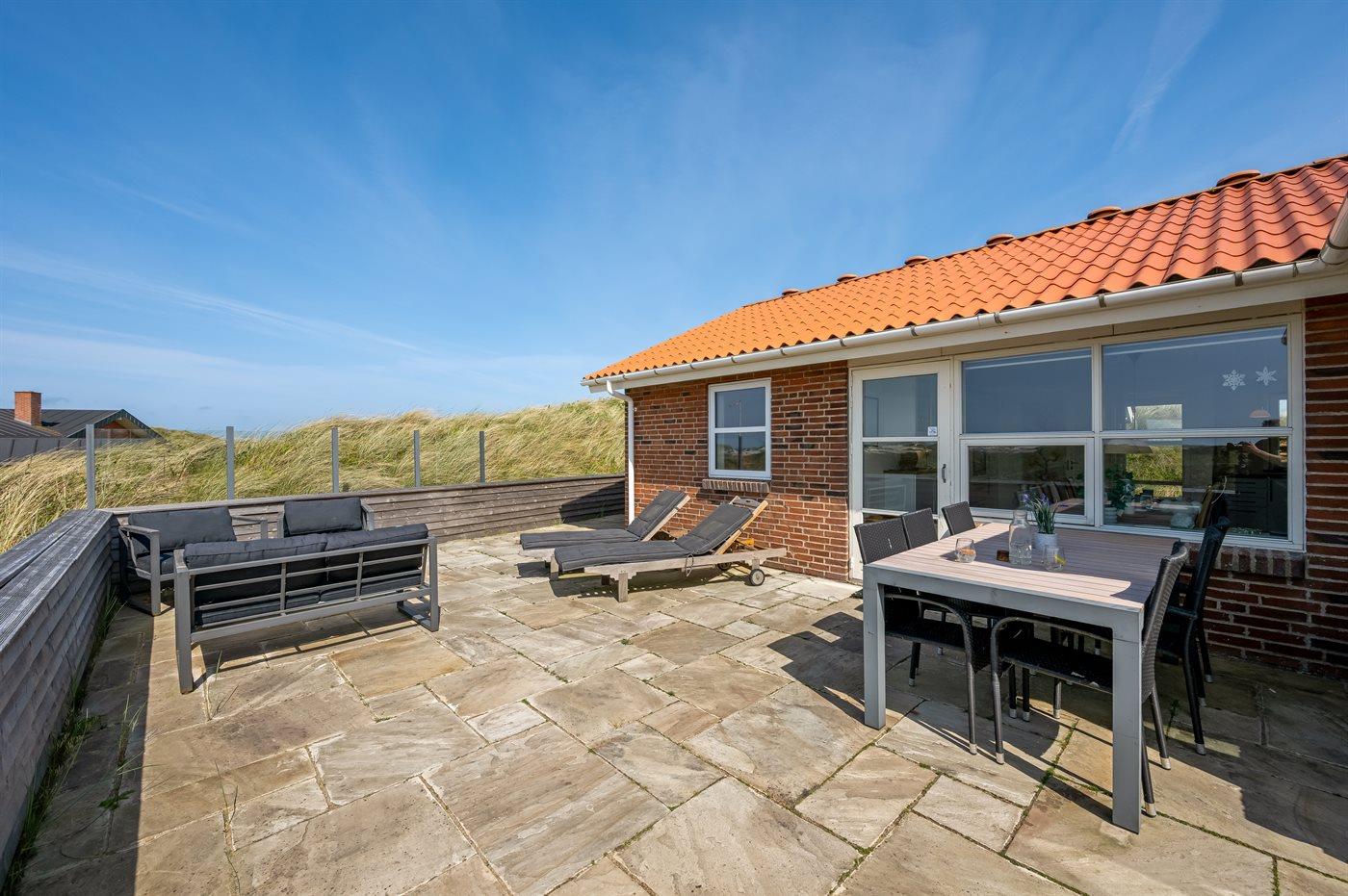 Wenn ihr auf der großen, geschlossenen Terrasse des Ferienhauses sitzt, habt ihr nach Westen einen Blick über die Dünenlandschaft und könnt durch die Senken der Dünen das Meer sehen. Nach Osten bietet sich euch der schönste Blick über den Ringkøbing Fjord, und schaut ihr nach Süden, seht ihr das unter Naturschutz stehende westjütländische Dünengebiet – ein absolutes Wow-Erlebnis.