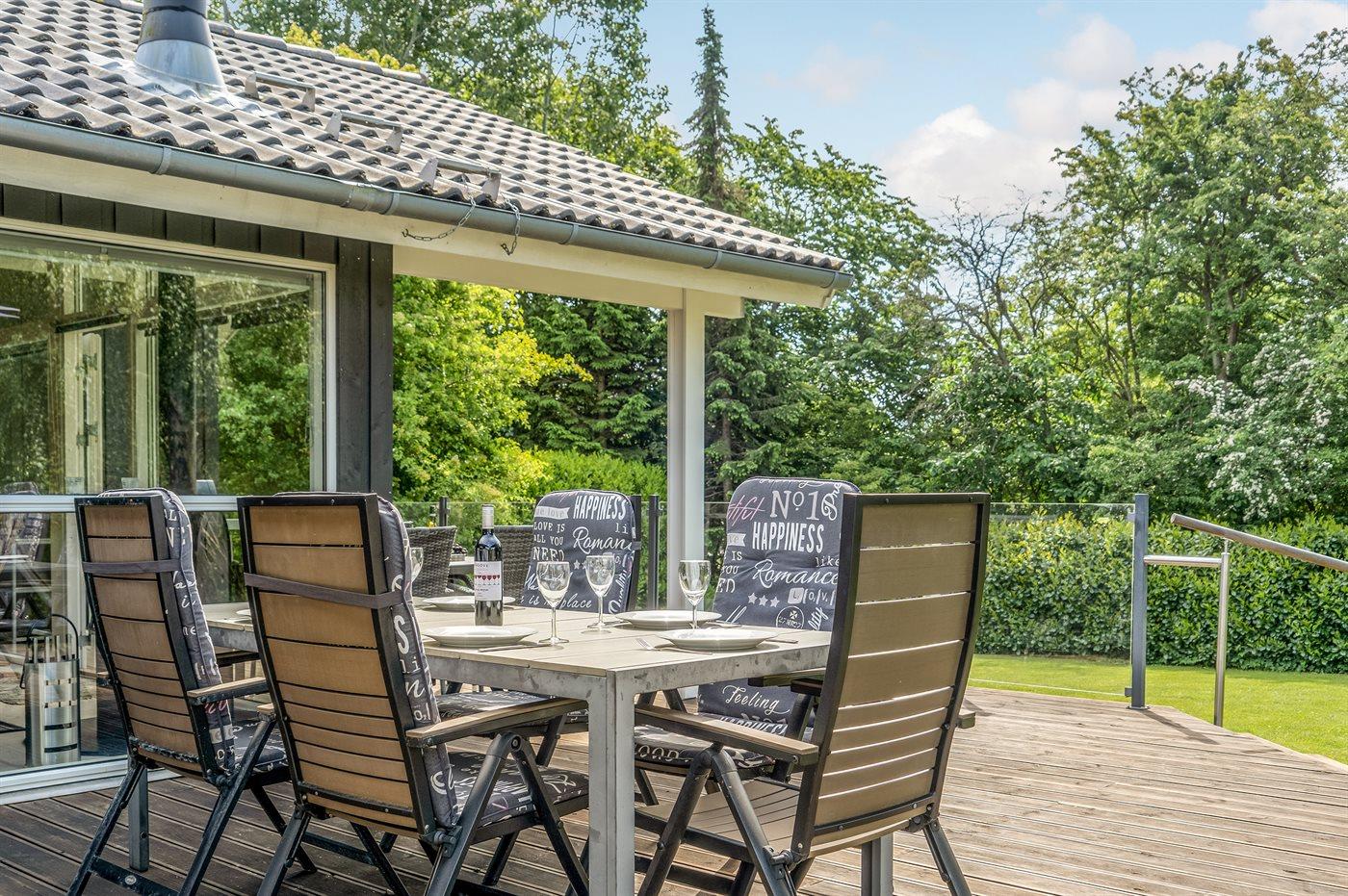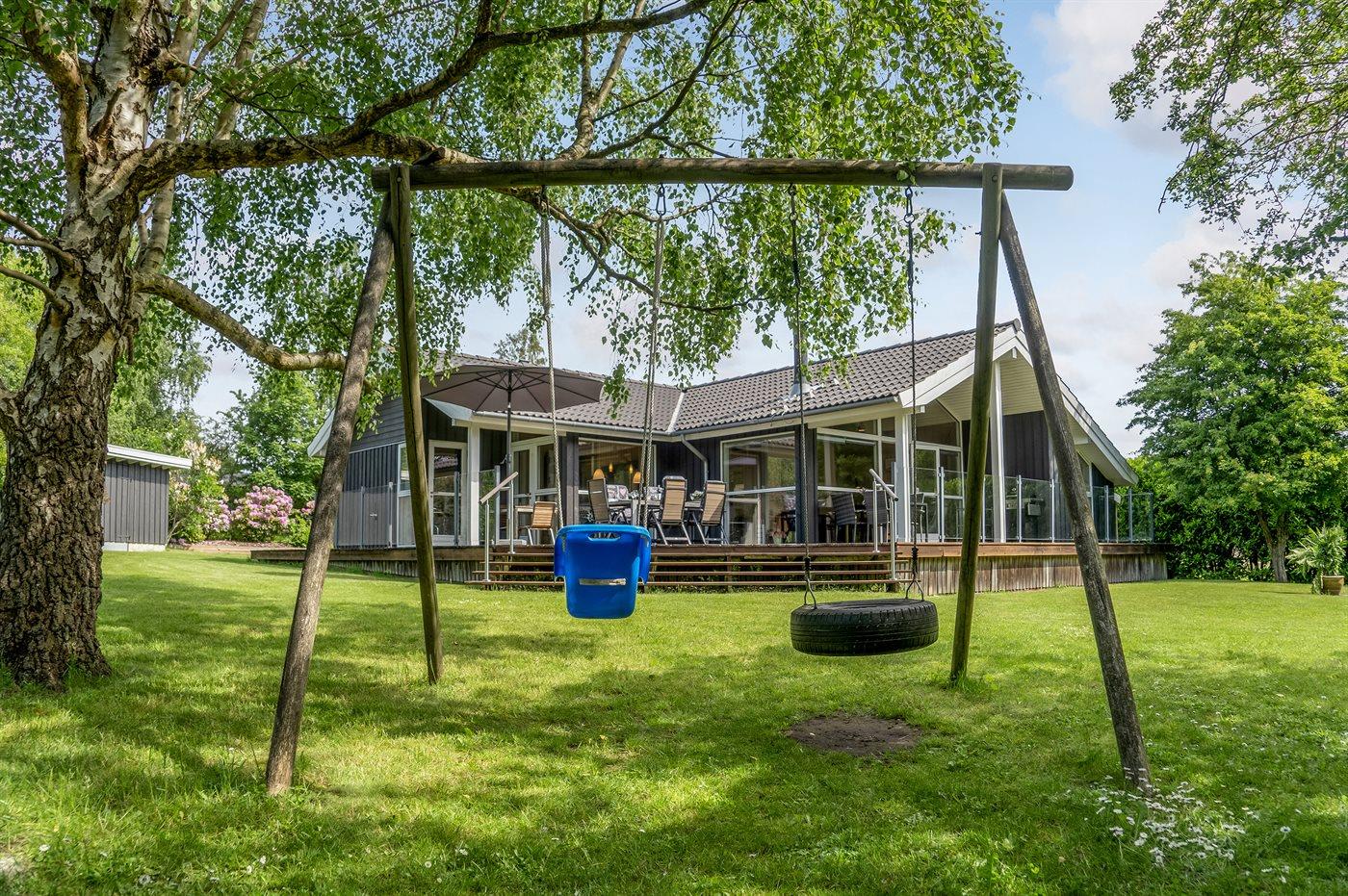 Tolles Ferienhaus in ruhiger Gegend mit großer Holzterrasse und Aktivitätsmöglichkeiten für Kinder.