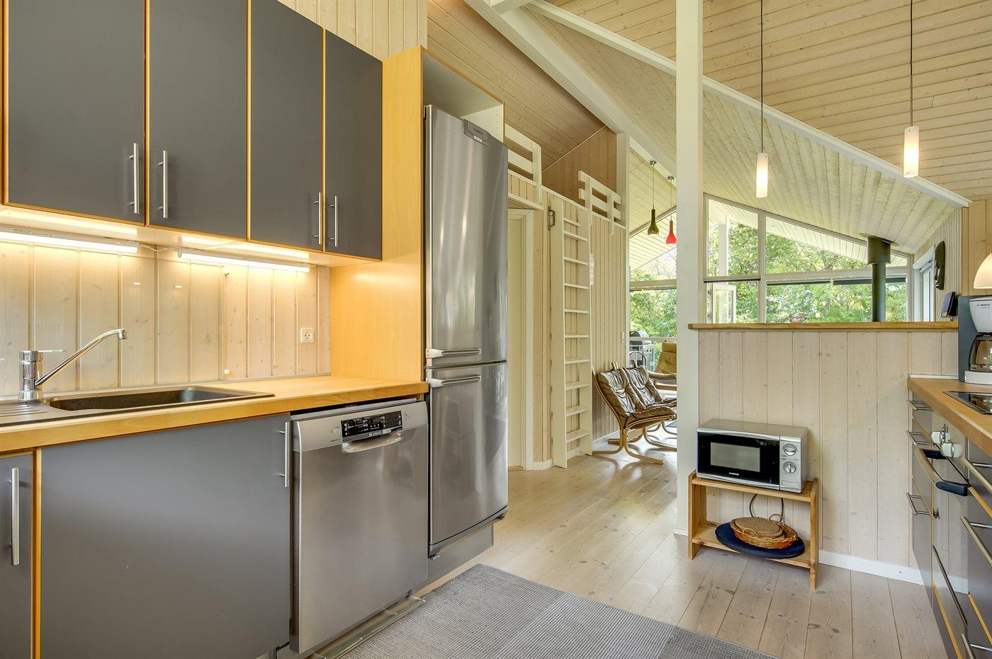 Die Küche ist mit Kühlschrank ausgestattet. Außerdem gibt es 4 Keramik-Kochfelder, Umluftofen, Mikrowelle sowie Geschirrspüler.