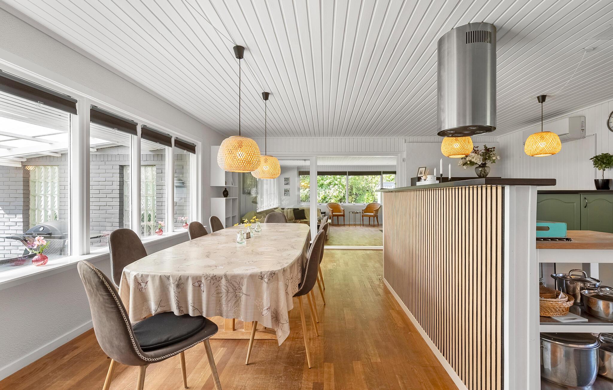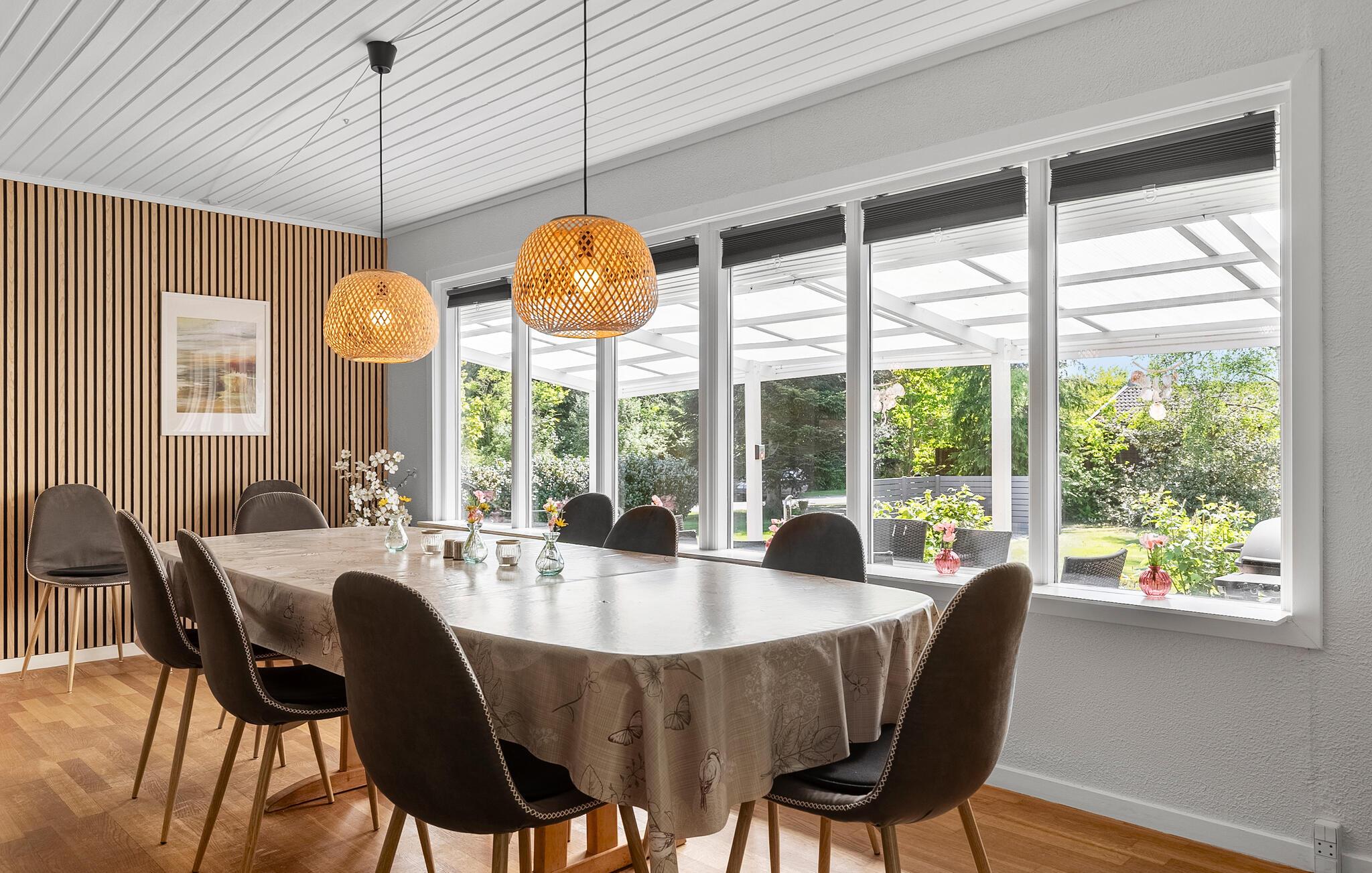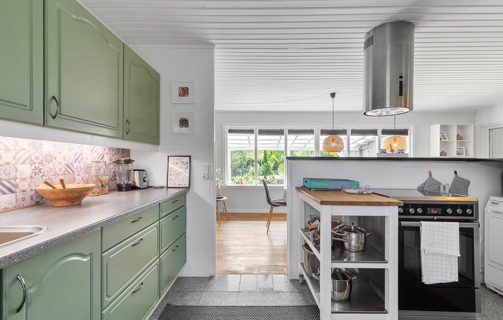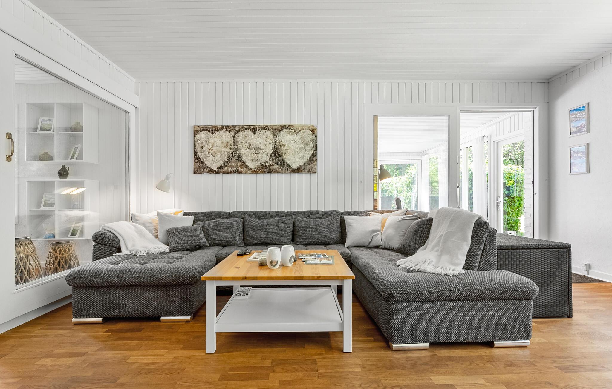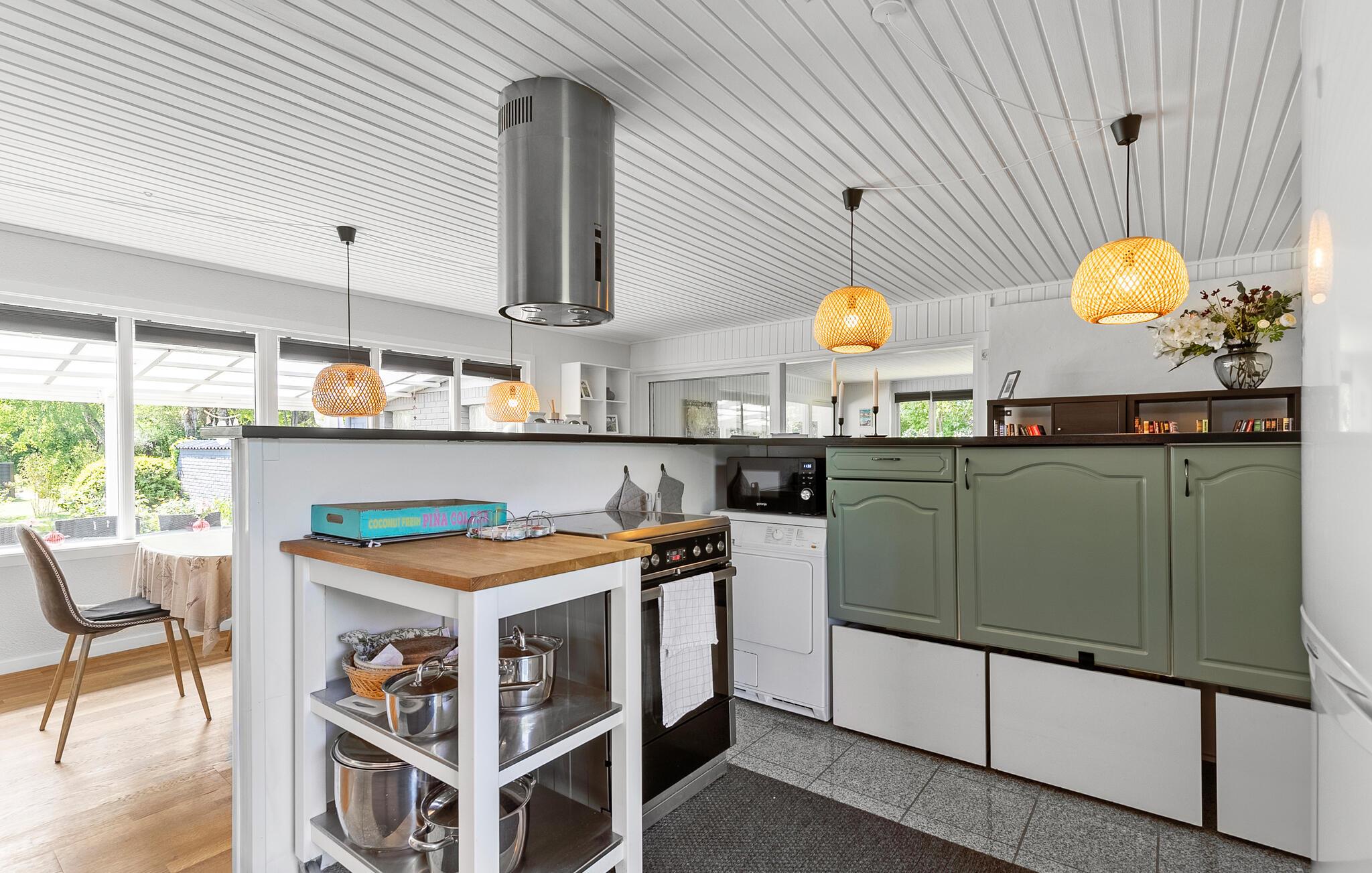 Machen Sie es sich im lichtdurchfluteten Innenbereich dieses geschmackvoll eingerichteten Ferienhauses bequem. Fühlen Sie sich beim Kochen in der voll ausgestatteten Küche wie zu Hause und servieren Sie Ihre Mahlzeiten am einladenden Essbereich mit Blick ins Grüne. Veranstalten Sie gesellige Spieleabende oder lassen Sie den Tag bei einem spannenden Film ausklingen.