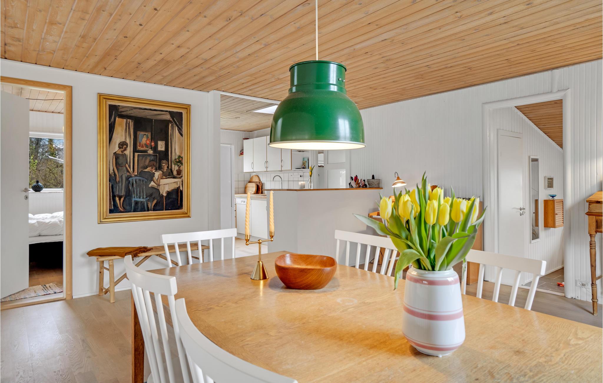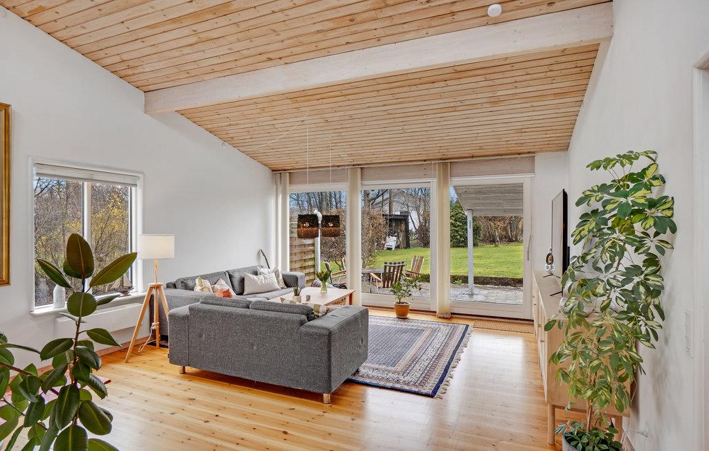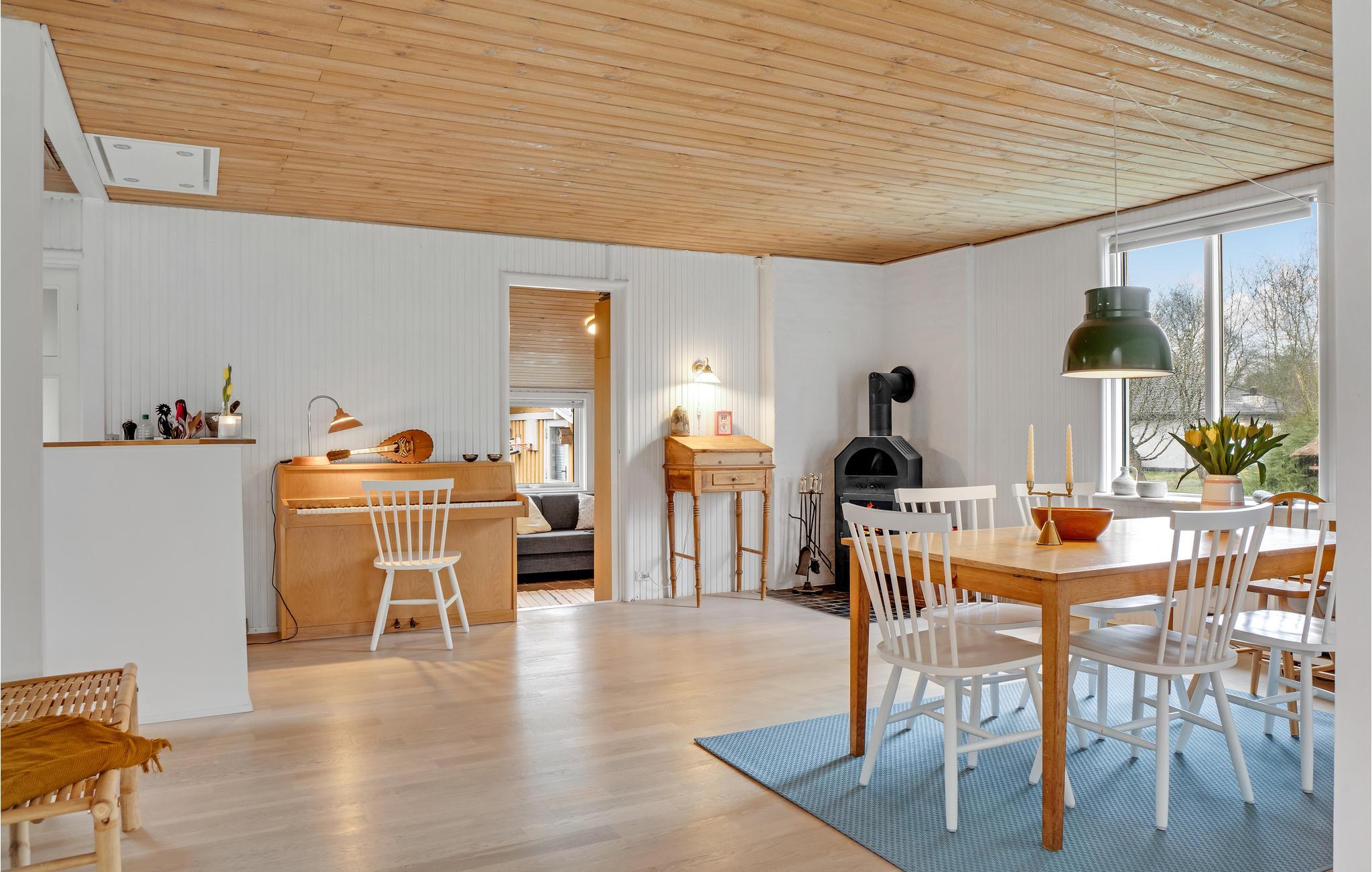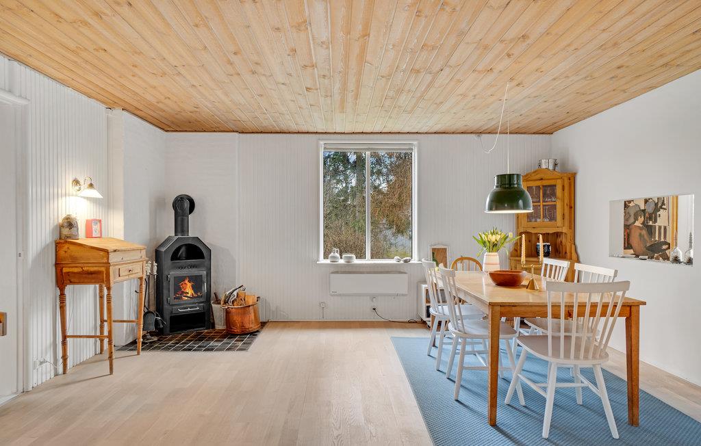 Genießen Sie ein helles, geschmackvolles Ferienhaus mit Garten, Terrasse und Kamin nahe dem Strand in Smidstrup Strand, Dänemark.
