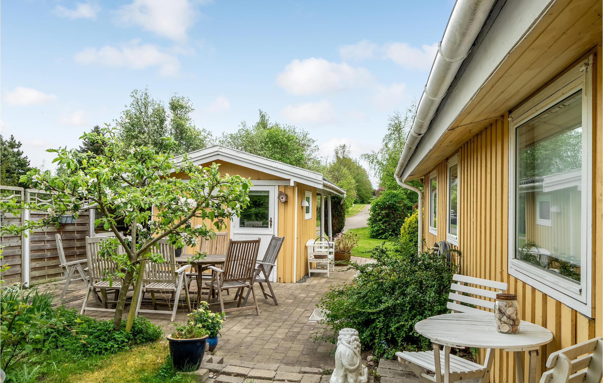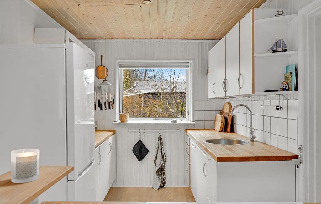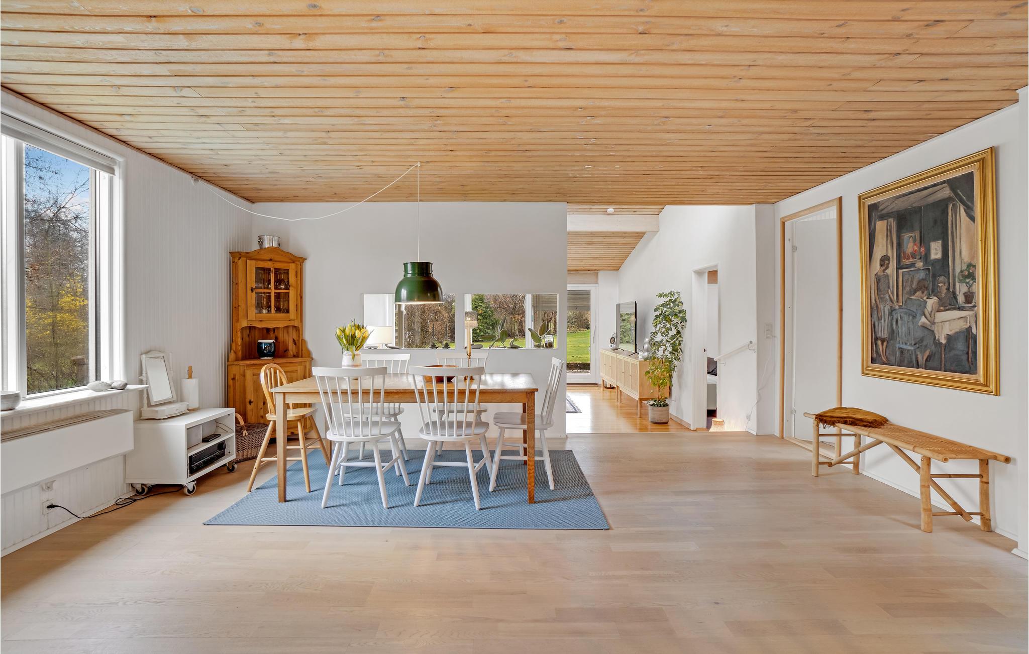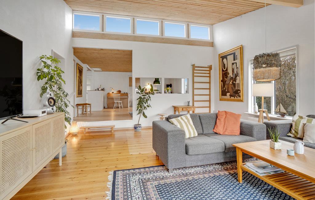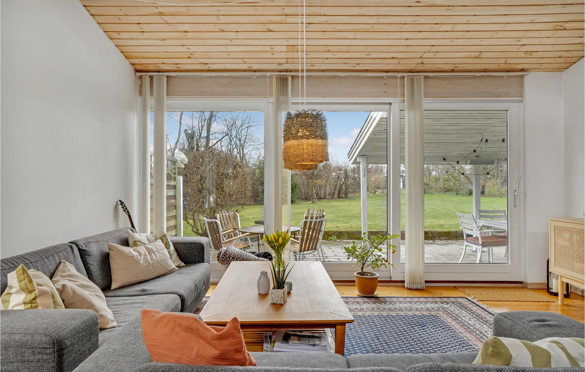 Genießen Sie ein helles, geschmackvolles Ferienhaus mit Garten, Terrasse und Kamin nahe dem Strand in Smidstrup Strand, Dänemark.