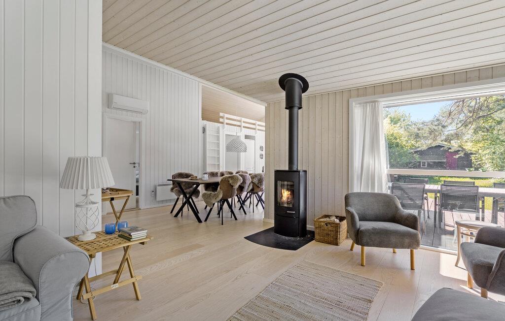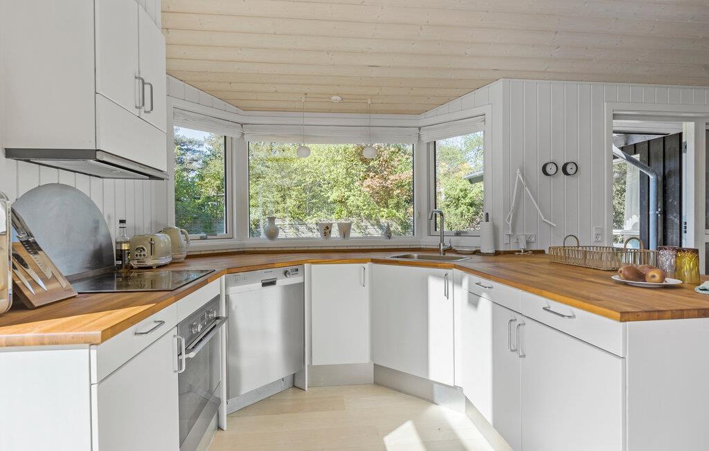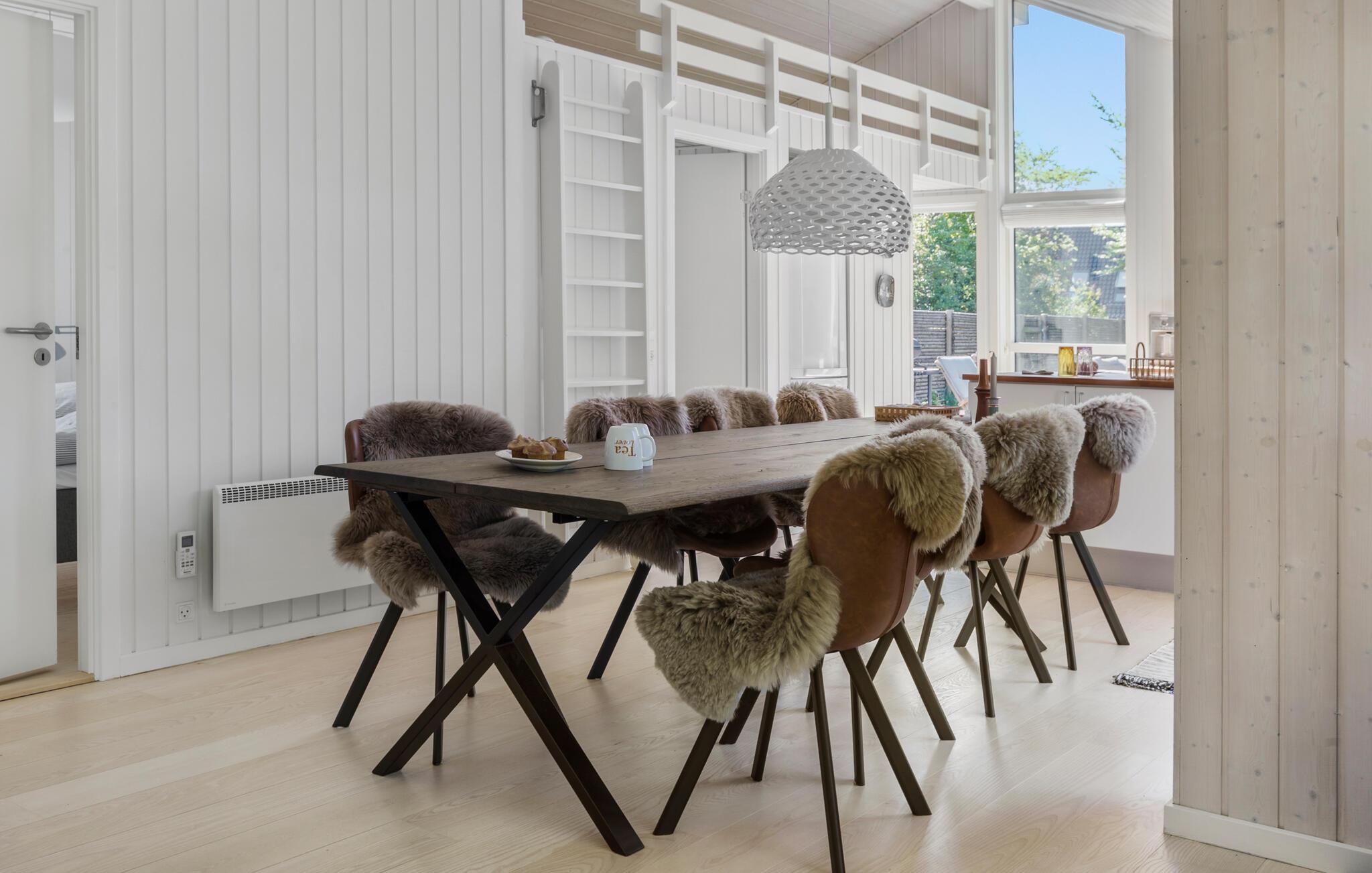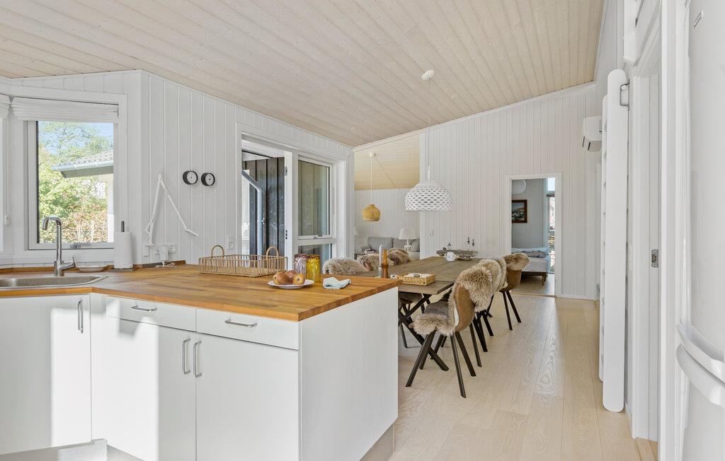 Dieses charmante Ferienhaus mit vielen attraktiven Annehmlichkeiten ist der ideale Ort für einen entspannten Familienurlaub. Die lichtdurchflutete, einladende Küche bietet reichlich Platz zum Kochen. Zaubern Sie hier köstliche Mahlzeiten für die ganze Familie. Der angrenzende stilvolle Holzesstisch lädt zu gemeinsamen Mahlzeiten ein. Der Wohnbereich ist gemütlich eingerichtet und bietet eine bequeme Sofaecke sowie einen Kaminofen, der für eine wohlige Atmosphäre sorgt. Lassen Sie hier die Seele baumeln und genießen Sie den Blick durch die großen Fenster ins Freie. Verbringen Sie hier auch entspannte Abende mit der Familie, ob beim Lesen, Spielen oder beim Schauen eines Films.