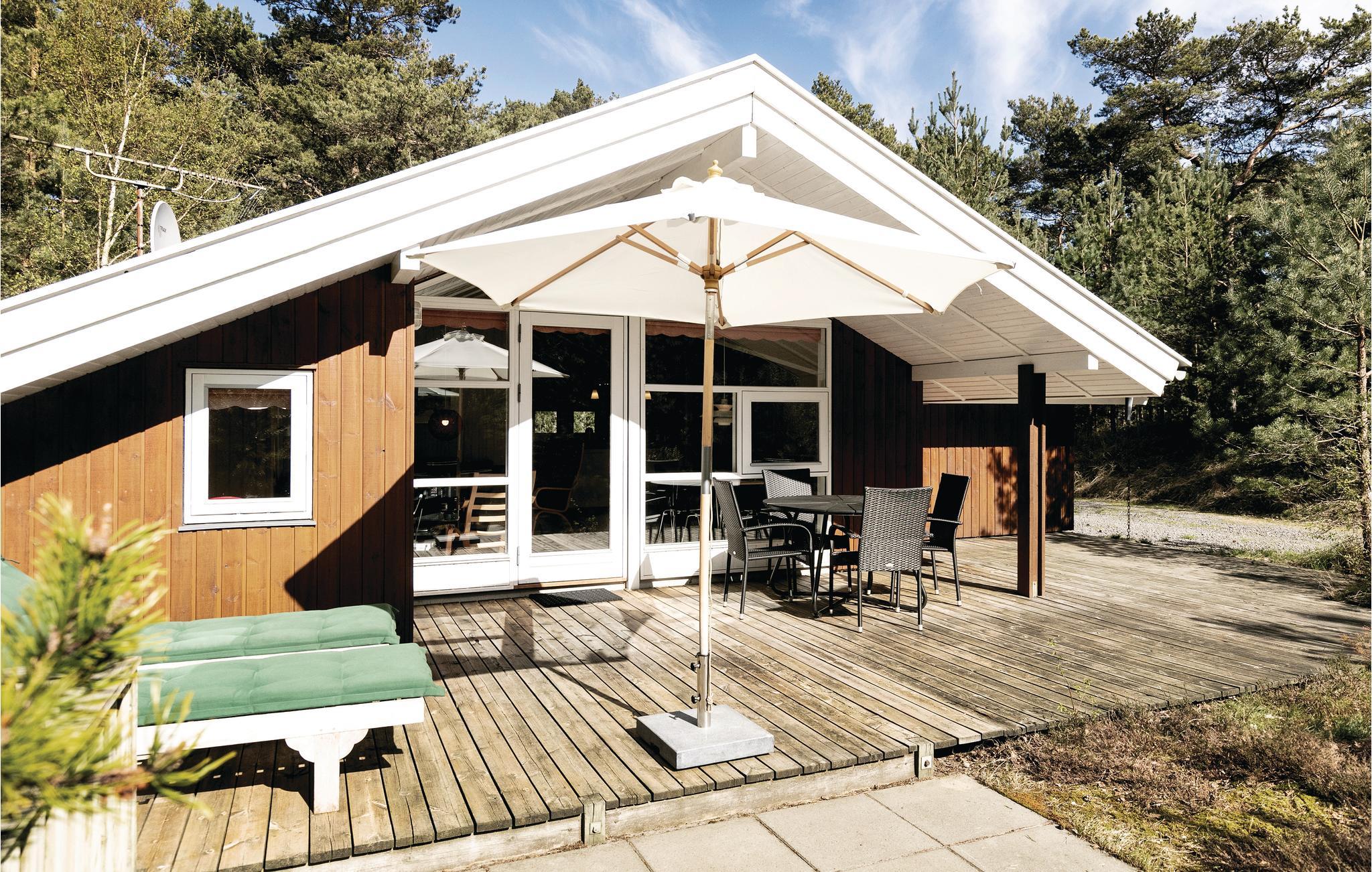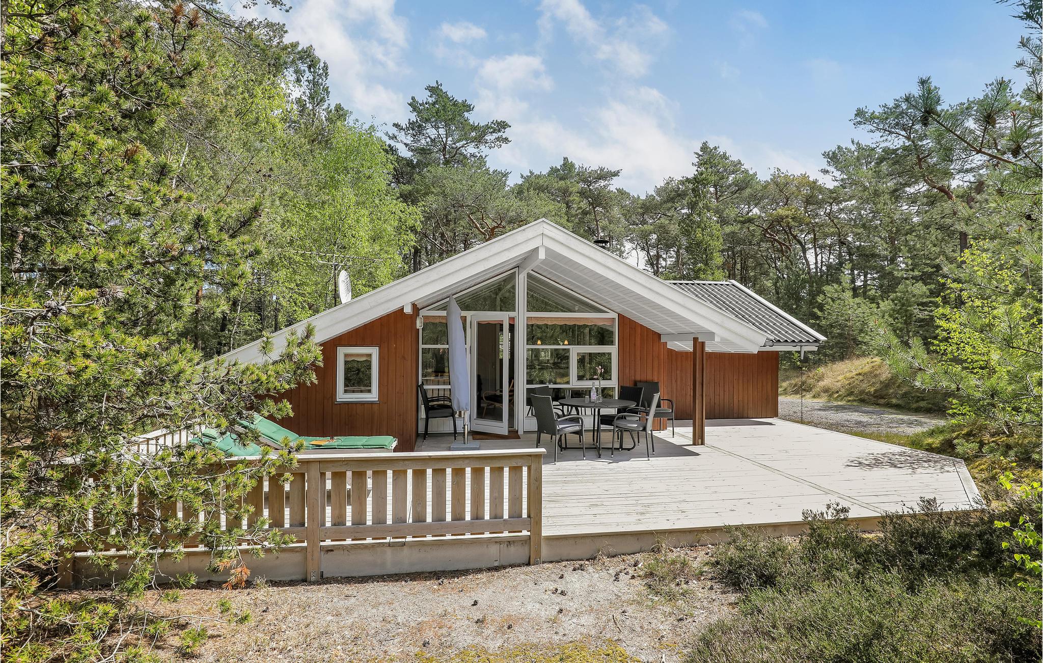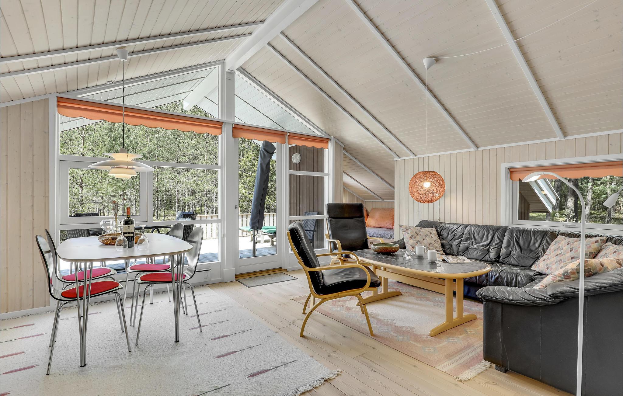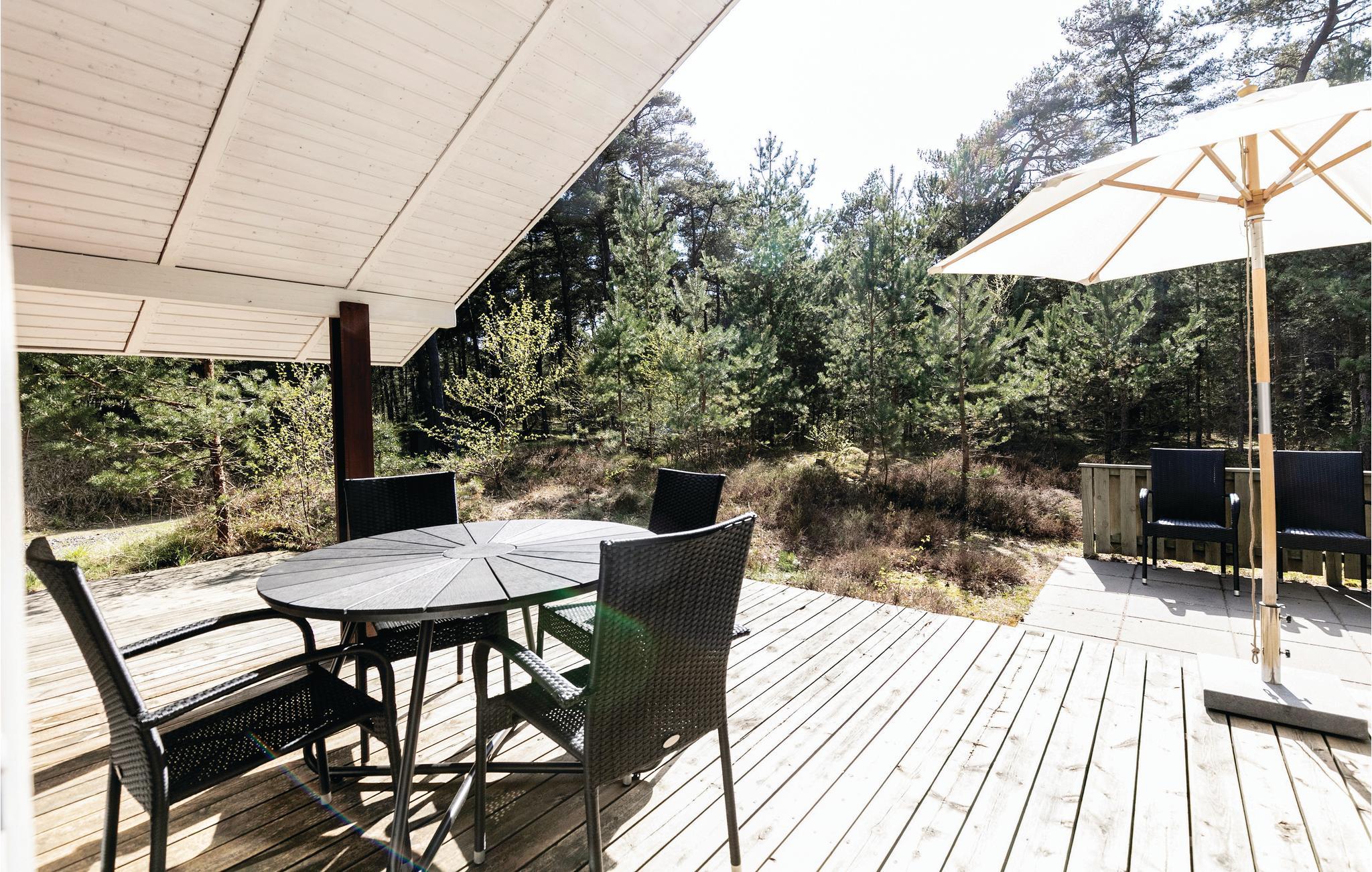 Einladendes und gepflegtes Ferienhaus mit moderner, offener Küche und gelegen nicht weit vom schönen Sandstrand, einer herrlichen Natur und dem Dueodde Golfplatz. Überall ist das Ferienhaus behaglich, die hellen Holzverkleidungen an den Wänden die schrägen Decken verleihen dem Inneren eine schöne Atmosphäre. Abends können Sie sich in gemütliche Sofas und Lehnstühle zurückziehen. Für ein Mittagsschläfchen gibt es einen Alkoven. Auf der Terrasse steht ein Grill. Im gut ausgestatteten Haus genießen Sie das Internet gratis. Beheizt wird es mit einer Wärmepumpe und einen Kaminofen, damit es auch richtig gemütlich ist. In der Nachbarschaft liegen große Naturgrundstücke, gute Wanderwege und einladende Joggingstrecken. Schön nahe ist der Strand zu finden. Das Haus ist ideal für einen Urlaub in jeder Jahreszeit.