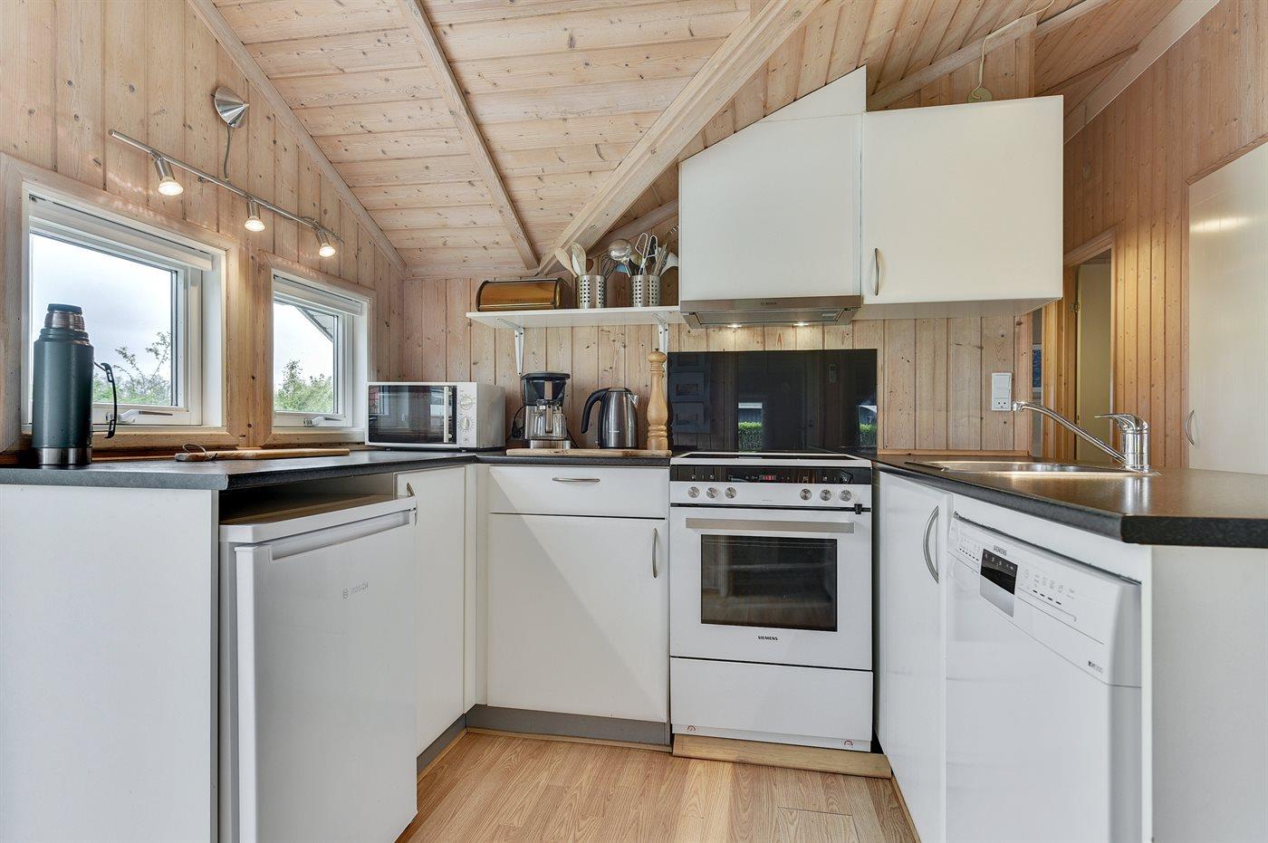 Die Küche ist mit Kühlschrank ausgestattet. Außerdem gibt es 4 Keramik-Kochfelder, Umluftofen, Mikrowelle sowie Geschirrspüler.