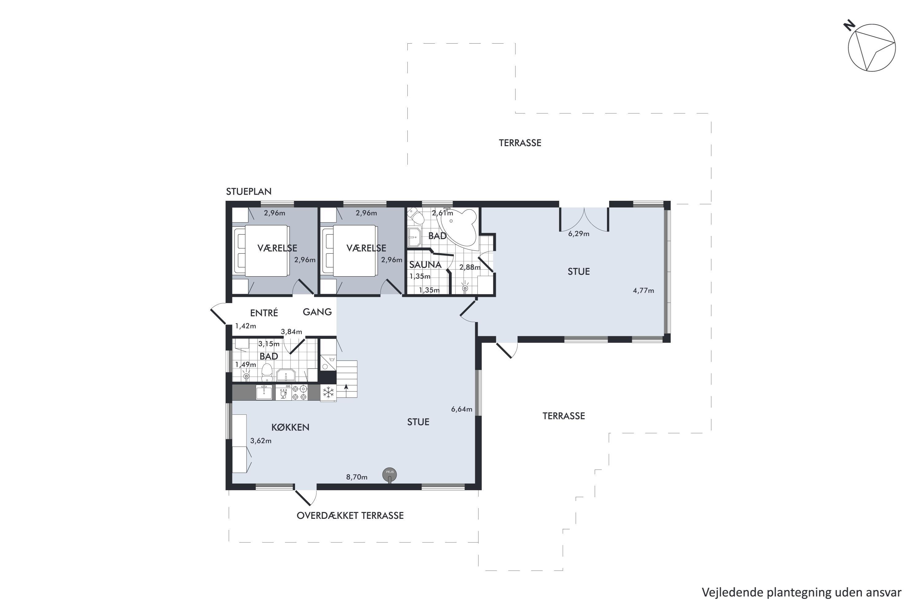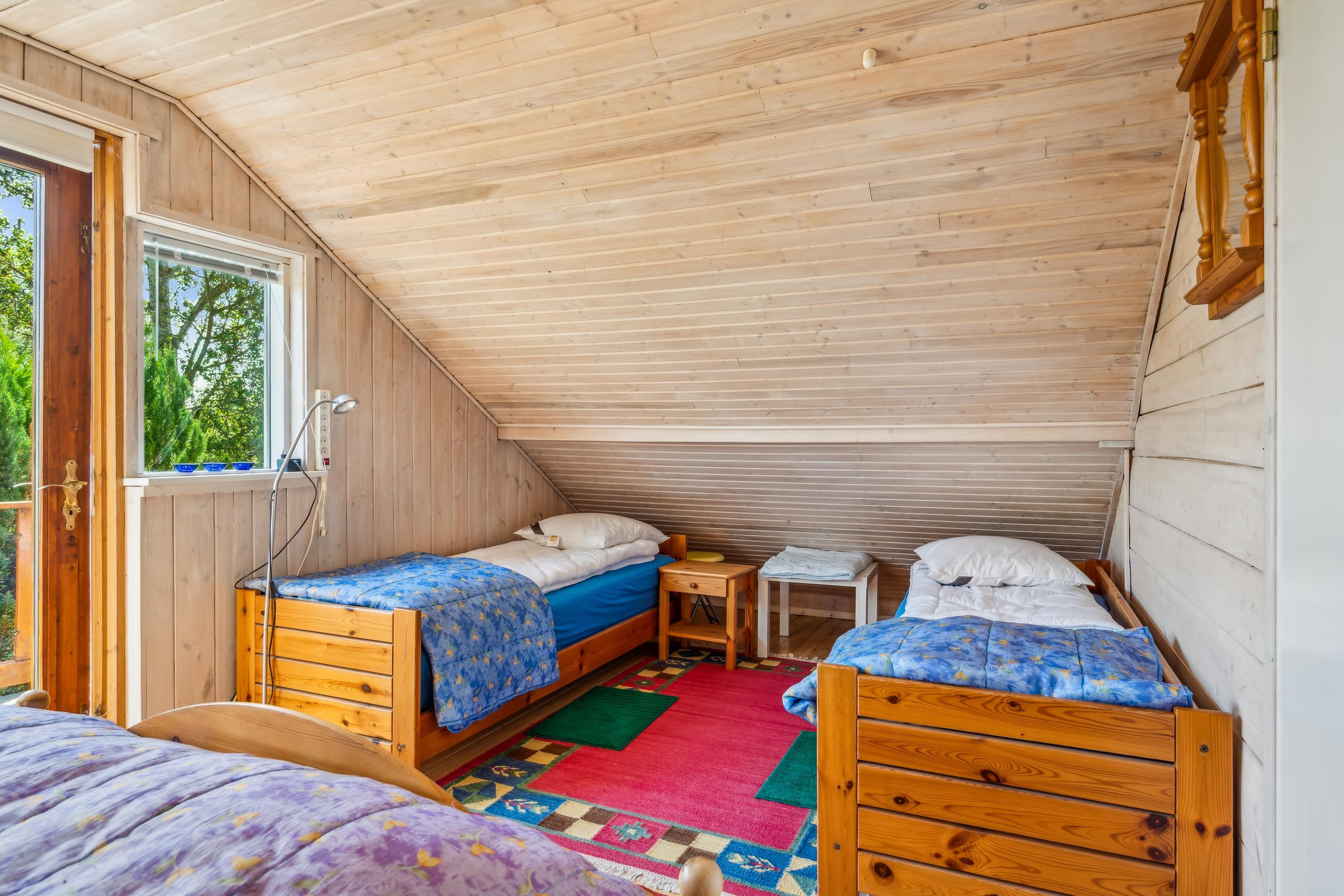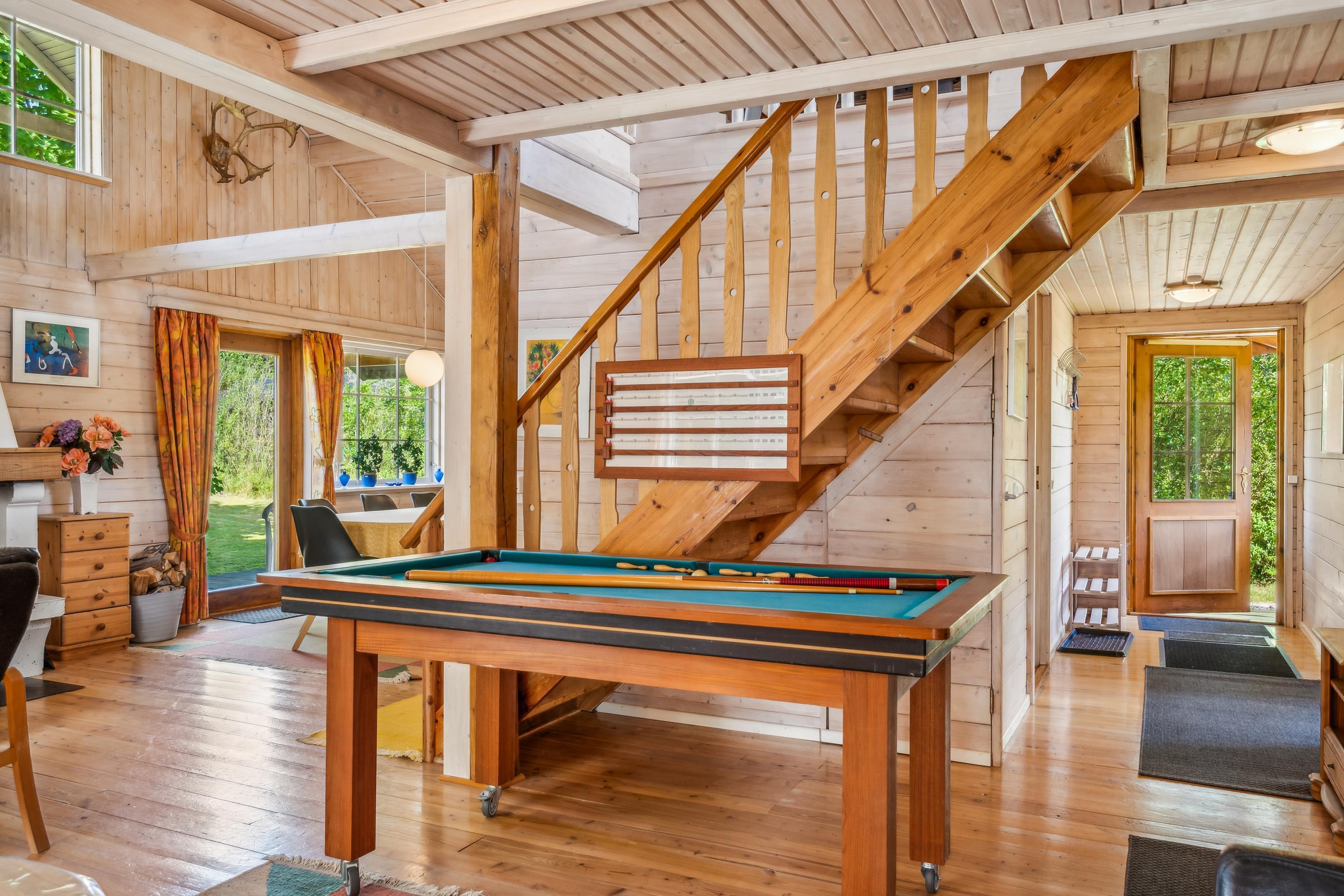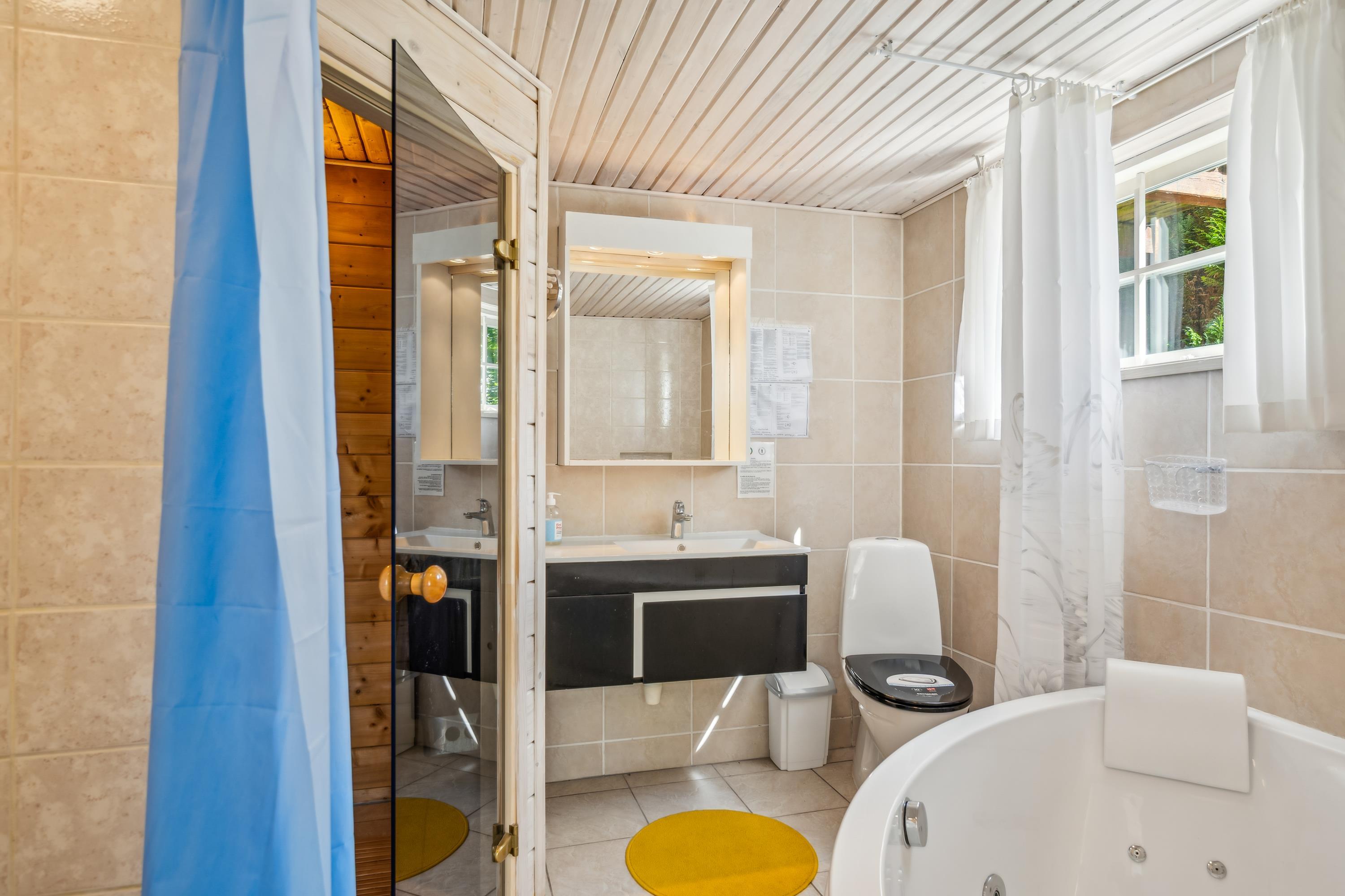Die rustikale Atmosphäre im geräumigen, hellen Wohnzimmer in bis zum Dachfirst hin offener Bauweise wird von den sichtbaren Deckenbalken und dem schönen Kamin mit Ofeneinsatz betont. Schöne Lounge-Ecke mit TV mit dänischen (inkl. TV2) und deutschen Programmen, CD-Spieler und Radio. Essplatz für acht Personen. Die Küche liegt in offener Verbindung zum Wohnzimmer und ist mit Glaskeramikherd, Kühl-/Gefrierkombination, Geschirrspüler und Mikrowelle ausgestattet. An das Wohnzimmer schließt sich der große, gut möblierte Wintergarten an mit Fliesenboden, Fußbodenheizung und Ausgang auf die geflieste Terrasse. Die acht Schlafplätze verteilen sich auf zwei Zimmer im Erdgeschoss und ein Zimmer im 1. Stock – alle mit Doppelbett – sowie einen Hängeboden mit zwei Einzelbetten. Das Zimmer im 1. Stock hat zudem einen Balkon. Auf dem Hängeboden befindet sich eine Aktivitätsecke mit Tischfußballspiel. Unter der Treppe steht ein kleiner mobiler Billardtisch. Im Erdgeschoss befinden sich zwei schicke Badezimmer mit Dusche und Fußbodenheizung. Das kleinere ist mit Waschmaschine und Trockner ausgestattet, das größere mit Whirlpool und Sauna. Für die Kleinsten sind ein Kinderbett und ein Hochstuhl vorhanden. Internetzugang. Ein Haus, bei dem große Sorgfalt auf die Details verwendet wurde.