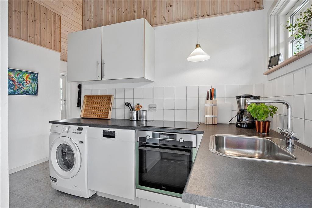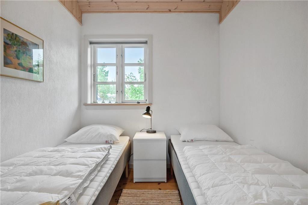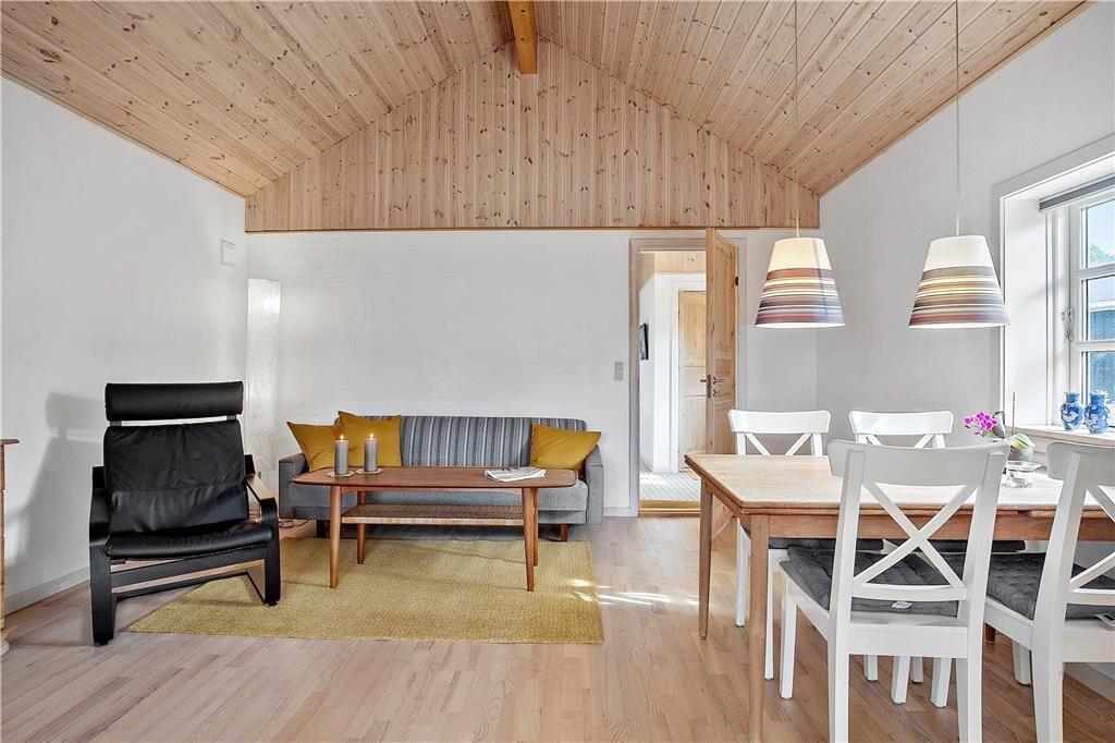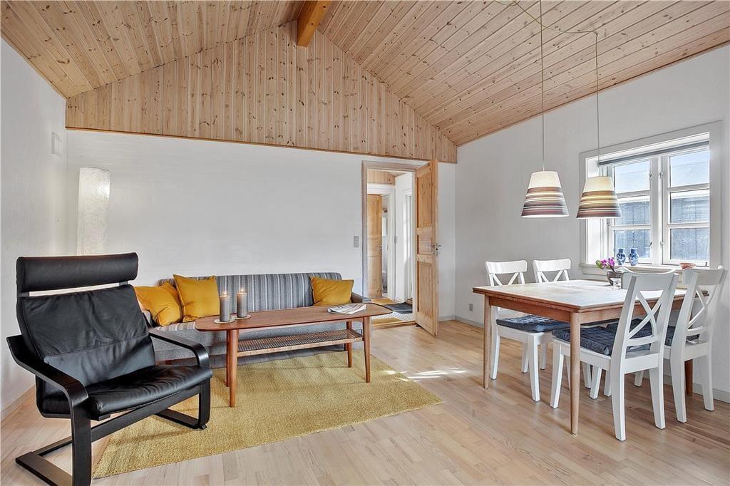 Dieses renovierte Ferienhaus verfügt über Küche und Wohnbereich, die separat liegen. Die helle und gut ausgestattete Küche mit Einbauherd mit Ceran-Kochfeldern, Geschirrspülmaschine, Kühlschrank mit kleinem Gefrierfach, Mikrowelle und Waschmaschine, hat einen Ausgang zur Terrasse. Im Wohnzimmer, ebenfalls mit Zugang zur Terrasse, befinden sich ein gemütlicher Essbereich, ein Sofa sowie der Fernseher mit dänischen Sendern sowie deutschem ZDF, Chromecast. Das Bad mit Duschnische ist gefliest und verfügt über eine Fußbodenheizung. Von den beiden Schlafzimmern ist das eine mit einem Doppelbett und das andere mit zwei Einzelbetten ausgestattet. Das Haus wird mit Wärmepumpe und elektrischen Heizkörpern geheizt.