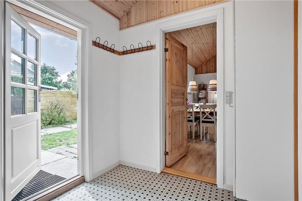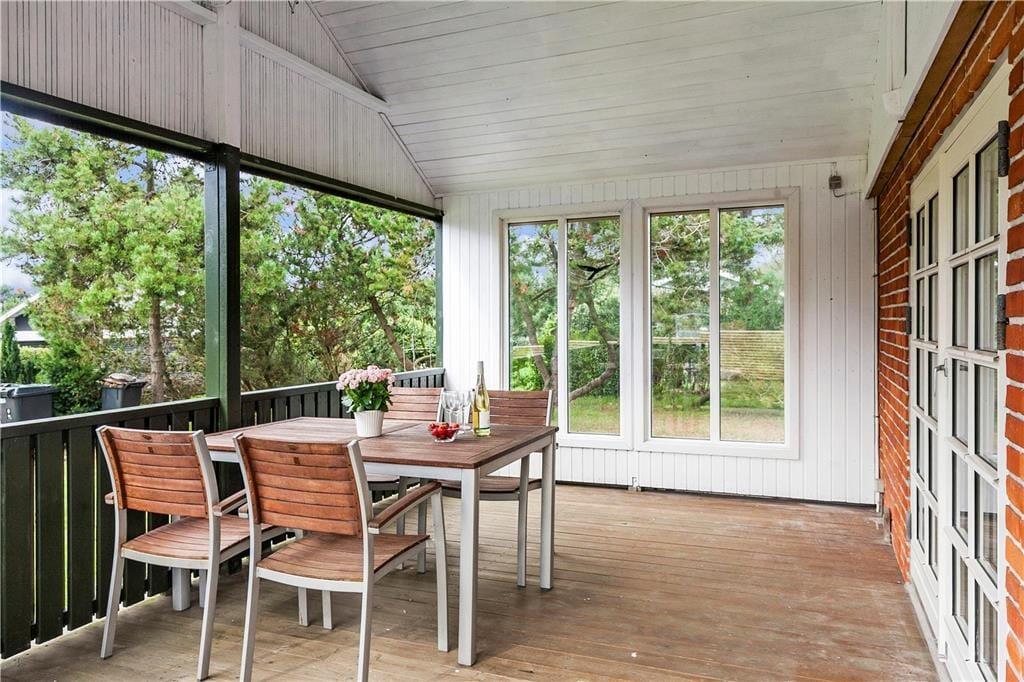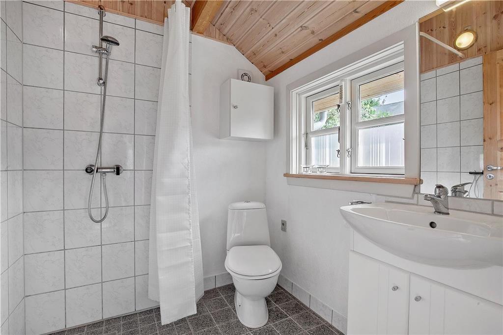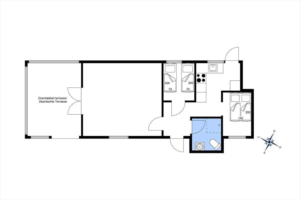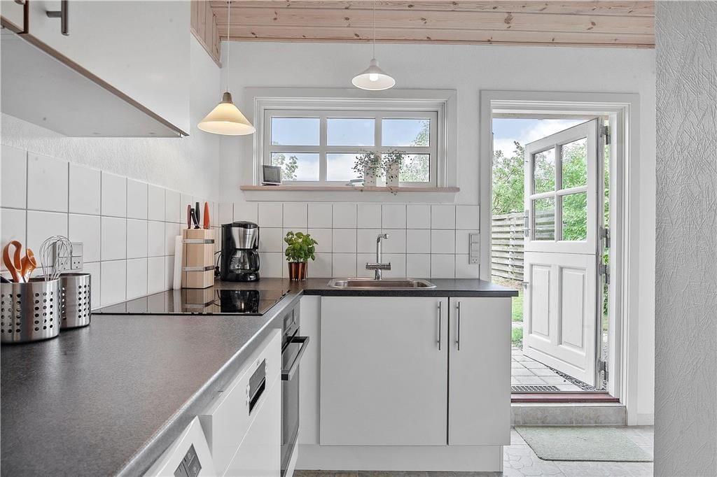 Dieses renovierte Ferienhaus verfügt über Küche und Wohnbereich, die separat liegen. Die helle und gut ausgestattete Küche mit Einbauherd mit Ceran-Kochfeldern, Geschirrspülmaschine, Kühlschrank mit kleinem Gefrierfach, Mikrowelle und Waschmaschine, hat einen Ausgang zur Terrasse. Im Wohnzimmer, ebenfalls mit Zugang zur Terrasse, befinden sich ein gemütlicher Essbereich, ein Sofa sowie der Fernseher mit dänischen Sendern sowie deutschem ZDF, Chromecast. Das Bad mit Duschnische ist gefliest und verfügt über eine Fußbodenheizung. Von den beiden Schlafzimmern ist das eine mit einem Doppelbett und das andere mit zwei Einzelbetten ausgestattet. Das Haus wird mit Wärmepumpe und elektrischen Heizkörpern geheizt.