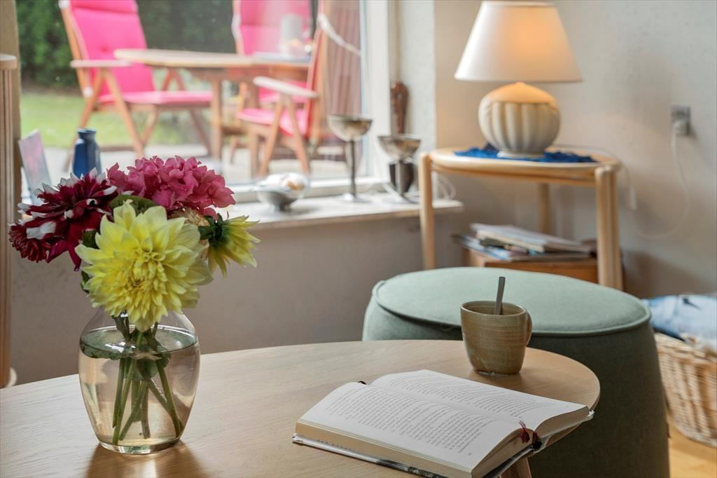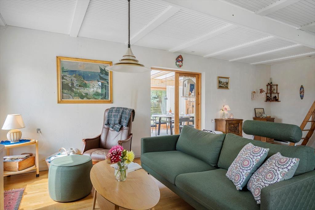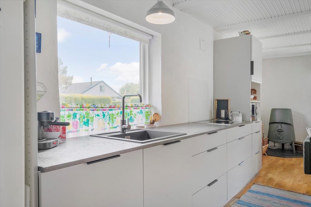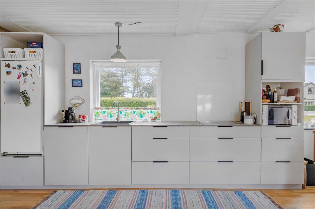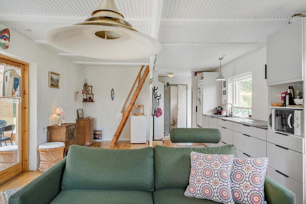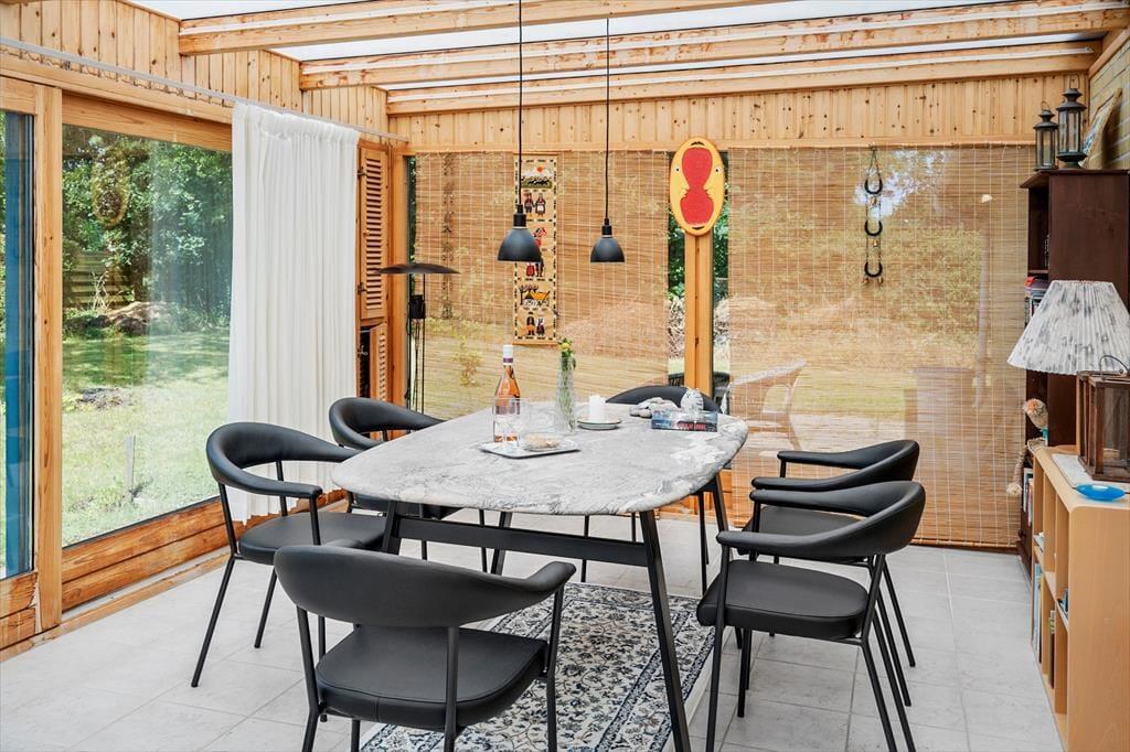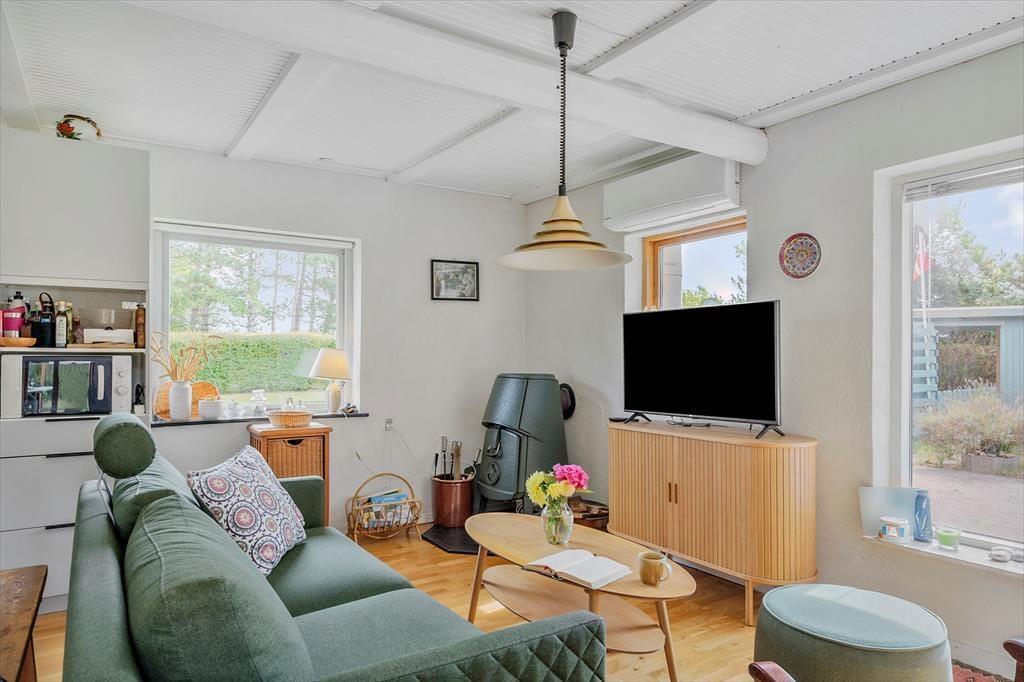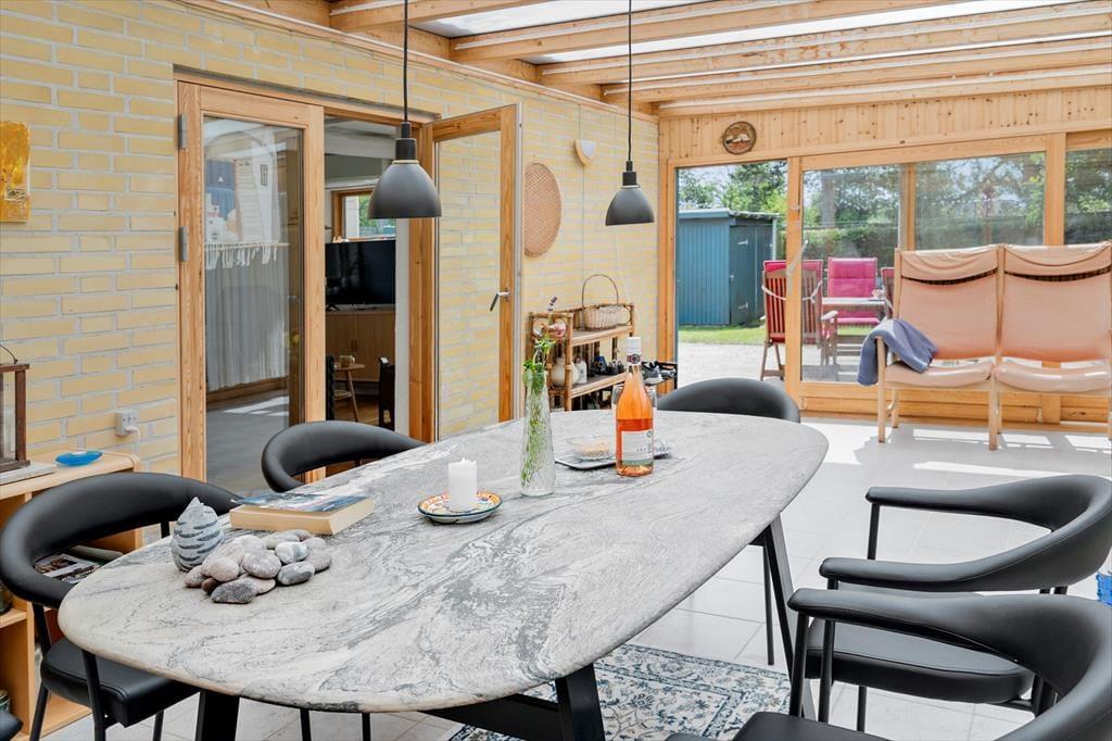 Willkommen in deinem Ferienhaus: Das Ferienhaus bietet eine einladende Kombination aus Küche und Wohnbereich, die eine gemütliche Atmosphäre schafft. Die helle, moderne Küche aus dem Jahr 2021 ist gut ausgestattet mit Kochplatten, Mikrowelle, Geschirrspüler sowie Kühl- und Gefrierschrank, was das Kochen zum Vergnügen macht. Im angrenzenden Wohnzimmer können Sie entspannen, mit direktem Zugang zur Terrasse, einem charmanten Essbereich sowie komfortablen Sofas und Sesseln. Hier finden Sie auch einen Fernseher mit dem Norlys-TV-Paket, das dänische, schwedische und norwegische Kanäle bietet, sowie einen Chromecast, mit dem Sie Ihre Lieblingsprogramme streamen können (eigene Abonnements erforderlich). Ein weiteres Highlight ist der Wintergarten, der die Sommerabende verlängert und mit Tisch und Stühlen ausgestattet ist.