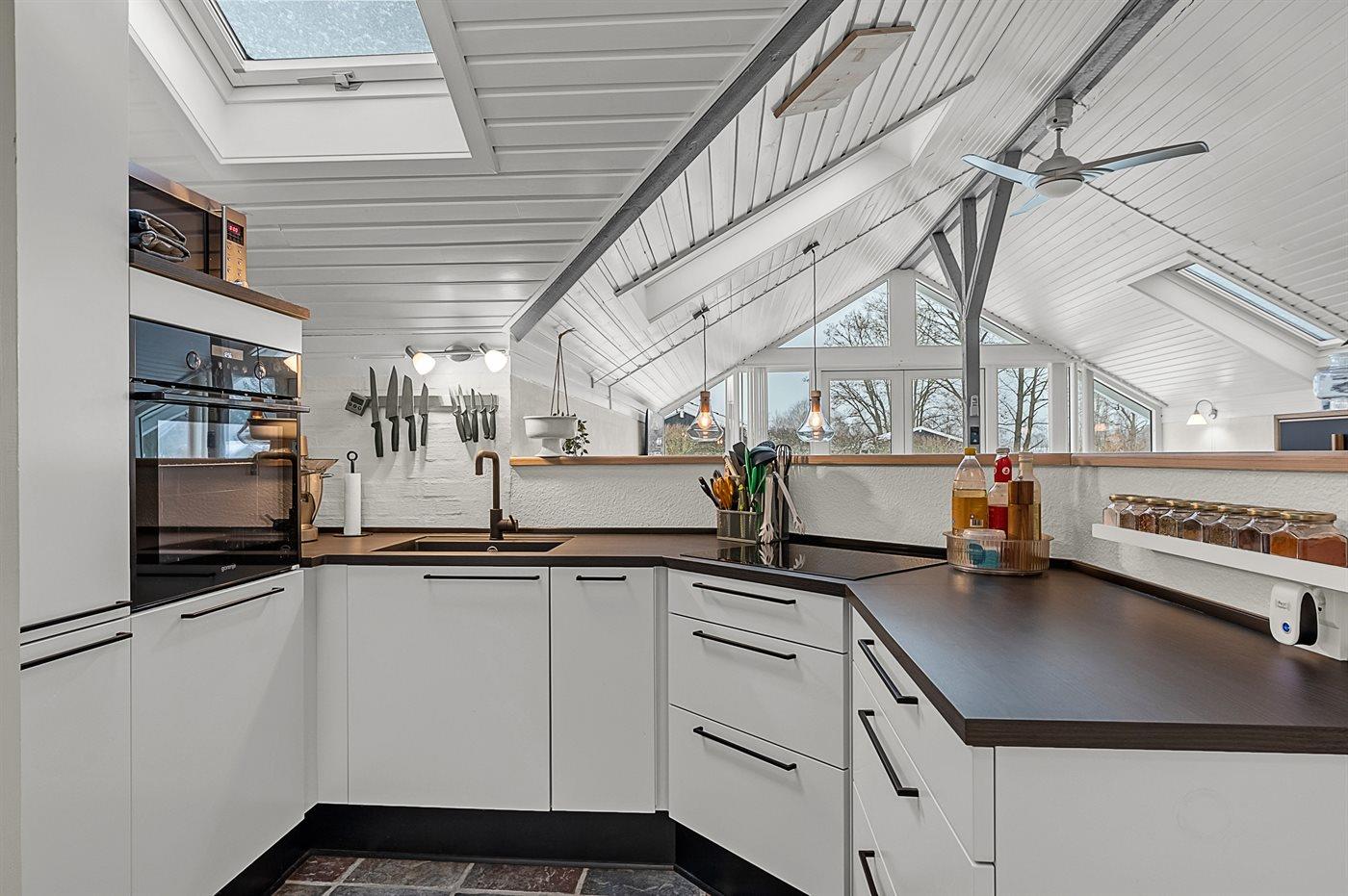 Die Küche ist mit Kühlschrank ausgestattet. Außerdem gibt es 4 Induktions-Kochzonen, Umluftofen sowie Geschirrspüler.