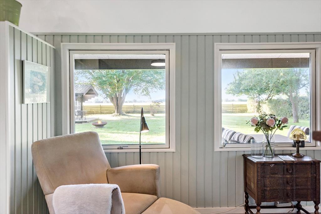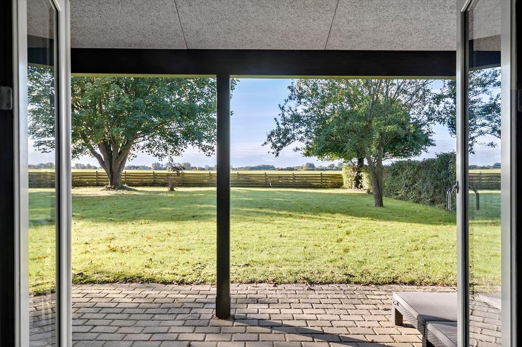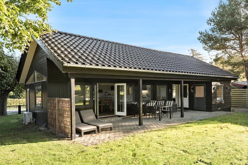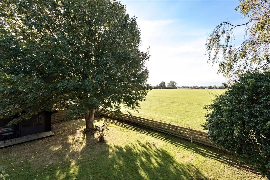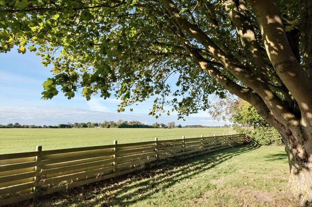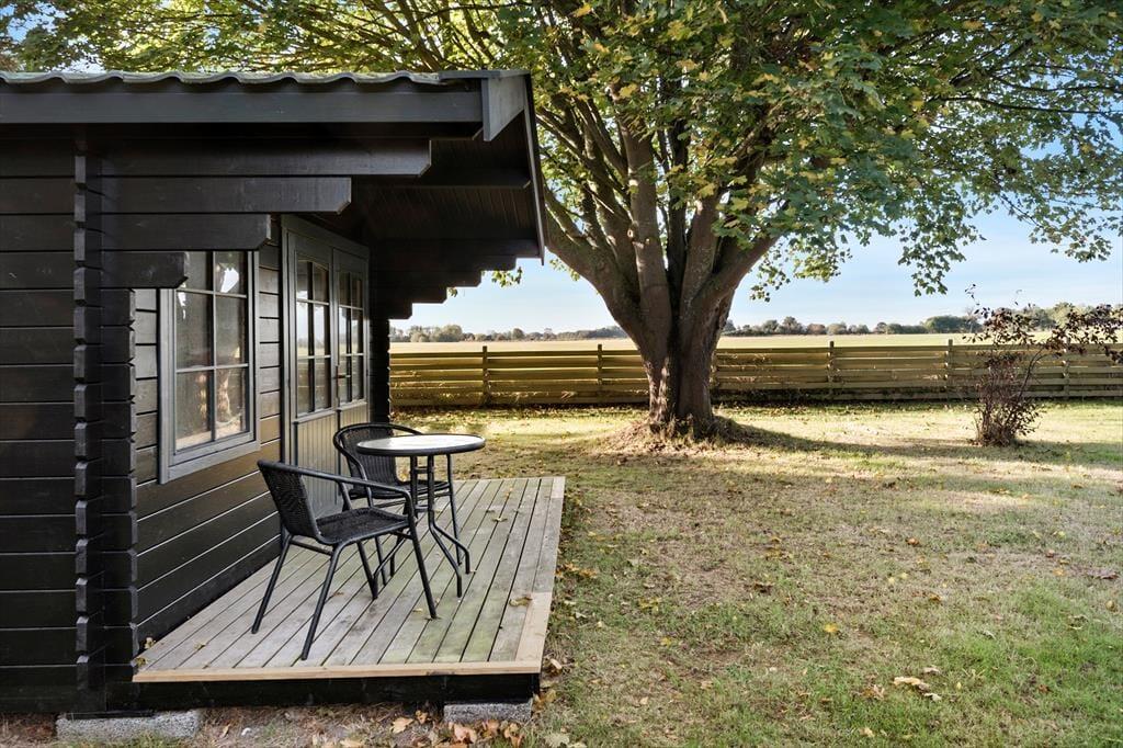 Das Ferienhaus liegt auf einem großen Grundstück mit Aussicht über offene Felder. An eine Seite des Hauses schmiegt sich eine überdachte Terrasse. Während die Terrasse zu erholsamen Tagen und Abenden einlädt, animiert das Grundstück hingegen zum Umhertollen und Spielen.