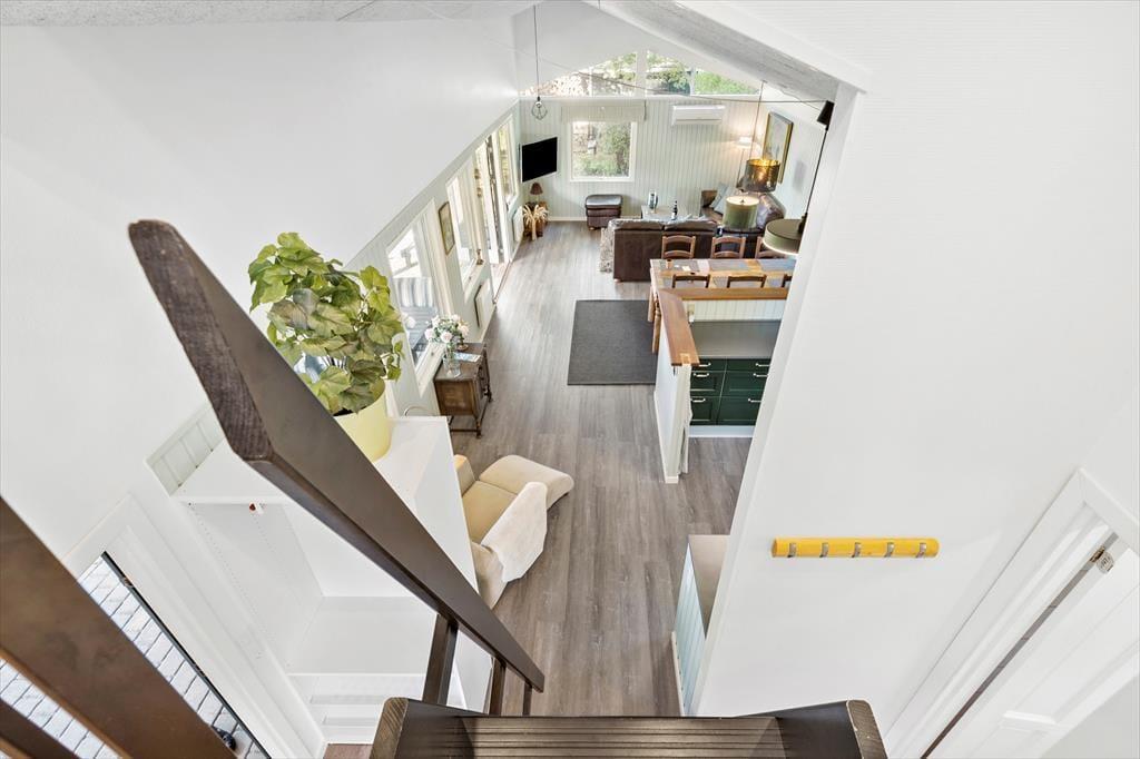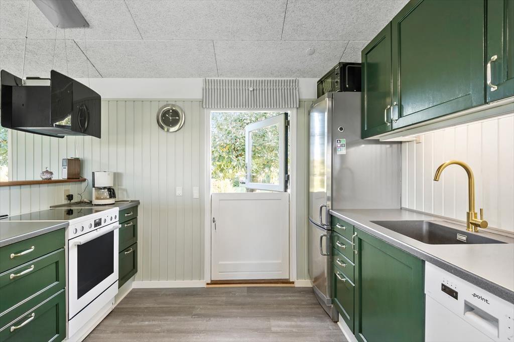 Die Küche und der Wohnraum bilden eine offen verbundene Einheit. Von der ansprechende Küche können Sie hinaus in den Vorgarten treten. Die Küche beinhaltet einen Kühlschrank mit Gefrierfach, einen Geschirrspüler, einen Backofen, einen Dunstabzug und vier Kochplatten. Ein Wasserkocher, eine Kaffeemaschine und eine Mikrowelle sind ebenfalls vorhanden. Im gemütlichen Wohnraum werden Sie von einem Essplatz, Sofas, einer Wärmepumpe und Elektroheizkörpern in Empfang genommen. Ein Fernseher und WiFi sorgen für Unterhaltung und Abwechslung. Der Wohnraum verfügt über einen Ausgang auf die Terrasse. Auf dem Schlafboden stehen zwei weitere Schlafplätze zur Verfügung. Das ansprechende Badezimmer umfasst eine Fußbodenheizung, eine große Duschnische, ein Waschbecken und ein WC.