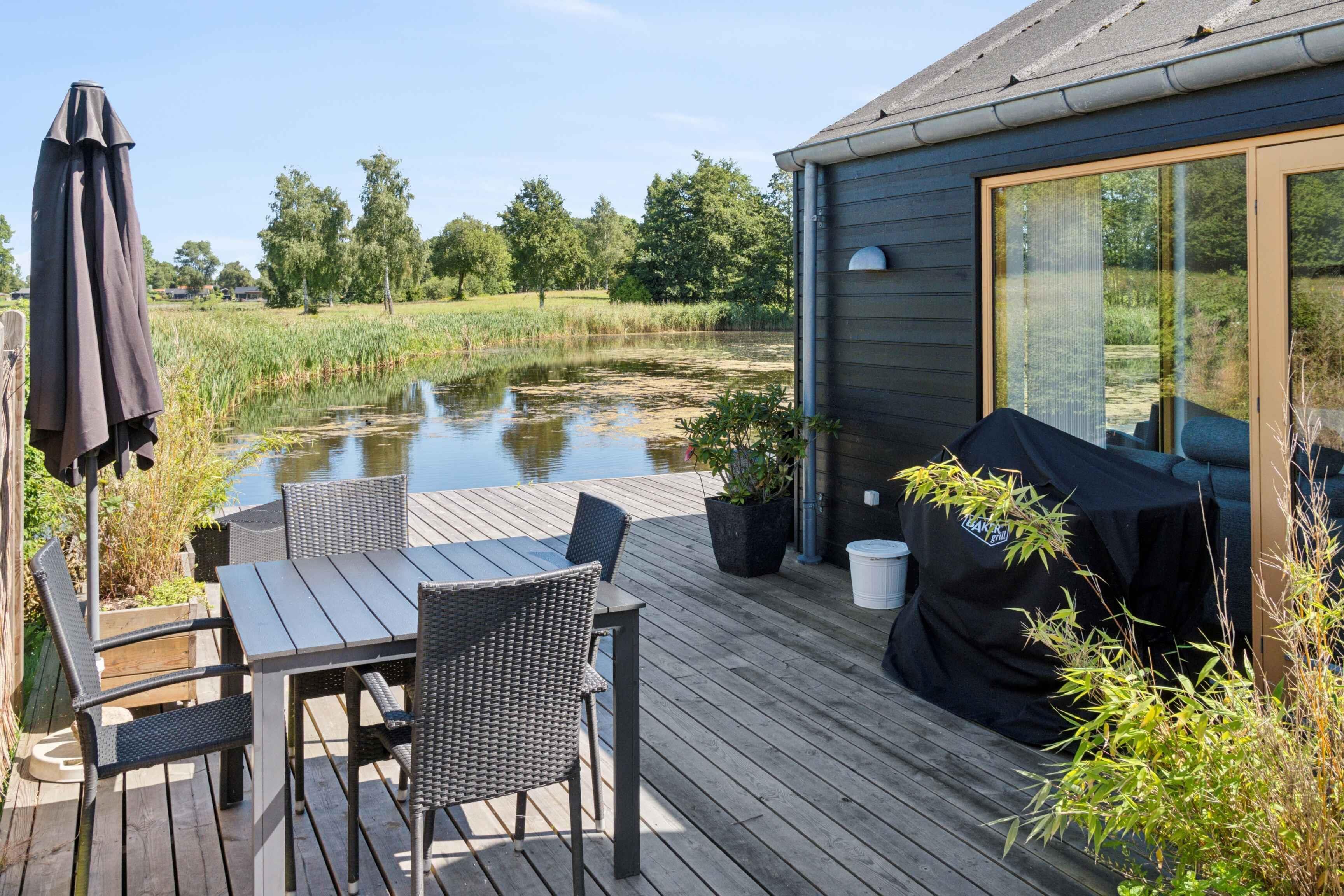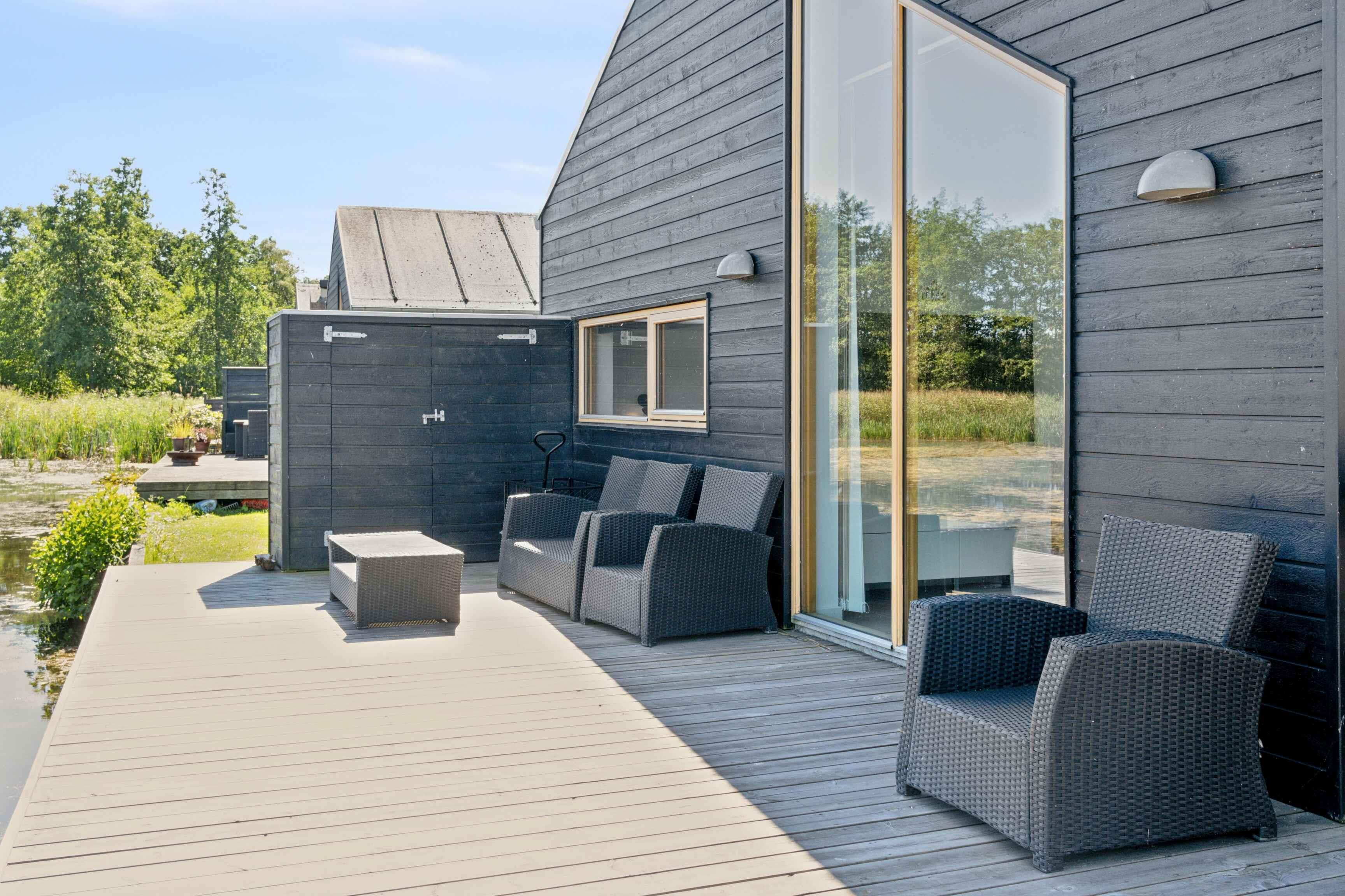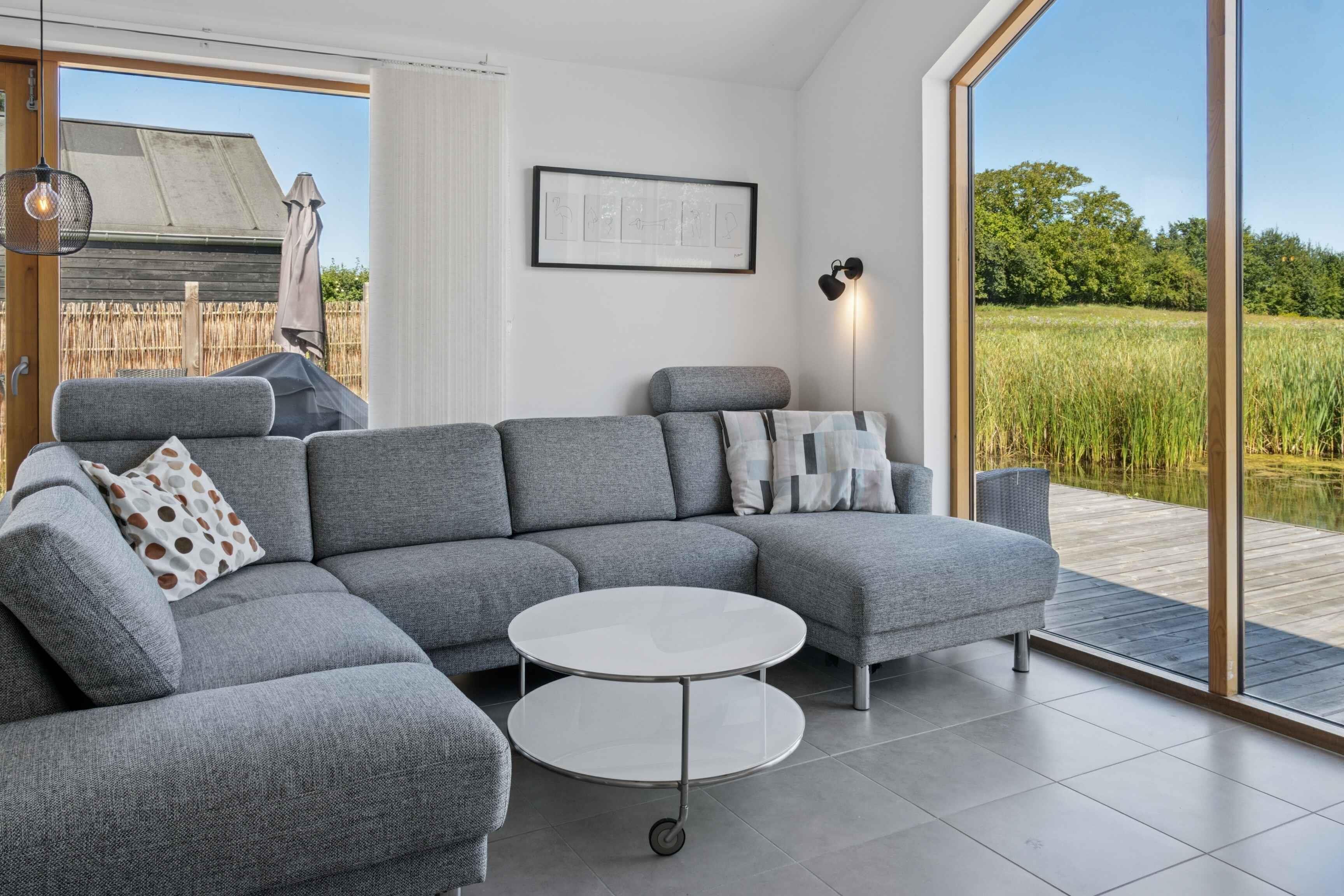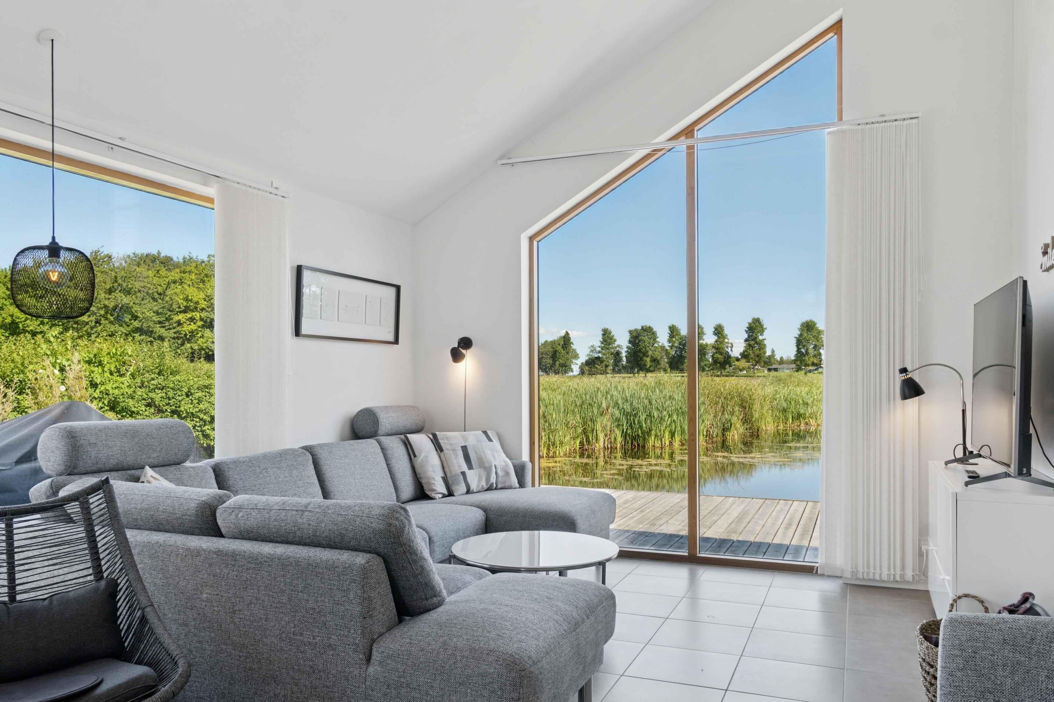 Architektenhaus direkt am See in Kongsnæs mit großer Terrasse und Panoramablick. Familienfreundlich mit Spielboden, Kamin, Spielplatz, Badesteg, Bosch-Waschsäule und kabellosem Staubsauger. Nahe Wald, Strand und Stubbekøbing.