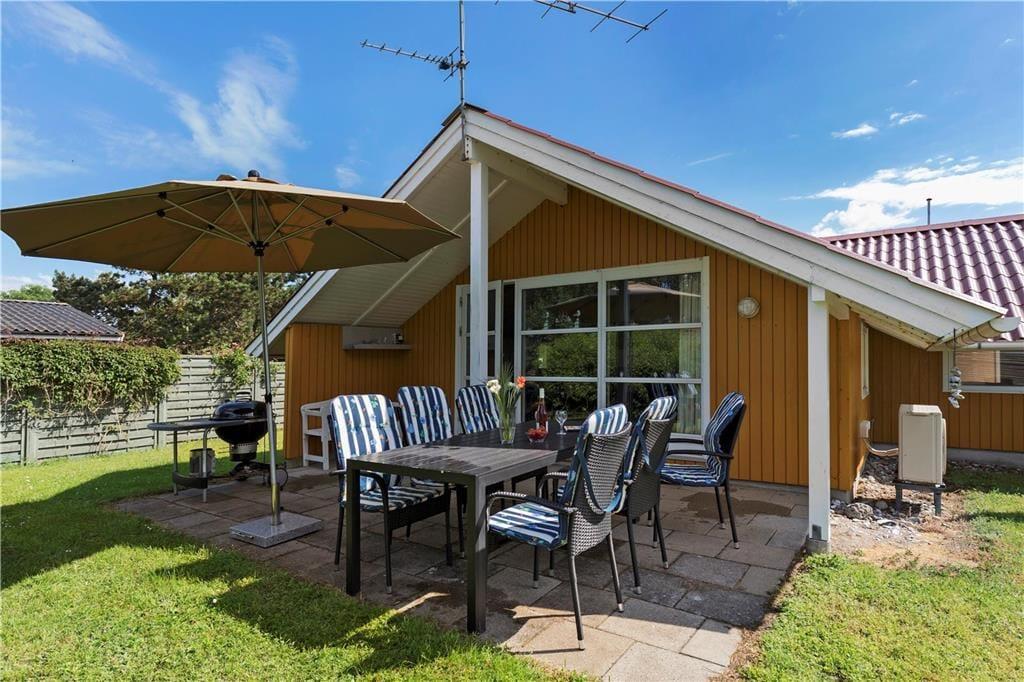 Zum Haus gehört ein 681 m² großes Grundstück. Eine Teilweise überdachte geflieste Terrasse vor das Haus und eine Geflieste Terrasse am Eingang. Zum Ferienhaus gehören auch Gartenmöbeln, Sonnenschirm und Grill.