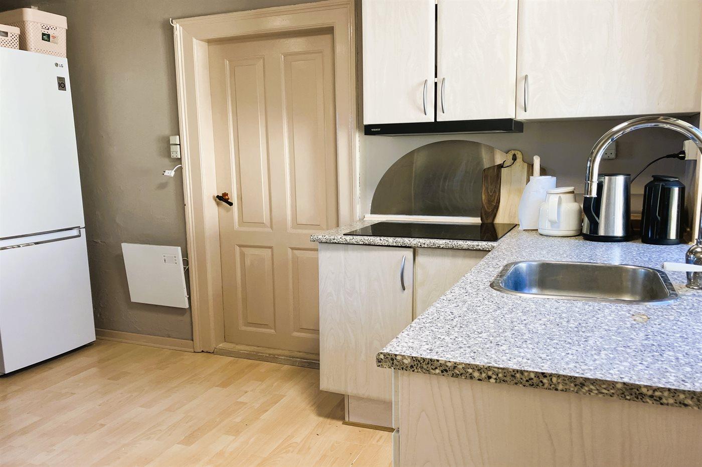 Die Küche ist mit Kühlschrank ausgestattet. Außerdem gibt es 4 Keramik-Kochfelder, Umluftofen, Mikrowelle.