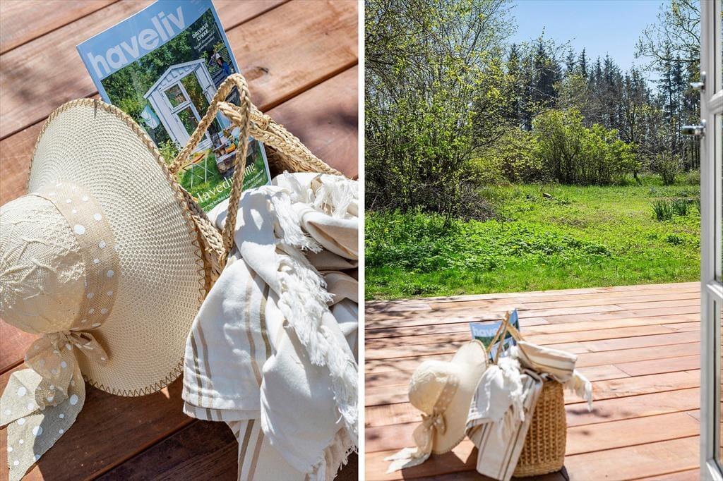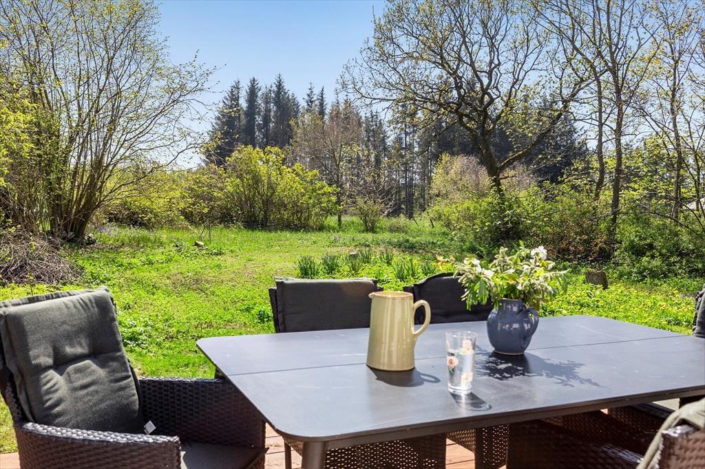 Das Haus fügt sich wunderbar in das große Naturgrundstück ein, das durch Bäume und anderen schönen Bewuchs geprägt wird. Rund um das Haus erstreckt sich eine Grasfläche. Vom Wohnraum treten Sie direkt hinaus auf die Südterrasse, auf der Gartenmöbel und Liegestühle für erholsamen Stunden im Freien bereitstehen. An warmen Sommertagen spendet ein Sonnenschirm kühlen Schatten. Der hauseigene Grill lädt allabendlich zu schönen Essen in friedvoller Umgebung ein.