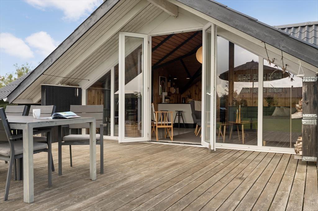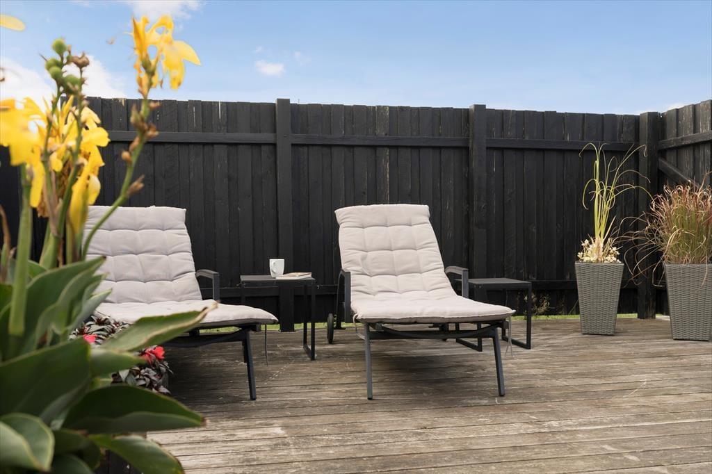 Die große, sonnige Holzterrasse rund um das Haus lädt perfekt zum Entspannen und gemütlichen Beisammensein im Freien ein. Hier kannst du den Morgenkaffee in der Sonne genießen, leckere Mahlzeiten grillen und an warmen Nachmittagen im Schatten ein Nickerchen machen. Der Garten, der an die Terrasse grenzt, ist uneinsehbar und grün, ideal zum Spielen für Kinder oder als friedlicher Ort für Erwachsene, um die Ruhe zu genießen. Du kannst die Vögel singen hören und die frische Brise vom Meer spüren, das nur einen kurzen Spaziergang vom Ferienhaus entfernt liegt. Hier ist Platz für Aktivitäten und Entspannung - vielleicht mit einem guten Buch oder einem Badmintonspiel auf dem Rasen.