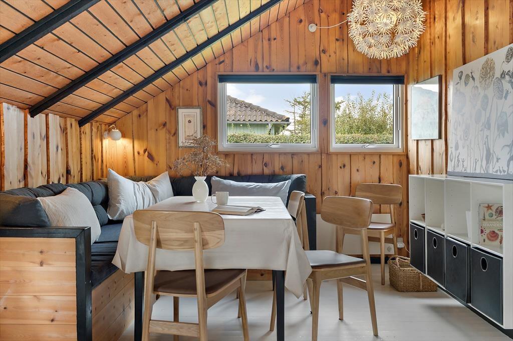 Wenn du dieses gemütliche Ferienhaus betrittst, empfängt dich eine warme und einladende Atmosphäre. Die sichtbaren Balken im ganzen Haus und die hohe Decke im großen offenen Wohnzimmer schaffen eine authentische Sommerhausstimmung. Das Wohnzimmer ist geräumig und hell, mit einem Holzofen als natürlichen Treffpunkt für gemütliche Abende mit Familie und Freunden. Die Küche ist offen zum Wohnbereich, was es einfach macht, zusammen zu sein, während Mahlzeiten zubereitet werden. Hier gibt es alles, was du brauchst, um köstliche Speisen zuzubereiten, und wenn es Zeit zum Essen ist, könnt ihr euch am Esstisch mit Blick auf den Garten niederlassen. Das Haus bietet auch ein schönes, helles Badezimmer, ausgestattet mit modernen Annehmlichkeiten, um den Tag frisch und ausgeruht zu beginnen.