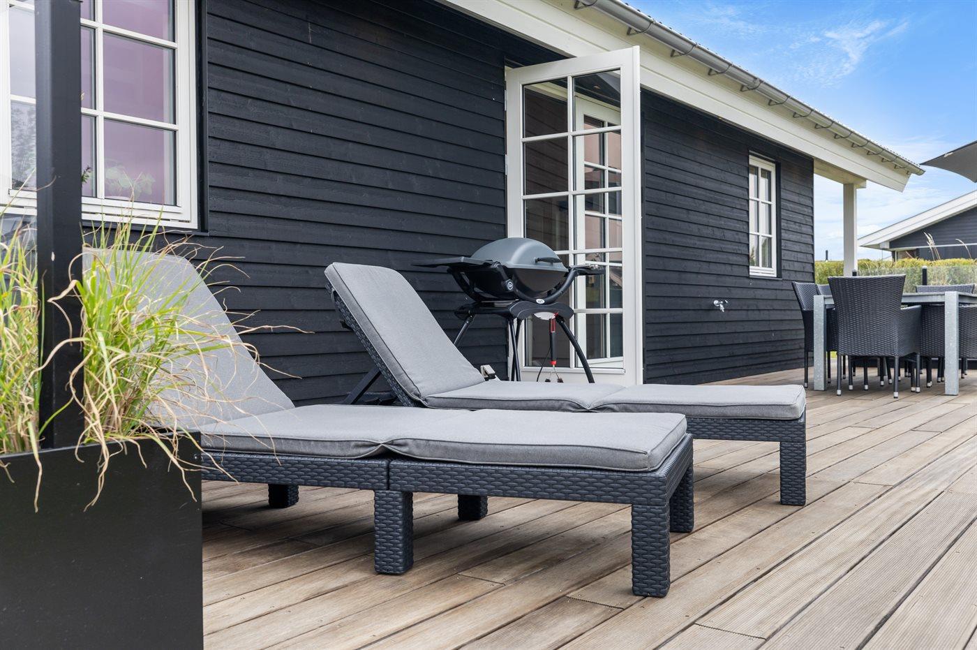 Die Ferienunterkunft liegt auf einem 724 m² großen Gartengrundstück. Das Grundstück ist eingezäunt. Die Entfernung zum Meer beträgt 350 m. Es gibt einen Badesteg in der Nähe. Die nächste Einkaufsmöglichkeit liegt 7800 m entfernt. In einem Abstand von 6500 m gibt es einen Golfplatz. Es steht ein offenes Terrassenareal zur Verfügung. Außerdem gibt es überdachte Terrasse. Es steht ein Grill zur Verfügung. Es ist ein Ladestecker für Elektroautos installiert. Ladestecker Typ 2. Mit einer Ladeleistung von 11 kW. Parkplatz auf dem Grundstück.