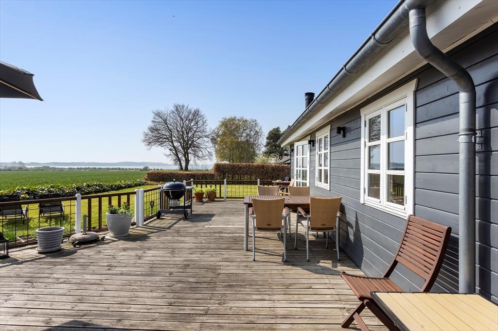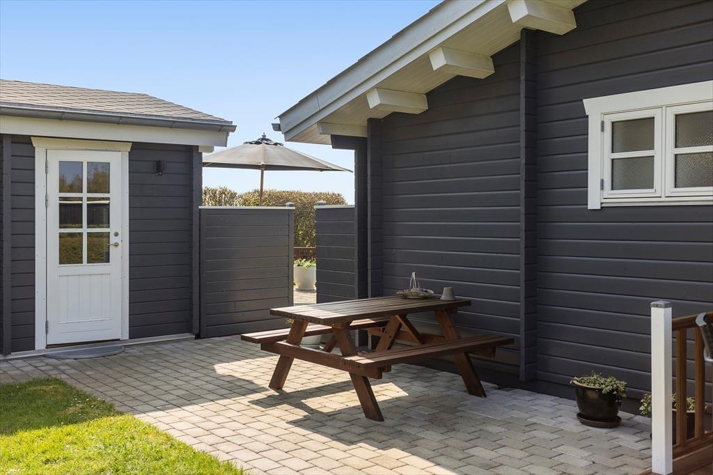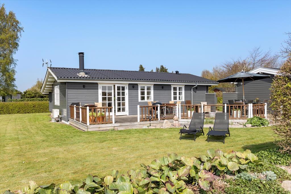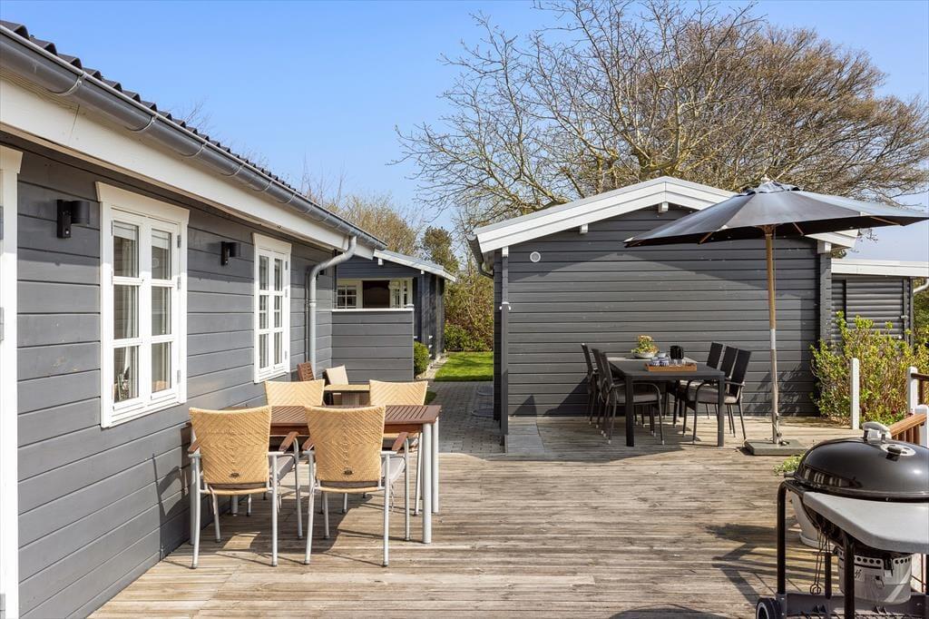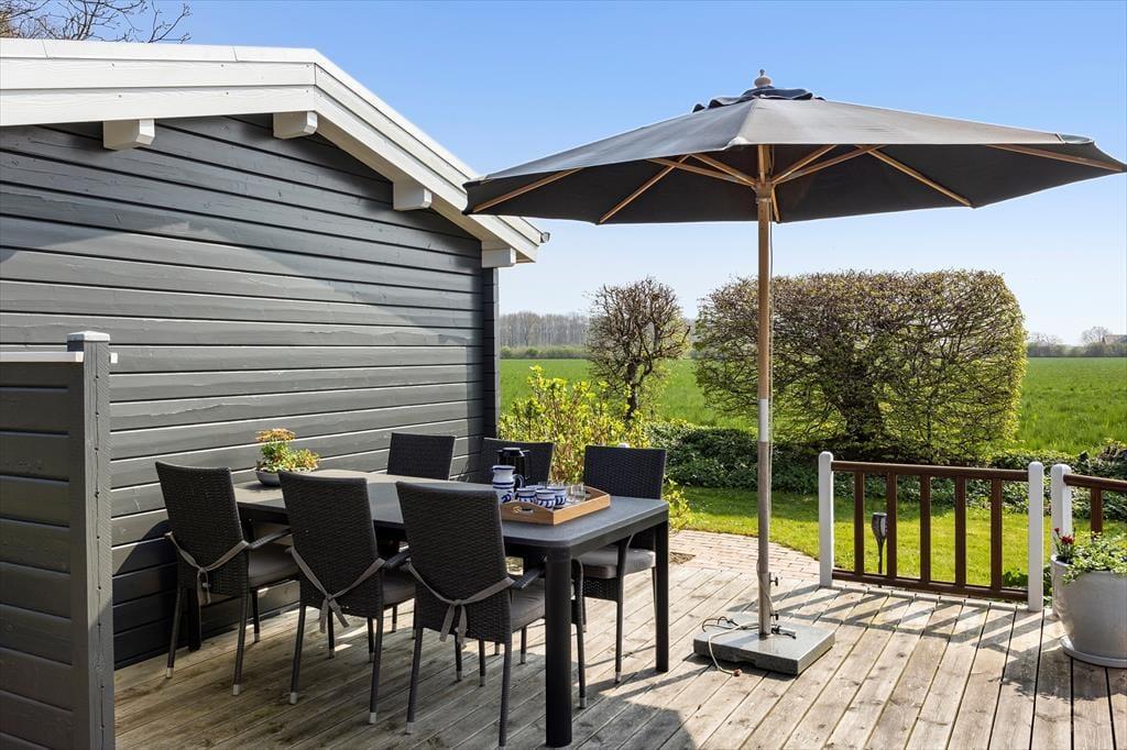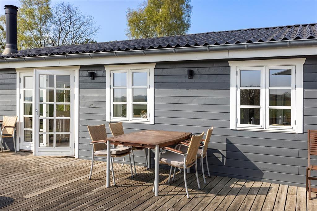 Der Außenbereich des Ferienhauses lädt zu langen Tagen in der Sonne und gemütlichen Stunden unter freiem Himmel ein. Die große Terrasse ist im Sommerhalbjahr das Herzstück des Hauses – hier können Sie den Morgenkaffee mit Blick auf die Lunkebugt genießen oder den Tag mit einem Glas Wein ausklingen lassen, während die Sonne im Meer versinkt. Die Terrasse bietet sowohl Sonne als auch Schatten und kann den ganzen Tag über genutzt werden. Der gepflegte Garten rund um das Haus bietet viel Platz zum Spielen für Kinder, während die Erwachsenen sich in einer Liege entspannen. Der nahegelegene Strand ist flach und kinderfreundlich – perfekt für Sandburgen, Planschspaß und entspannte Strandtage mit der ganzen Familie. Nach einem Bad im Meer können Sie sich auf der Terrasse erfrischen und die Sommerstimmung genießen.