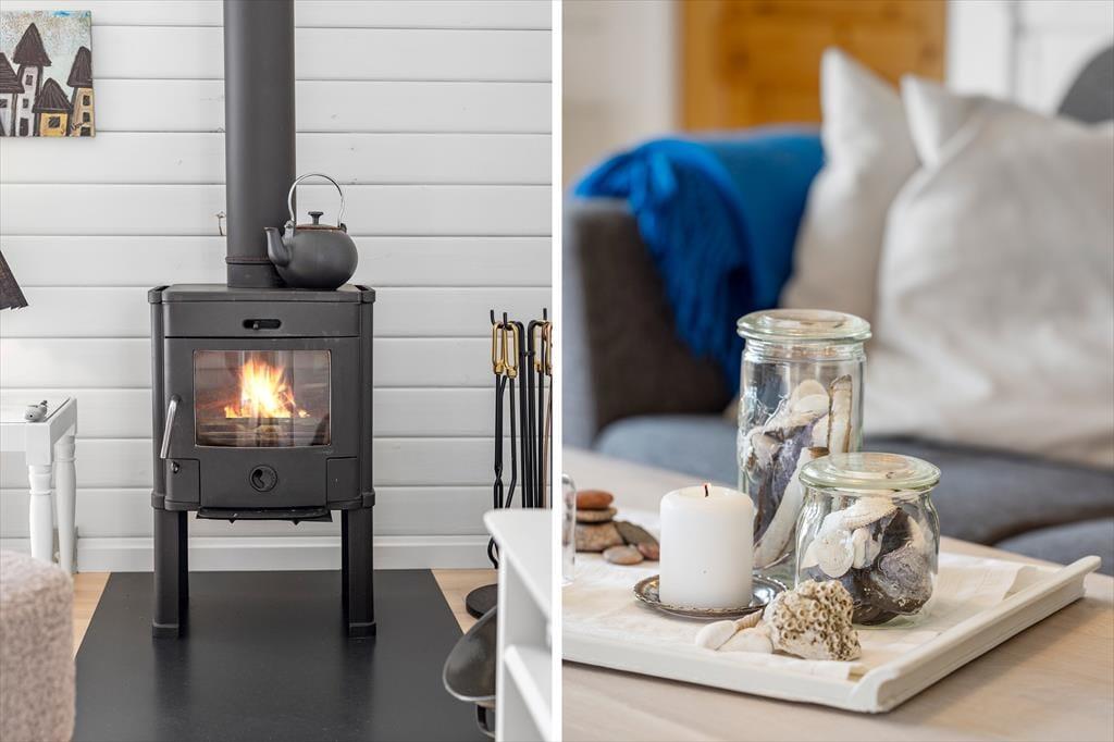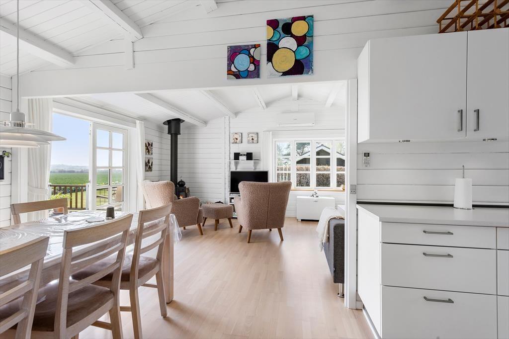 Im Inneren des Ferienhauses empfängt Sie eine warme und helle Atmosphäre, die sofort für Ruhe und Urlaubsstimmung sorgt. Das gemütliche Wohnzimmer mit Kaminofen ist der natürliche Treffpunkt für die ganze Familie – ideal für Spieleabende, gemeinsame Mahlzeiten oder einfach zum Entspannen nach einem Tag im Freien. Die offene Küche ist direkt mit dem Essbereich verbunden, sodass das Kochen zum sozialen Erlebnis wird. Vom Esszimmer aus haben Sie direkten Zugang zur großen Terrasse – eine perfekte Verbindung zwischen Innen und Außen. Das Haus verfügt über zwei schöne Schlafzimmer, beide einfach und komfortabel eingerichtet, um Ihnen erholsamen Schlaf zu bieten. Zusätzlich gibt es ein charmantes Gästehaus mit zwei weiteren Schlafplätzen – ideal für Teenager oder Gäste, die etwas mehr Privatsphäre wünschen. Das Badezimmer ist hell und funktional mit Dusche und modernen Annehmlichkeiten – perfekt, um erfrischt in den Tag zu starten.