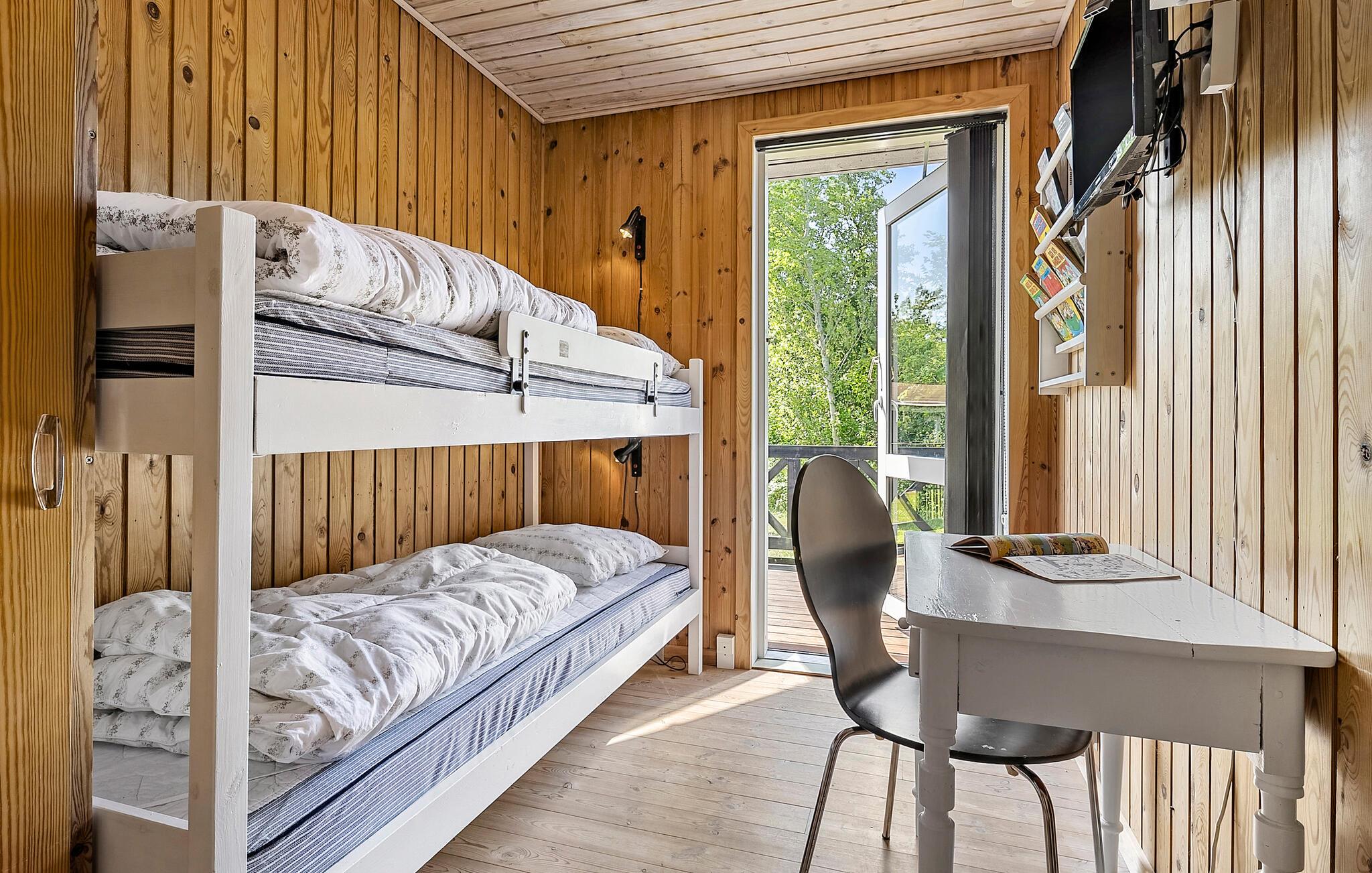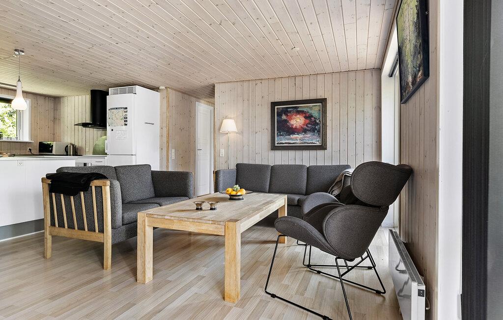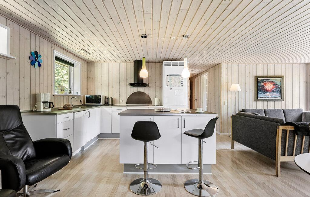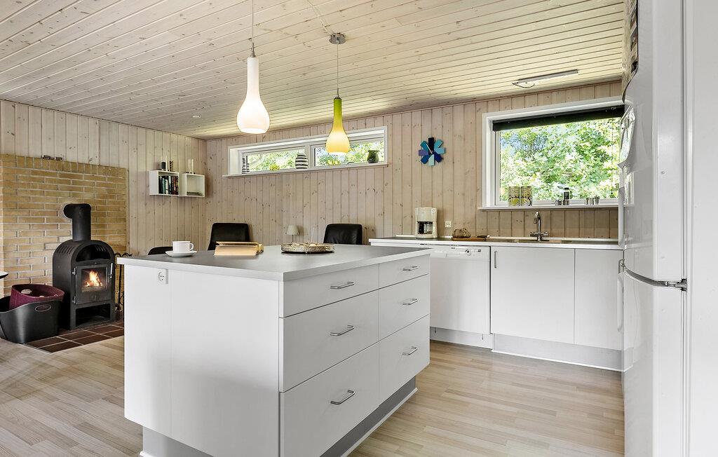 Ihr Ferienhaus empfängt Sie mit einer wohnlichen Atmosphäre und einer durchdachten Ausstattung. Der Innenbereich überzeugt mit einer freundlichen Holzverkleidung. Entspannen Sie auf dem Sofa, lesen Sie ein Buch oder versammeln Sie sich zu einem Spieleabend am knisternden Kaminofen. Kochen Sie gemeinsam in der offen gestalteten Küche und genießen Sie Ihre Mahlzeiten am einladenden, langen Esstisch mit Platz für die ganze Familie.