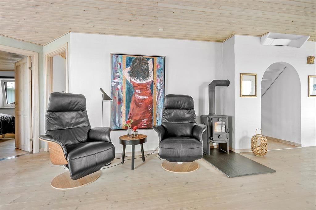 Dein schönes, überaus ansprechendes Ferienhaus begrüßt dich mit einem Maximum an Komfort und einer geschmackvollen Einrichtung. Es beinhaltet zwei Wohnräume. Der im Erdgeschoss platzierte Wohnraum ist offen mit dem schönen Essbereich und der tollen Küche verbunden, in der zwei Backöfen und zahllose Kochutensilien das Herz eines jeden Hobbykochs höher schlagen lassen. Im Wohnraum wirst du mit einem Kaminofen und einer hervorragenden Aussicht auf das Meer verwöhnt. Durch die Terrassentür trittst du hinaus auf die Terrasse und in den Garten. Im Obergeschoss steht ein weiterer Wohnraum zur Verfügung. In diesem Raum verbringst du viele gemütliche und entspannte Stunden im Kreise deiner Lieben. Mit deinem Lieblingsgetränk in der Hand kannst du in diesem schönem Raum LPs auf dem Schallplattenspieler hören, die Beine hochlegen und dich von der fantastischen Aussicht in den Bann ziehen lassen. In den schönen Schlafräumen laden gute Betten zu erholsamen Nächten ein. Alternative Schlafmöglichkeiten verspricht das schöne Nebengebäude, das wie ein separates kleines Ferienhaus wirkt und sich direkt neben der Saunatonne und dem Kaltwasserzuber befindet. Im Erdgeschoss steht ein attraktives Badezimmer zur Verfügung. Das Obergeschoss beinhaltet praktischerweise ein Gäste-WC. In diesem Ferienhaus erwarten dich in deinem Urlaub nur zwei Aufgaben - sorge dafür, dass zu jeder Zeit Eis für die Kinder im Gefrierschrank liegt und Wein für die Erwachsenen im Weinkühlschrank.