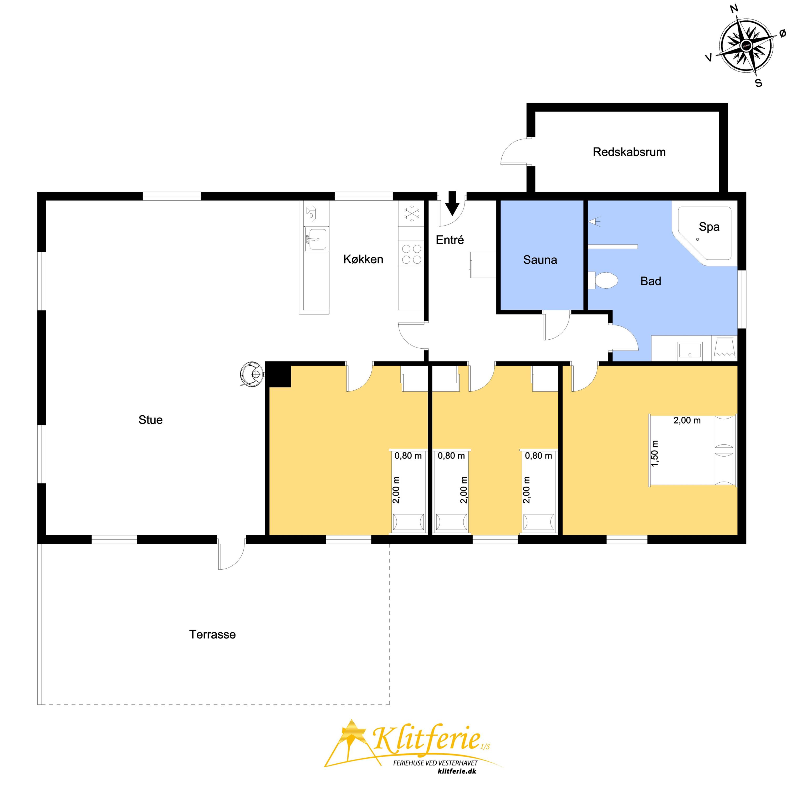 Das Haus hat einen Eingangsbereich mit Garderobe. Von dort habt ihr Zugang zur Sauna und einem Badezimmer mit Duschkabine, Whirlpool und Waschmaschine. Vom Eingangsbereich gelangt ihr außerdem in ein Schlafzimmer mit Doppelbett sowie in ein Zimmer mit zwei Einzelbetten. Vom Küchenbereich aus kommt ihr in das dritte Schlafzimmer mit kleinem Klapptisch und einem Daybed, das sich leicht in ein komfortables Einzelbett verwandeln lässt. Alle Schlafzimmer sind mit neuen Betten und großzügigem Stauraum ausgestattet. Küche und Wohnzimmer sind offen gestaltet und hell und gemütlich eingerichtet. Das Wohnzimmer verfügt über Polstermöbel und einen wandmontierten Kaminofen, der für zusätzliche Wärme und Gemütlichkeit sorgt. Vom Wohnzimmer aus gelangt ihr direkt auf die nach Süden und Westen ausgerichtete Terrasse, auf der ihr die Sonne genießen könnt. Die frisch gestrichene Decke verleiht dem Raum eine helle und frische Atmosphäre.