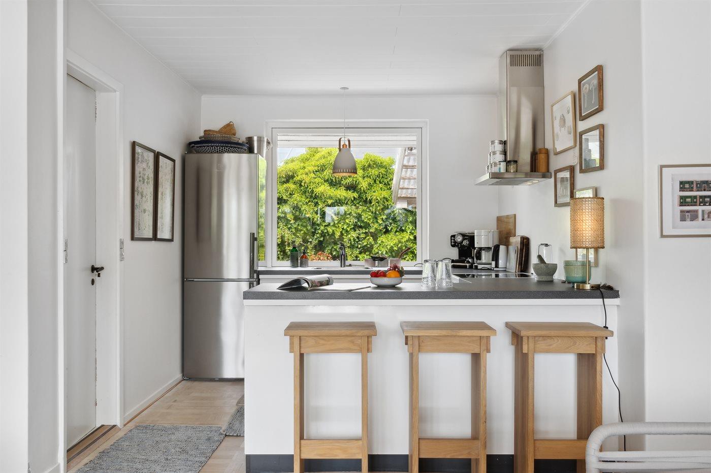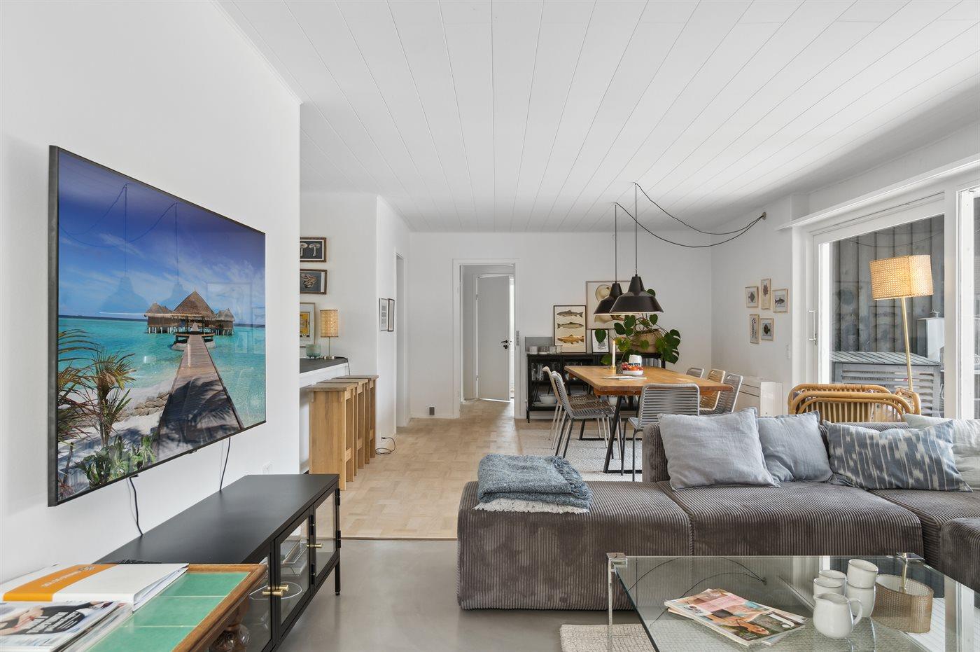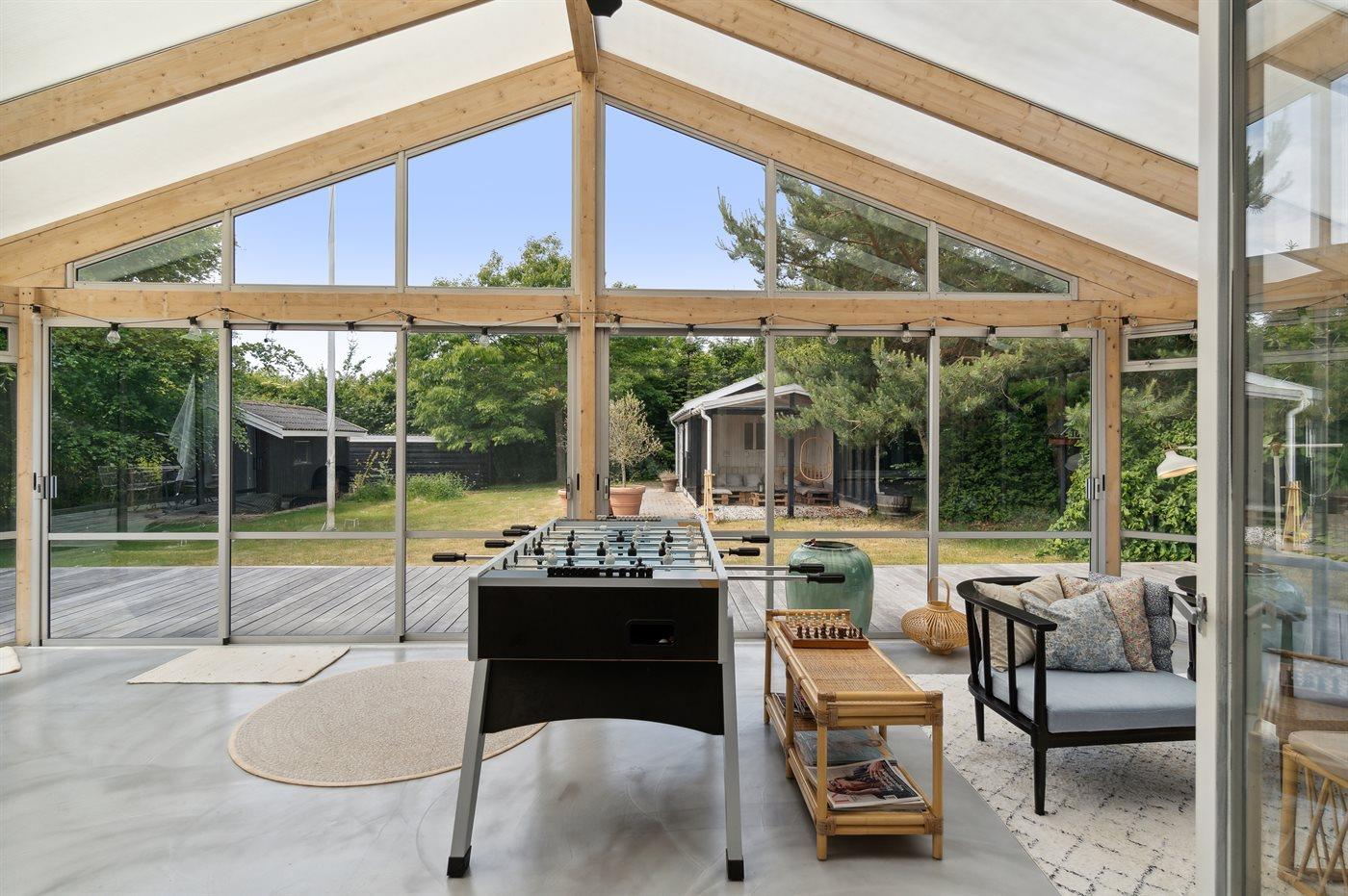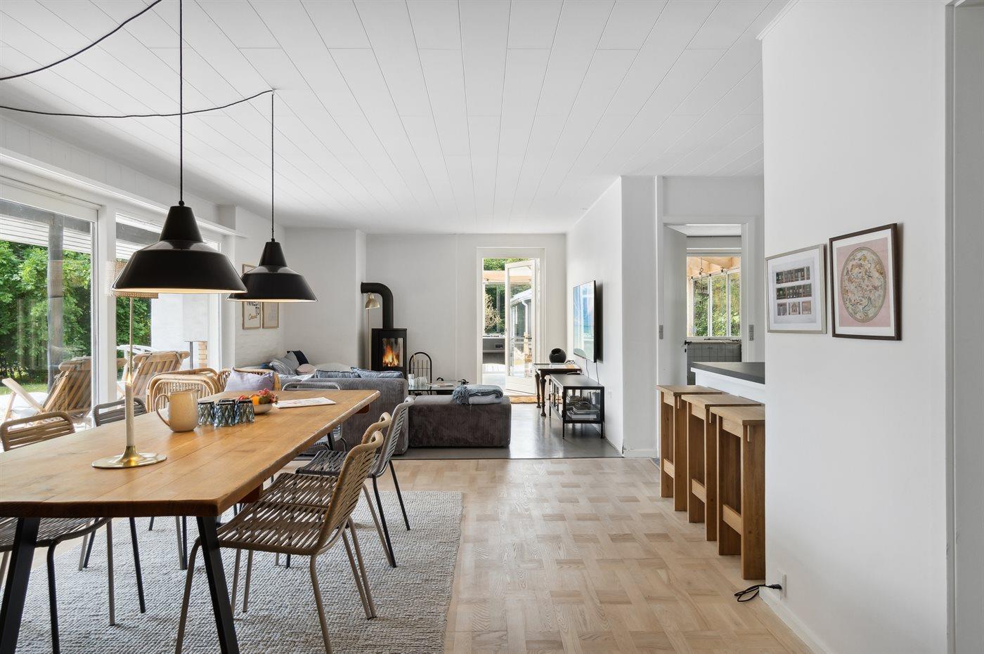 Ein schön gelegenes Ferienhaus mit weniger als 300 m zum Strand. Das Haus ist sehr geräumig, 2021 modernisiert und tritt hell und funktionell hervor. Vom Wohnzimmer und der Wohnküche aus gibt es Zugang zu den großen und ungestörten Terrassenflächen, die zum Teil überdacht sind und wo ein Außenkamin zur Verfügung steht.