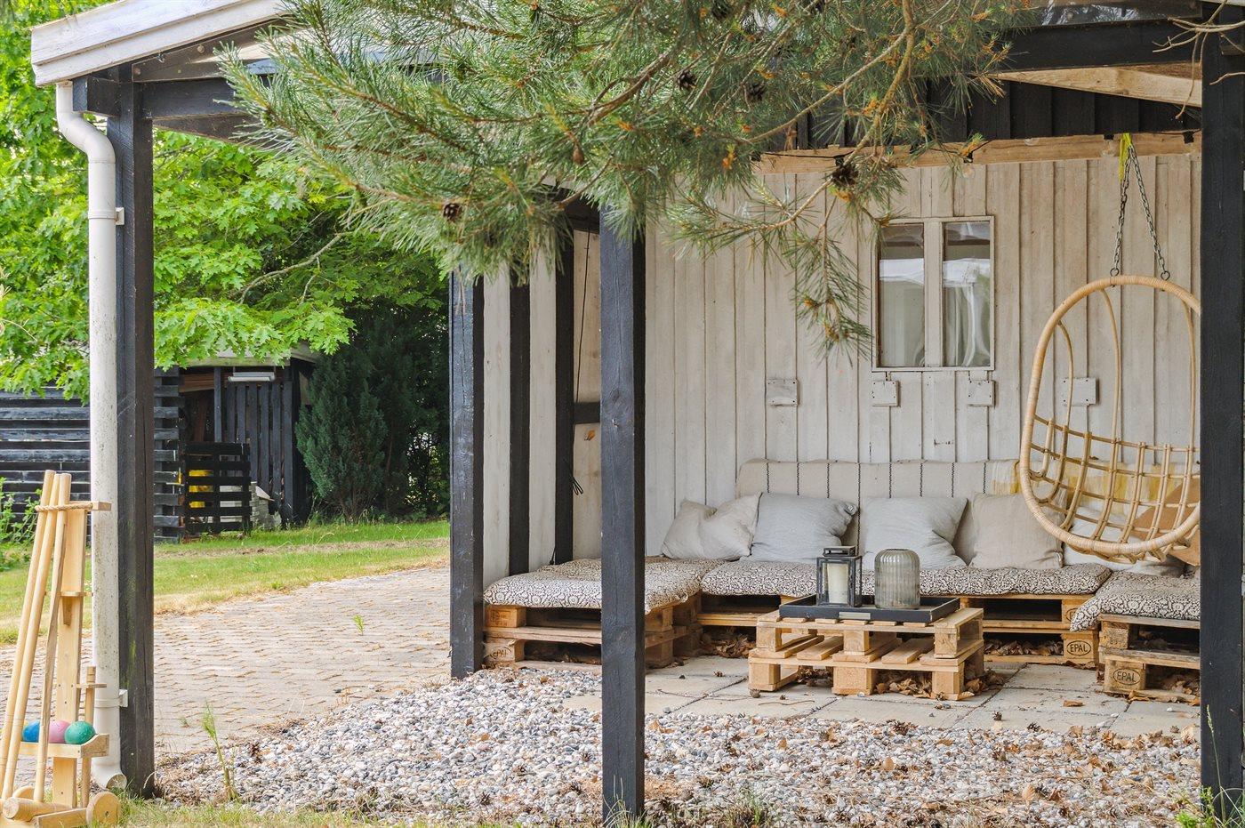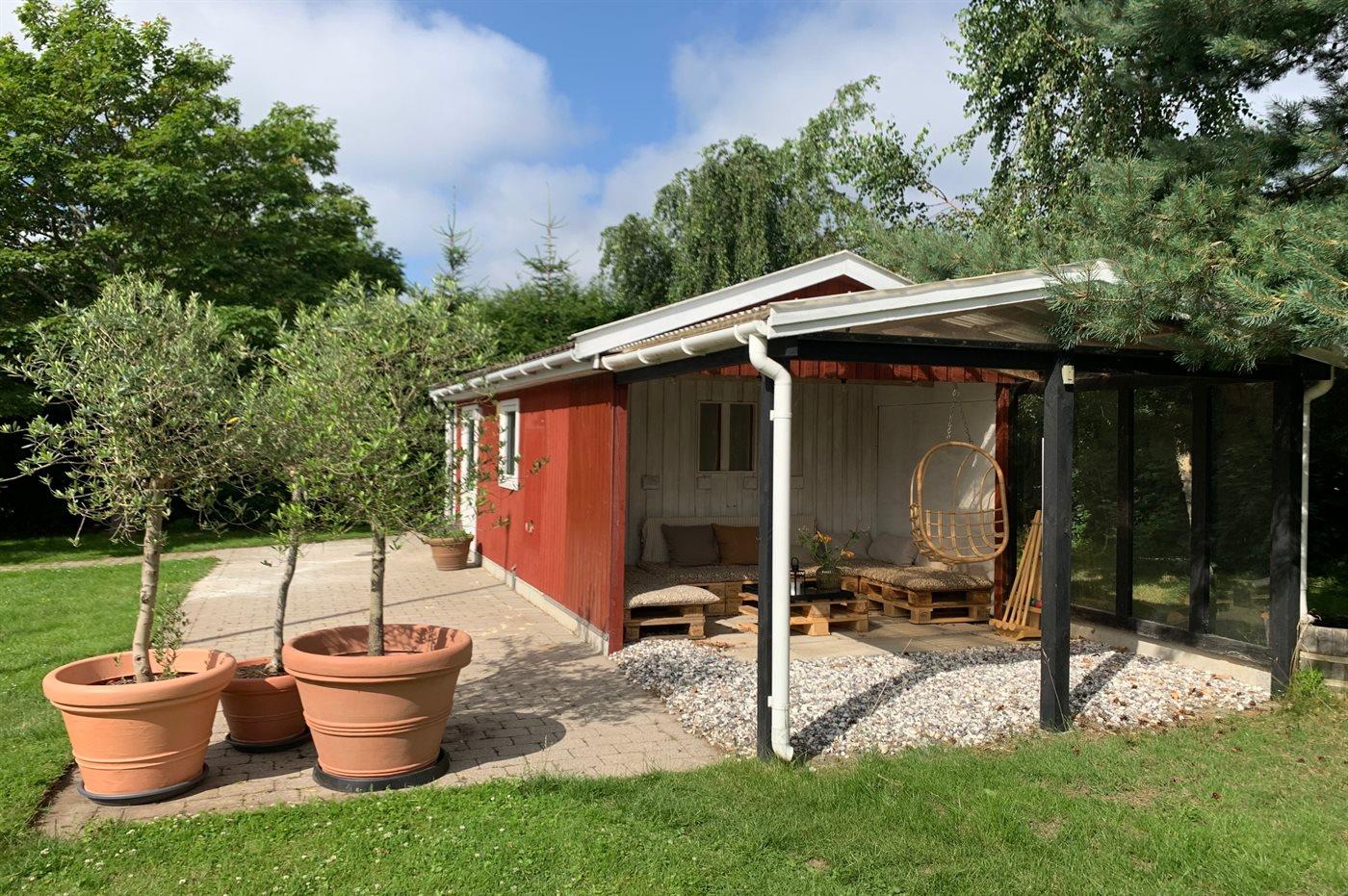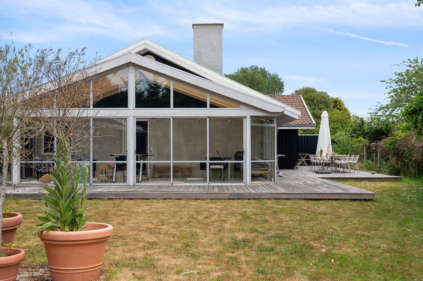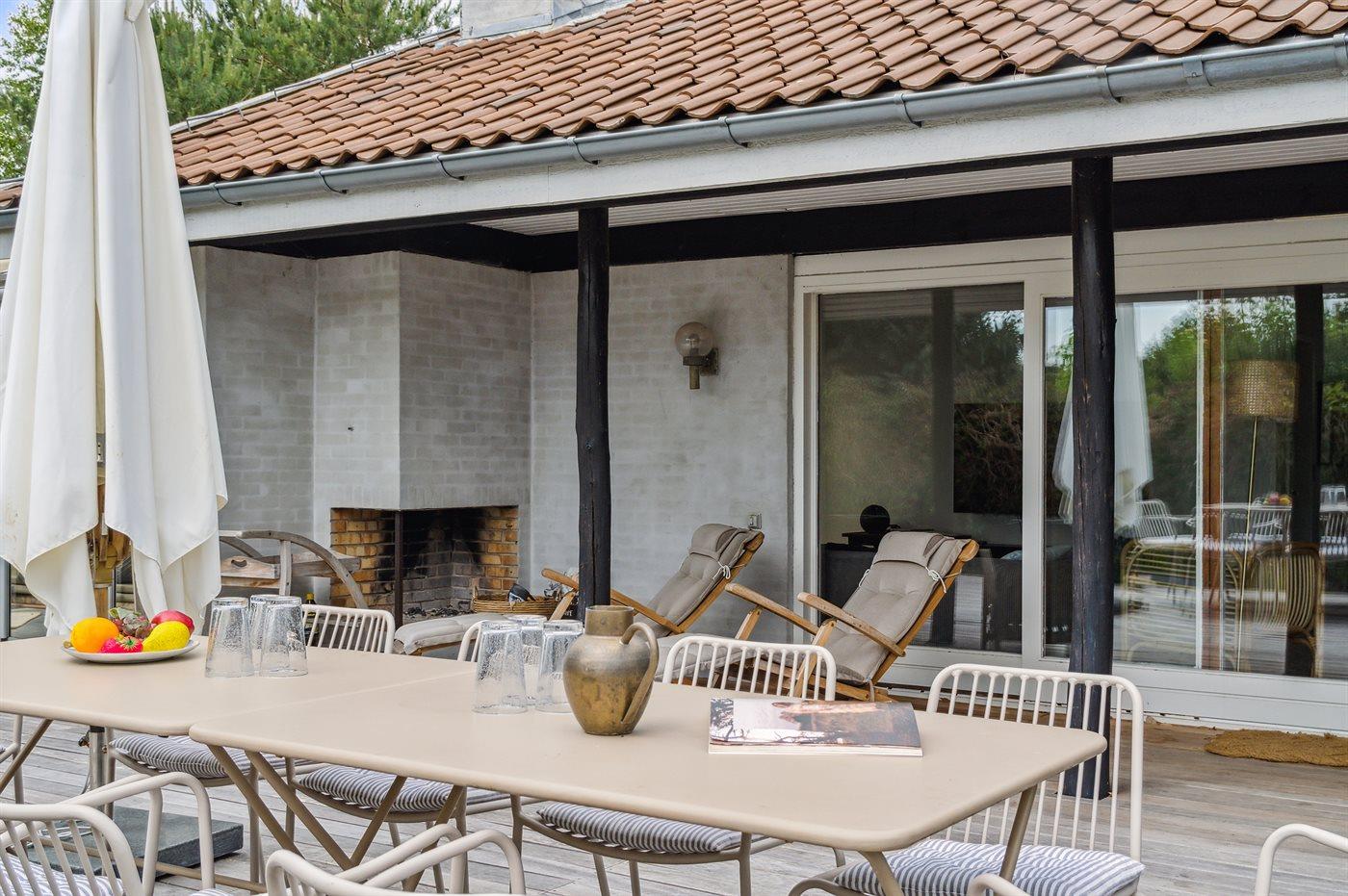 Modernisiertes Ferienhaus in Vejby Strand, nahe am Strand, mit großer Terrasse und Außenkamin.
