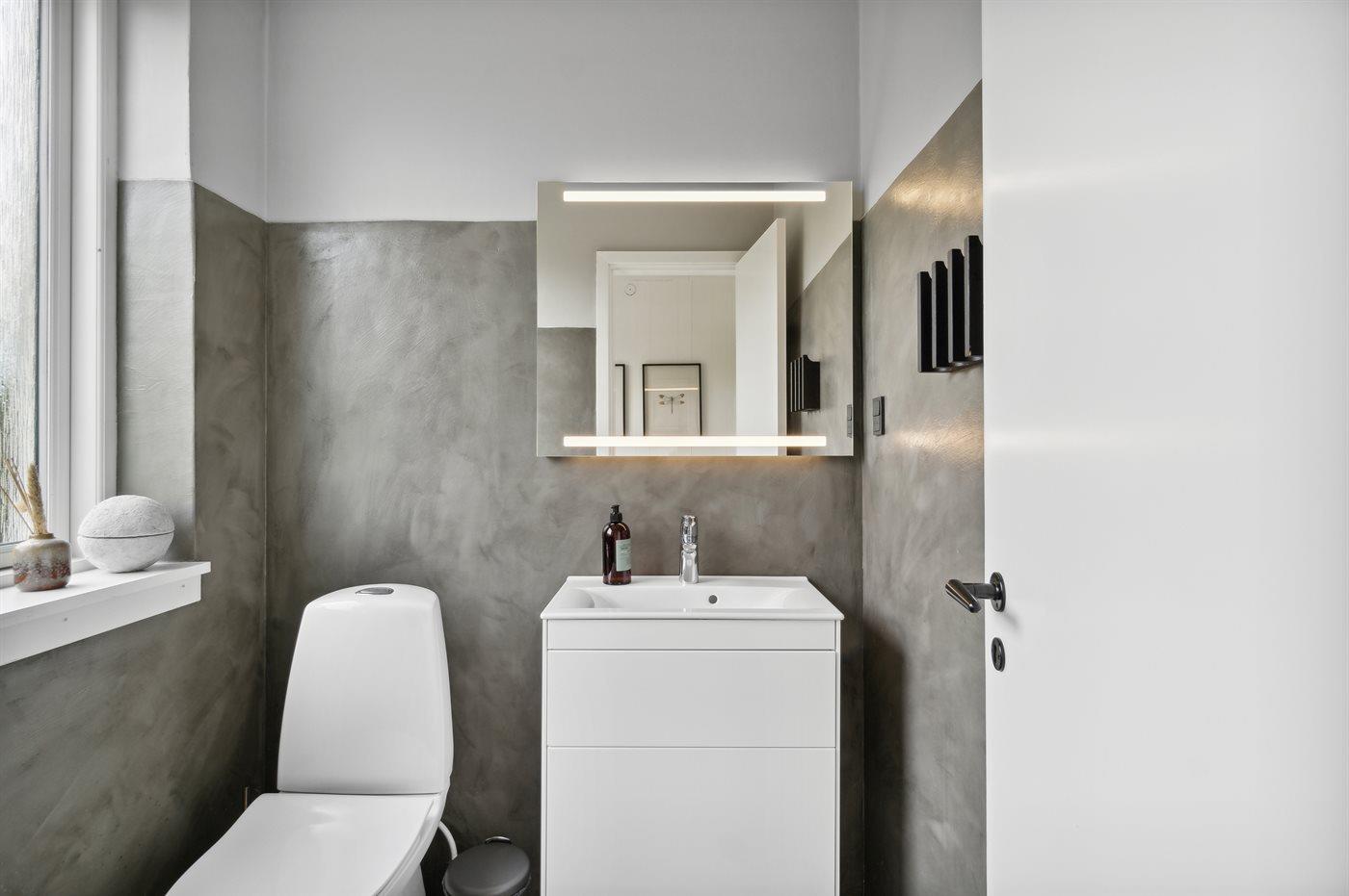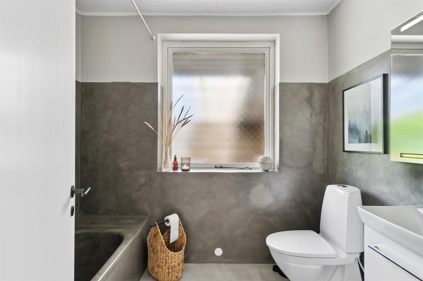 Es gibt 1 Badezimmer mit Fußbodenheizung, Toilette und Badewanne. Außerdem steht 1 Gästetoilette mit Fußbodenheizung zur Verfügung.