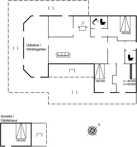 Übrigens: Die Spülmaschine des Hauses befindet sich im Hauswirtschaftsraum neben der Küche. Zum Haus gehört ein Gästehaus, das mit 2 der insgesamt 8 Schlafplätze eingerichtet ist.